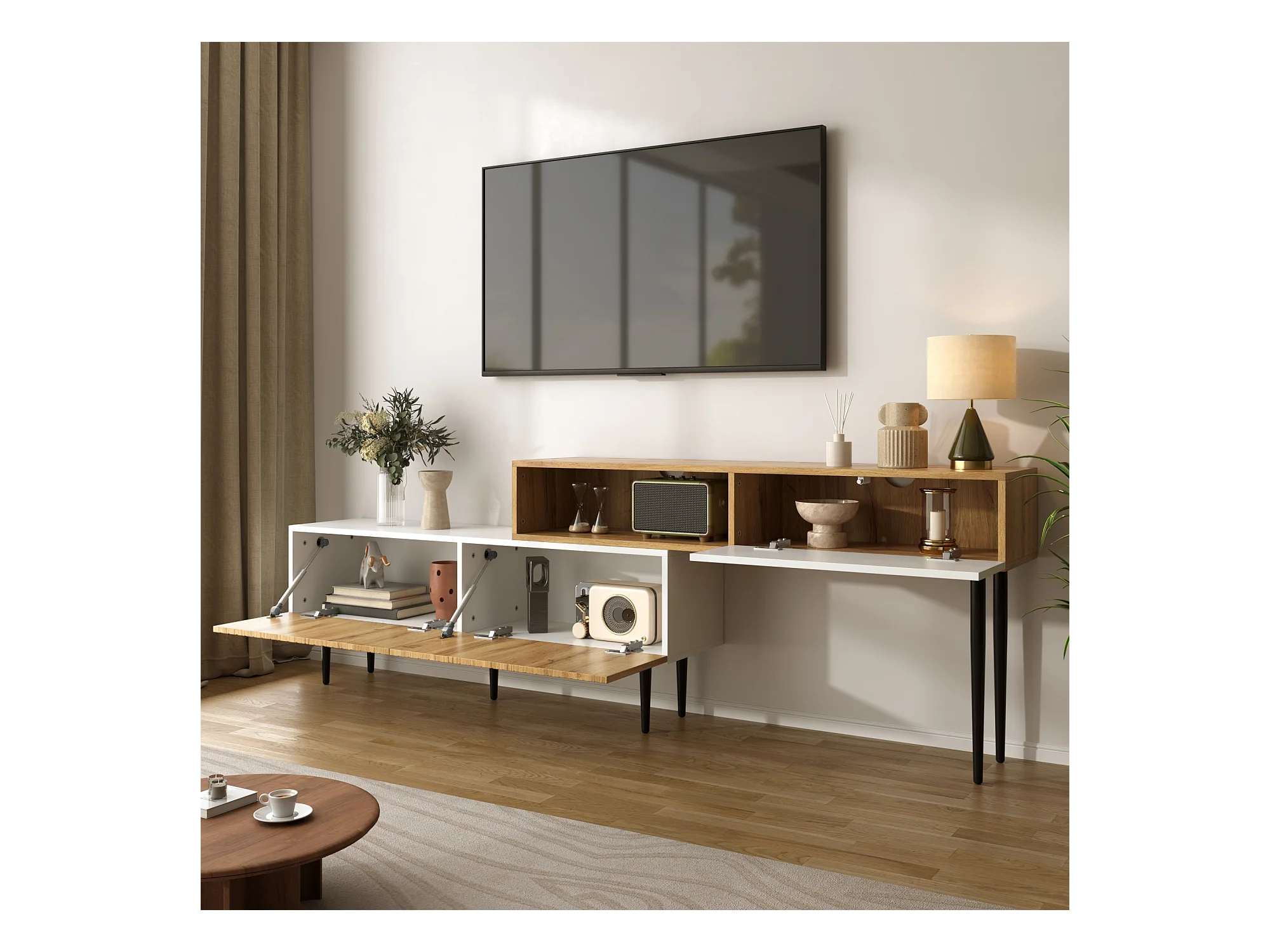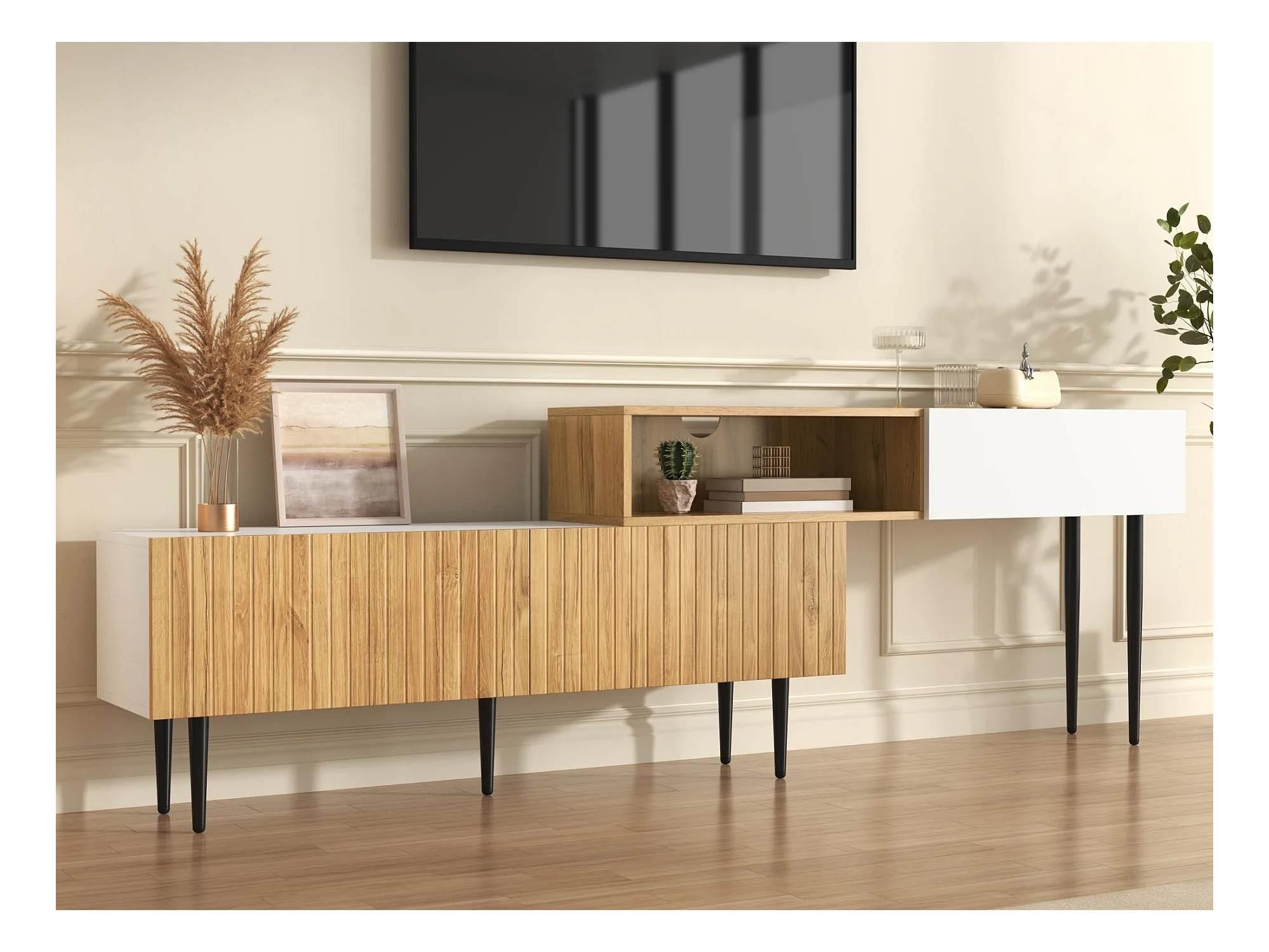Meuble TV 220x30x63.4 cm - design en deux parties - aspect bois - Blanc + naturel
