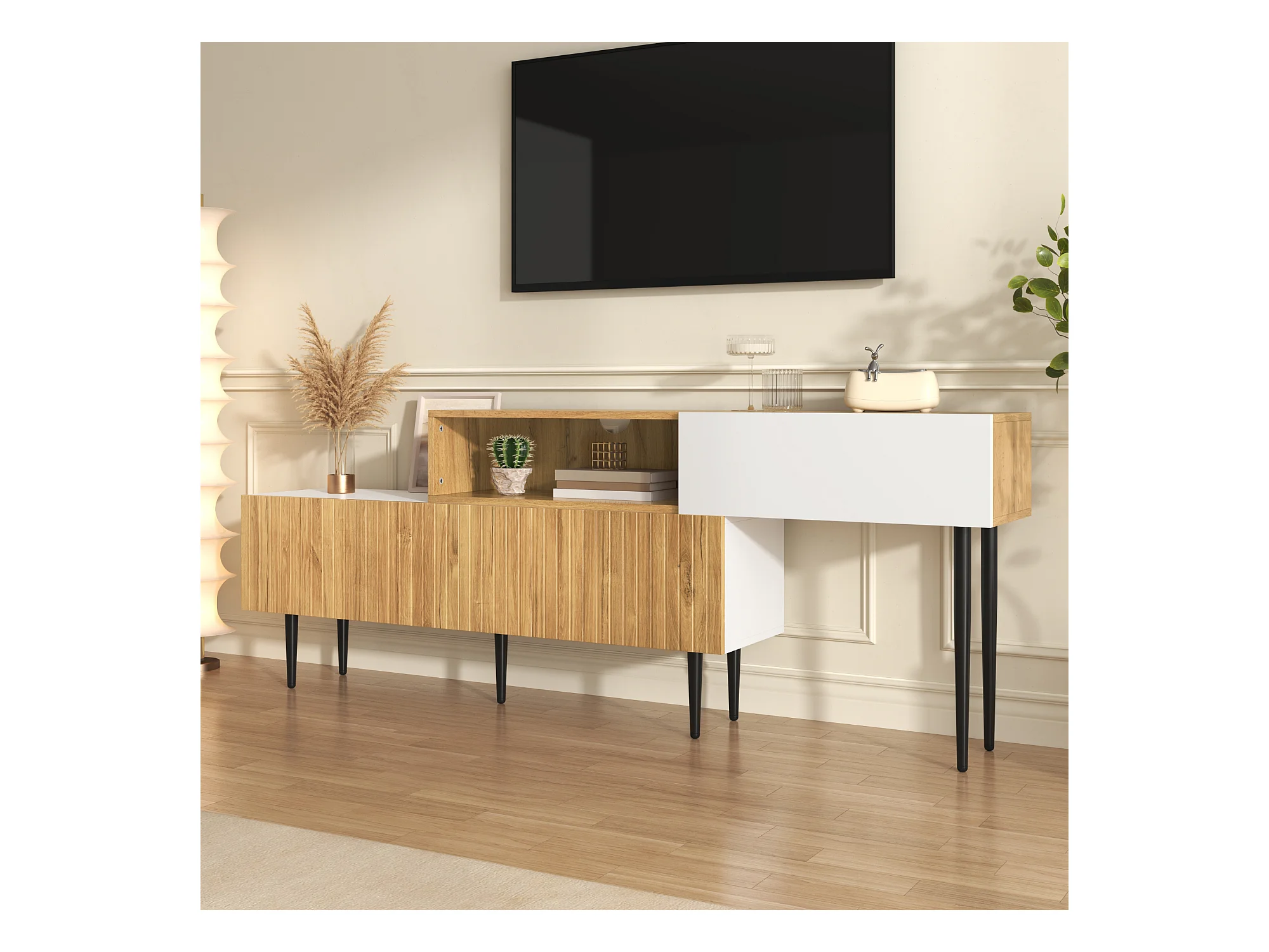Meuble TV 160cm - 1 porte、2 tiroirs et 4 compartiments - Naturel