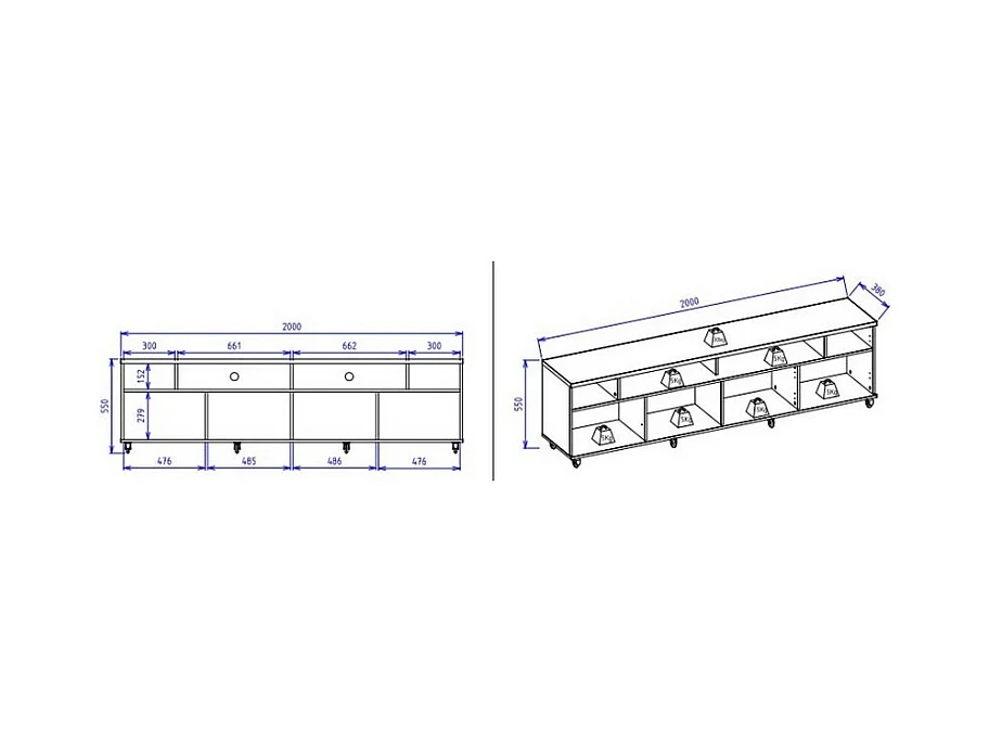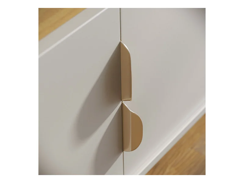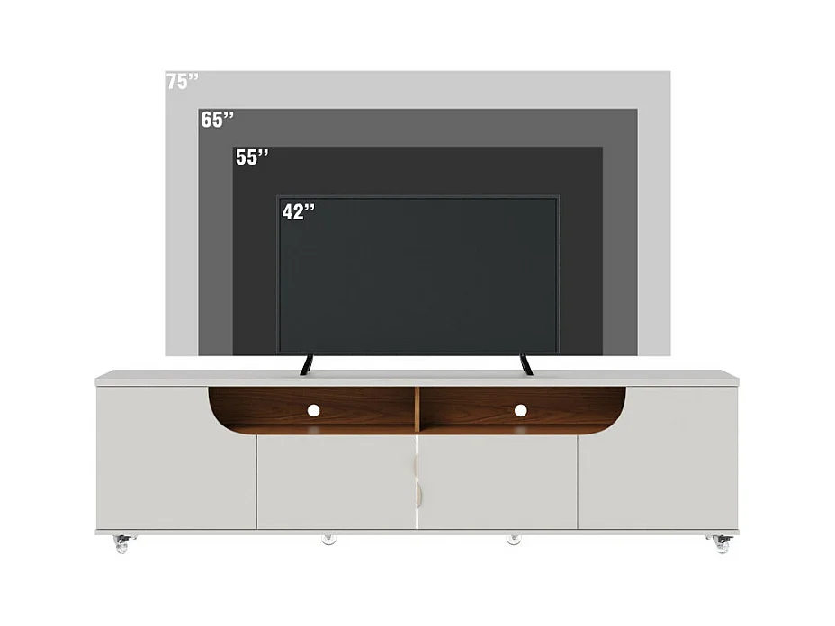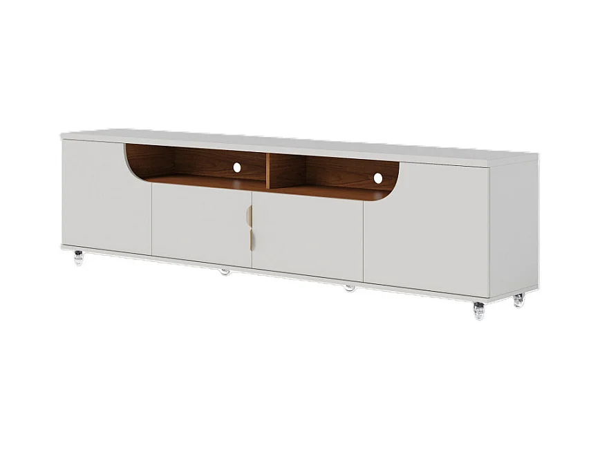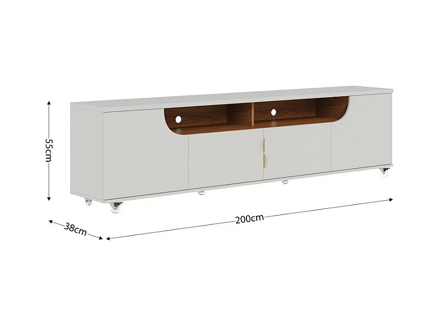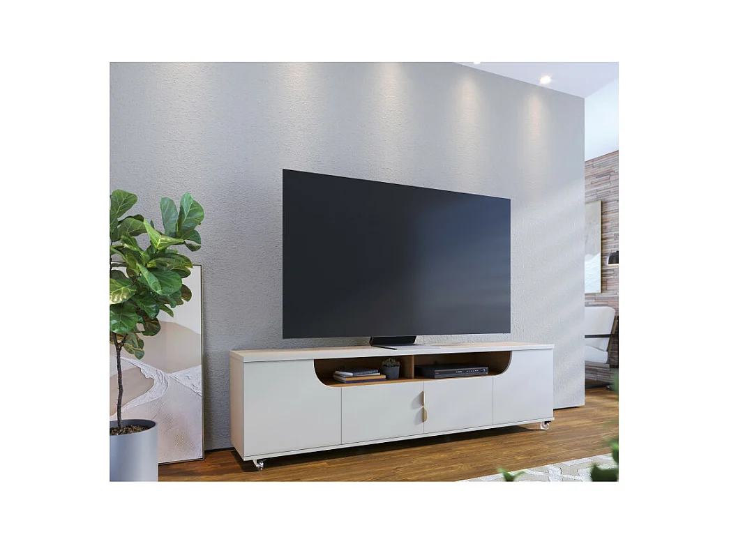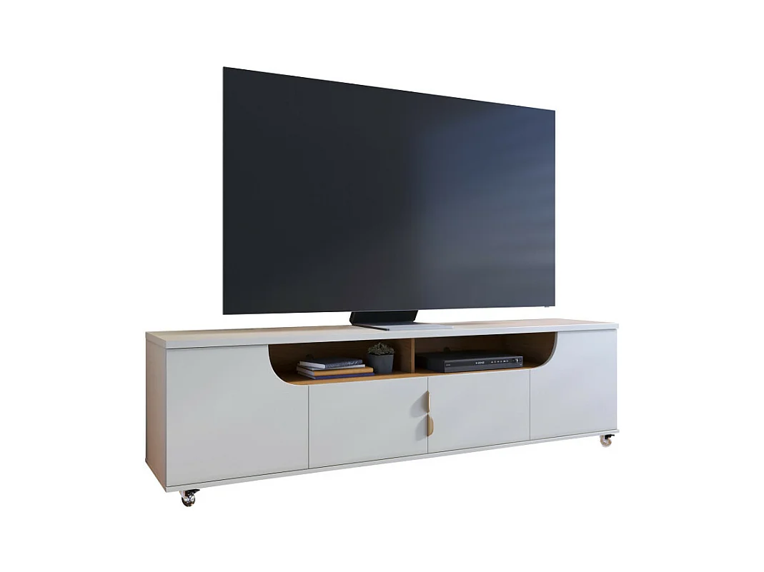 Meuble TV 75 Pouces Blanc et Chêne 4 Portes 8 Niches Roulettes L 200 H 55 P 38 cm