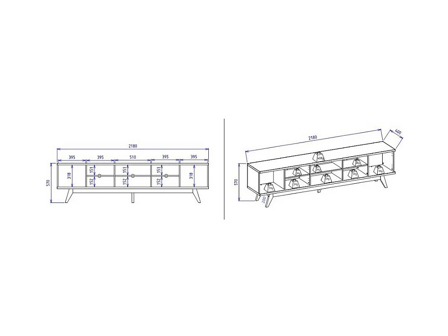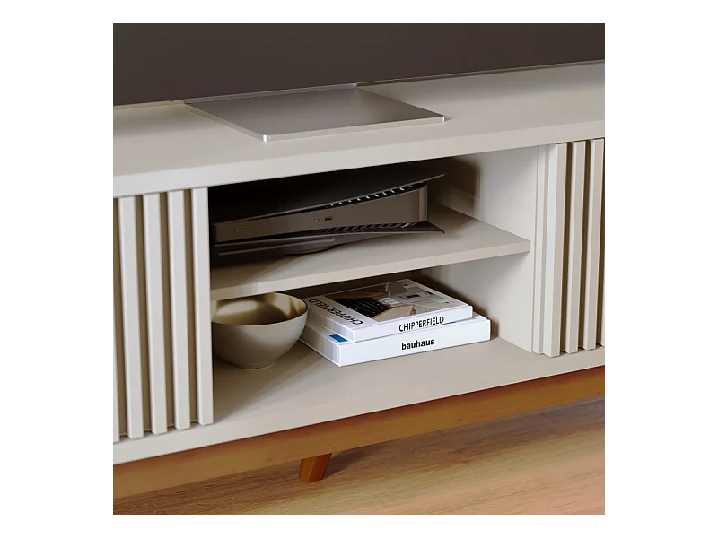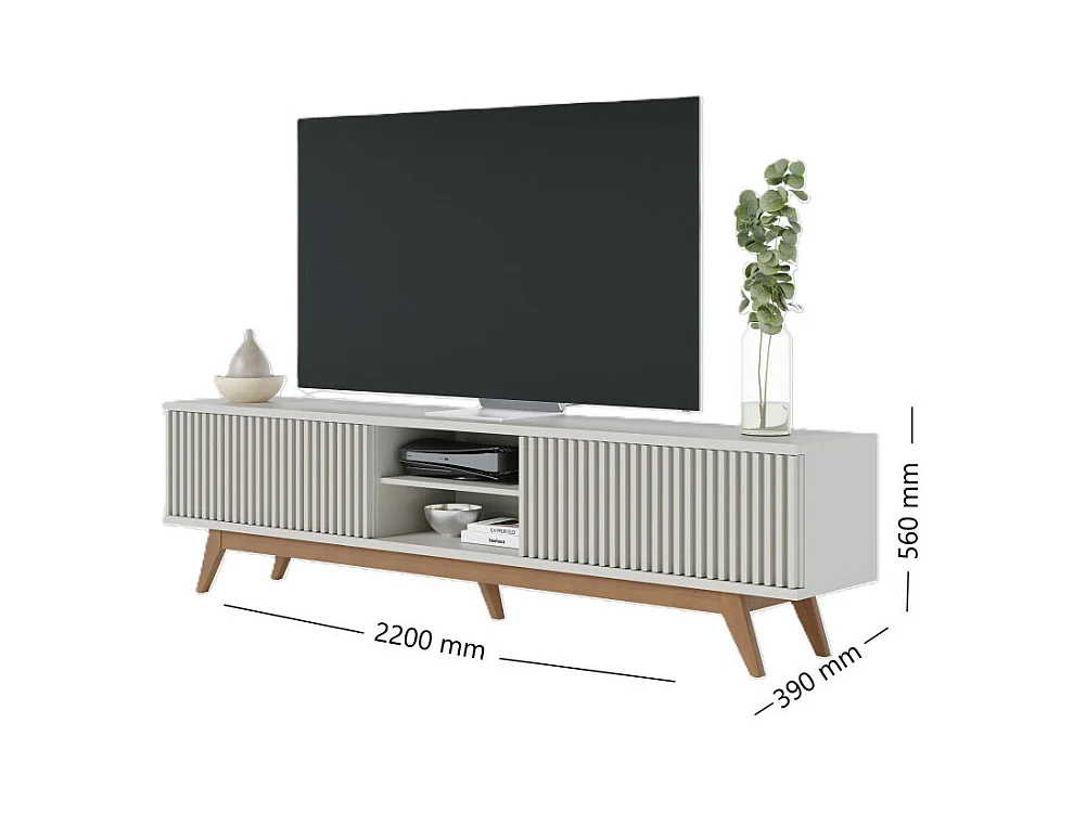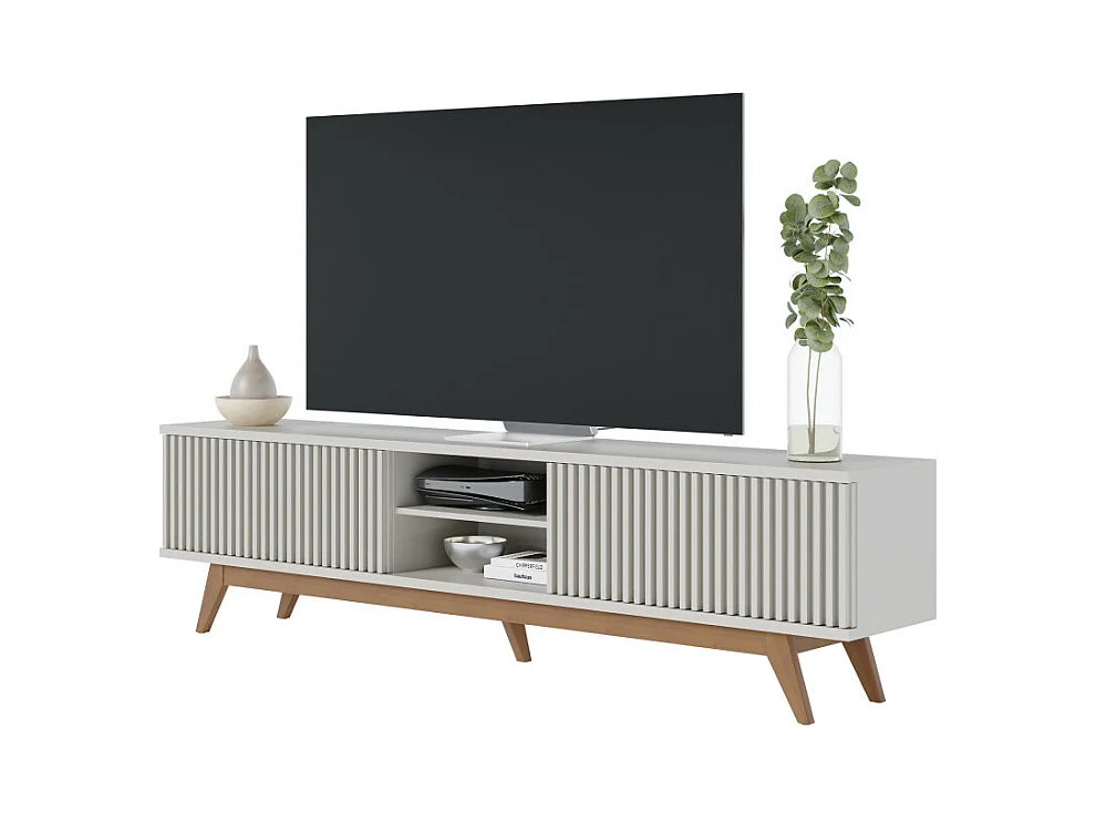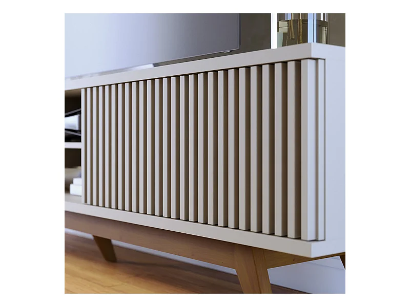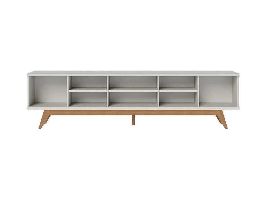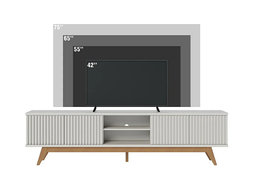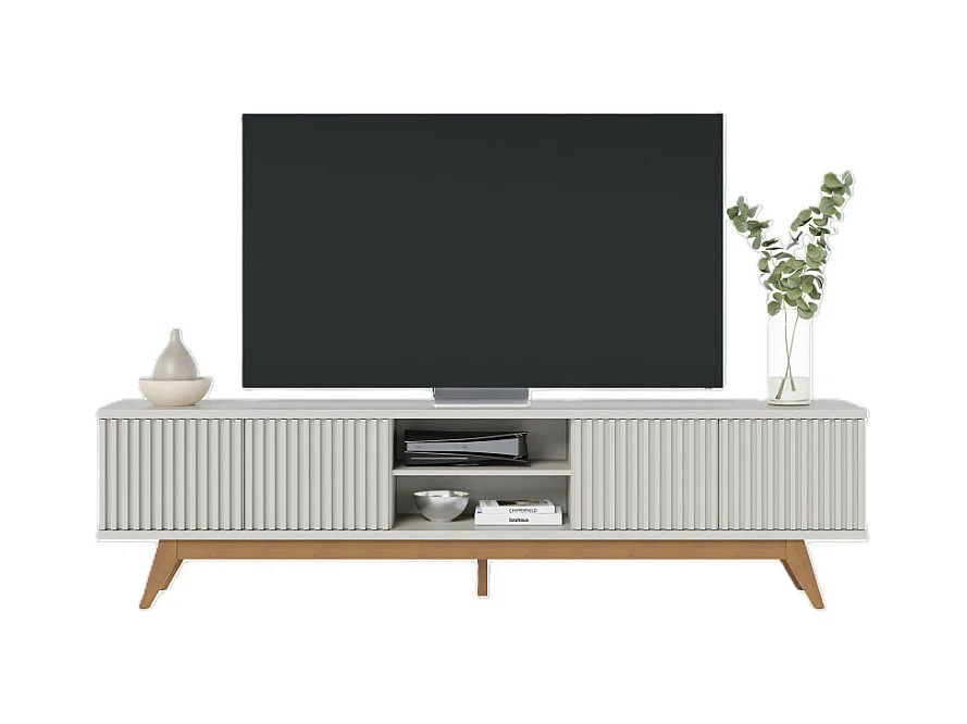 Meuble TV 75 Pouces Blanc Pieds Bois 4 Portes 8 Niches L 218 H 57 P 40 cm