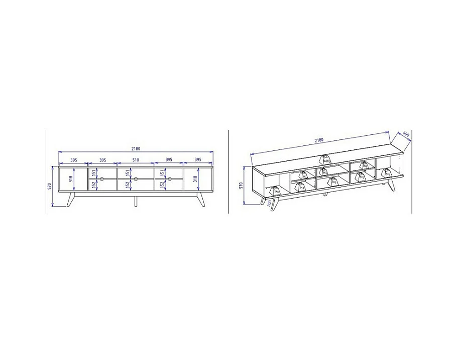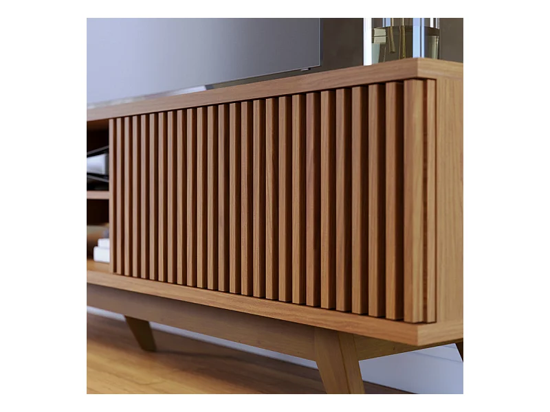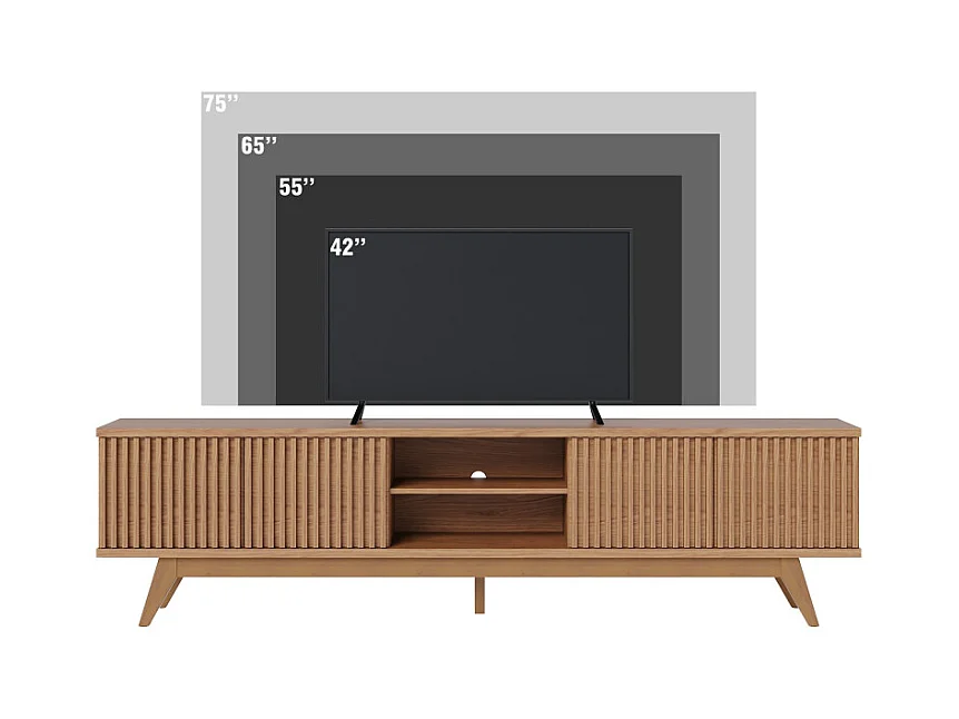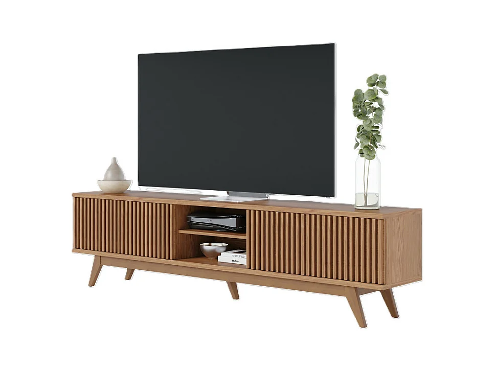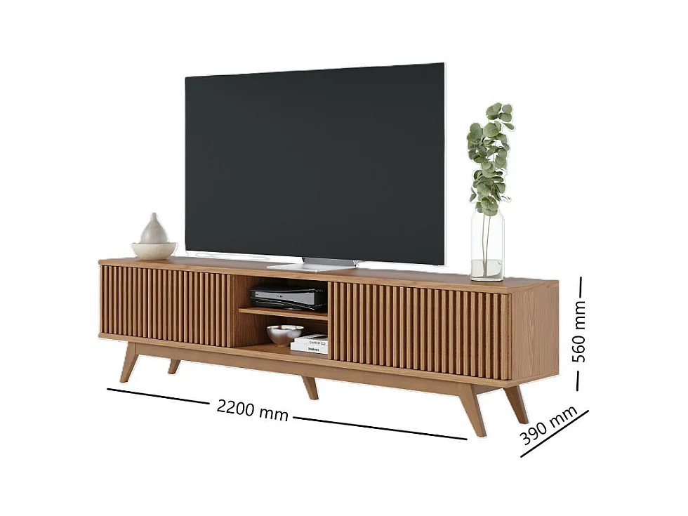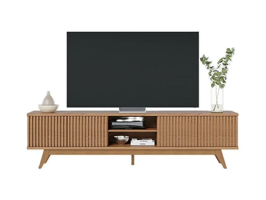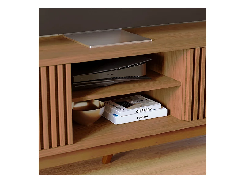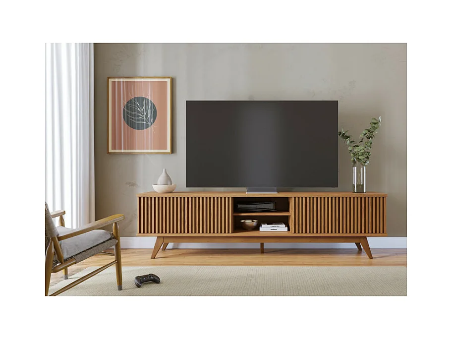 Meuble TV 75 Pouces Chêne Pieds Bois 4 Portes 8 Niches L 218 H 57 P 40 cm