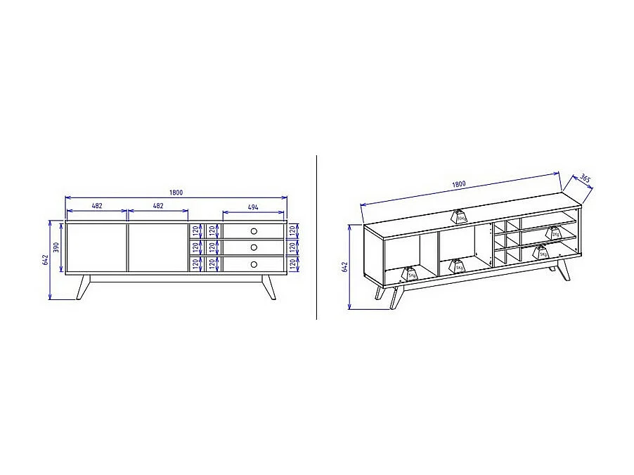 Meuble TV 75 Pouces Noir et Chêne Pieds Bois 2 Portes 11 Niches L 180 H 64.2 P 36.5 cm