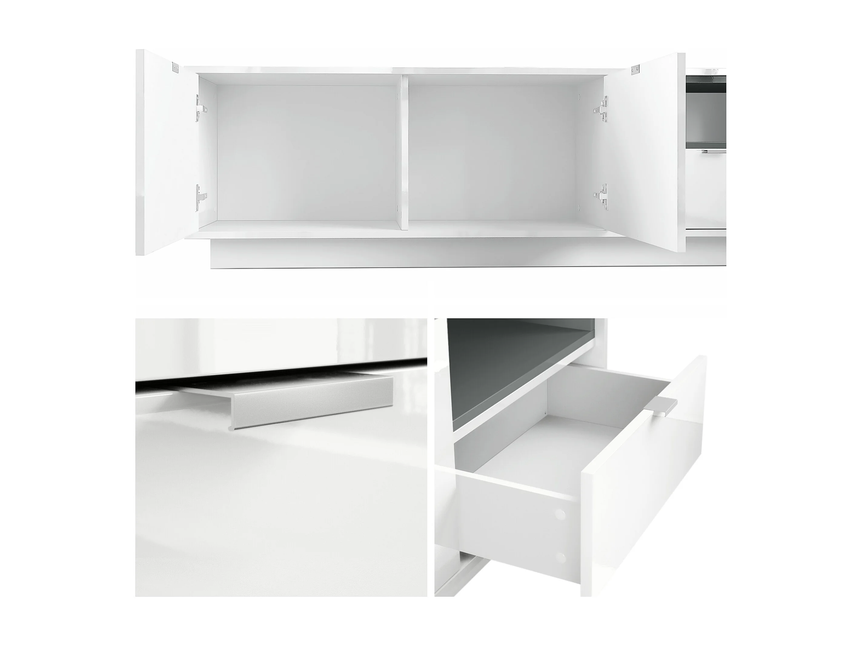 Meuble TV Armoire Metro, Corps en Blanc haute brillance / Façades en Blanc haute brillance avec une insertion en Mûre haute brillance, incl. L'éclairage LED
