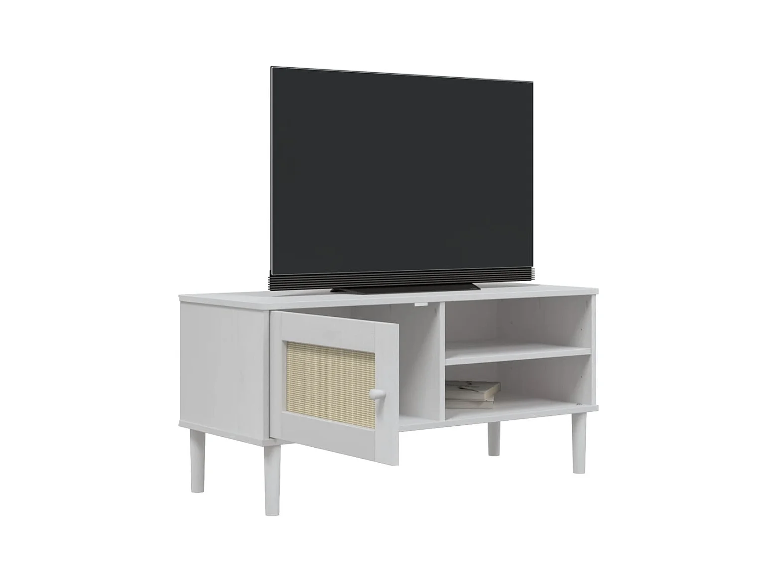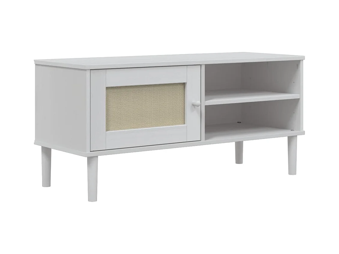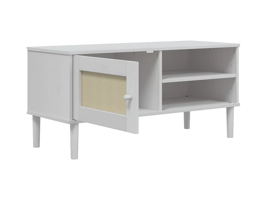 Meuble TV aspect rotin blanc 106x40x49cm bois massif pin