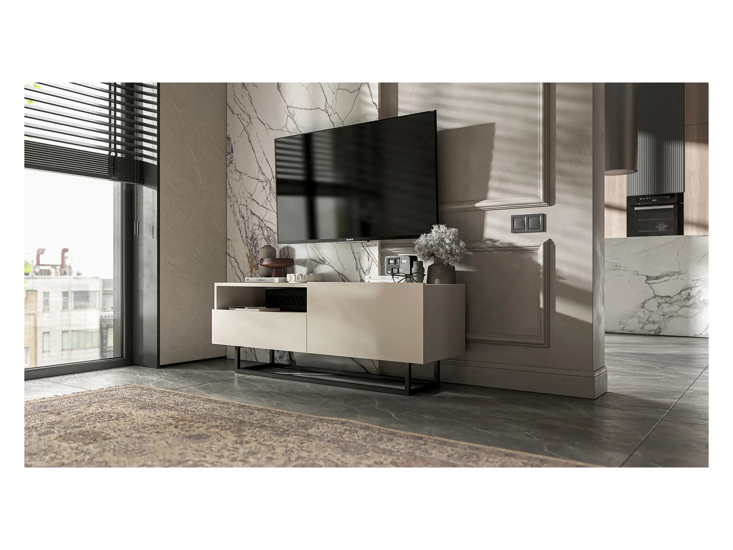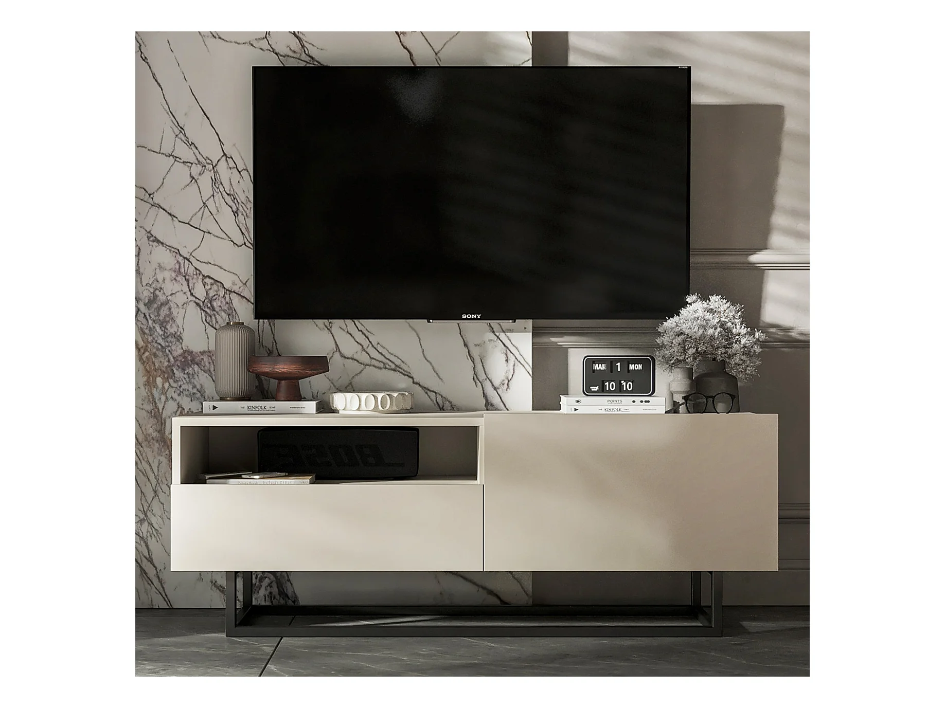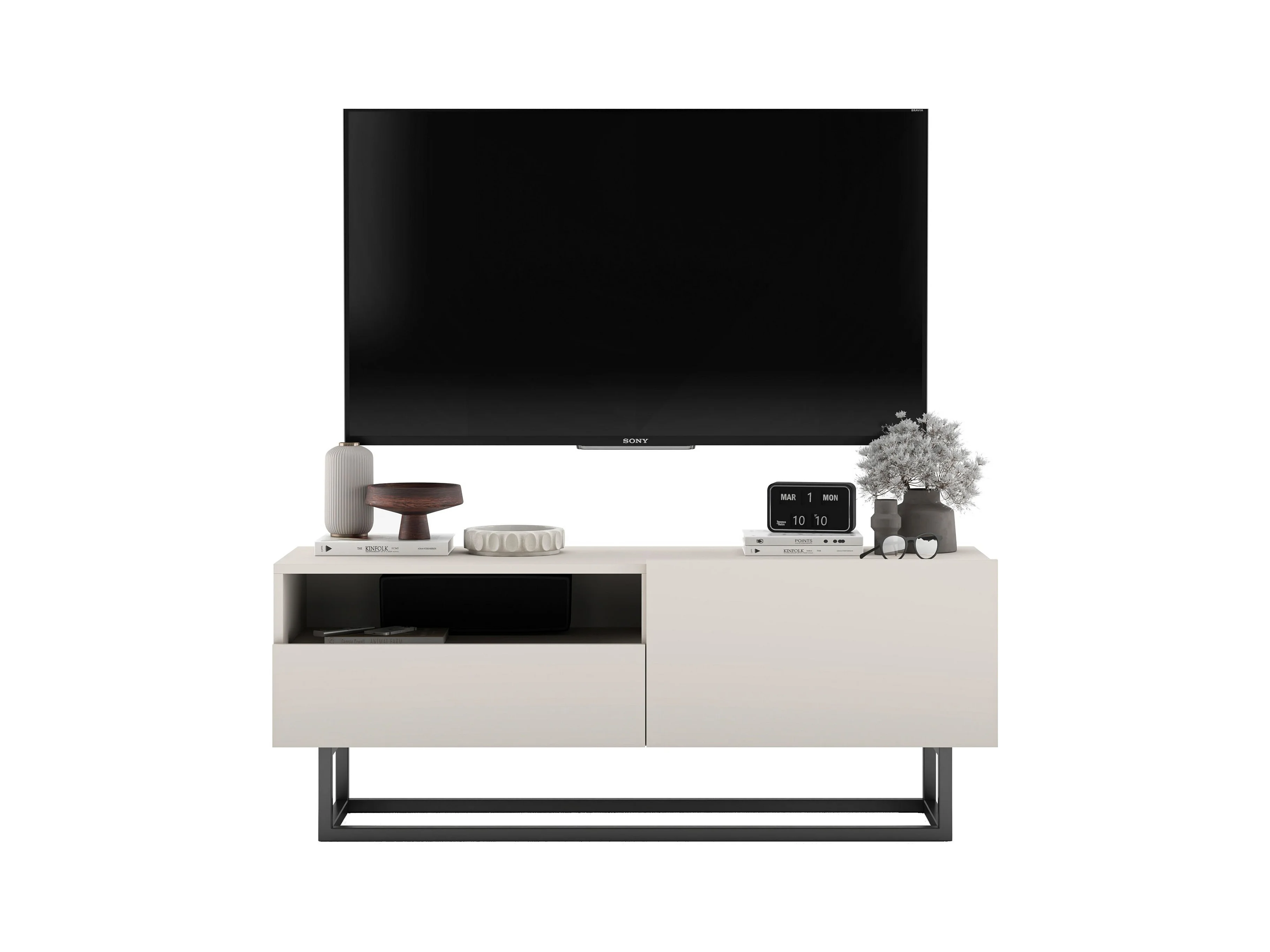 Meuble TV avec 1 portes et niche, tiroir - corps Cachemire mat, façades Cachemire mat - 120 cm, Cadre en métal noir