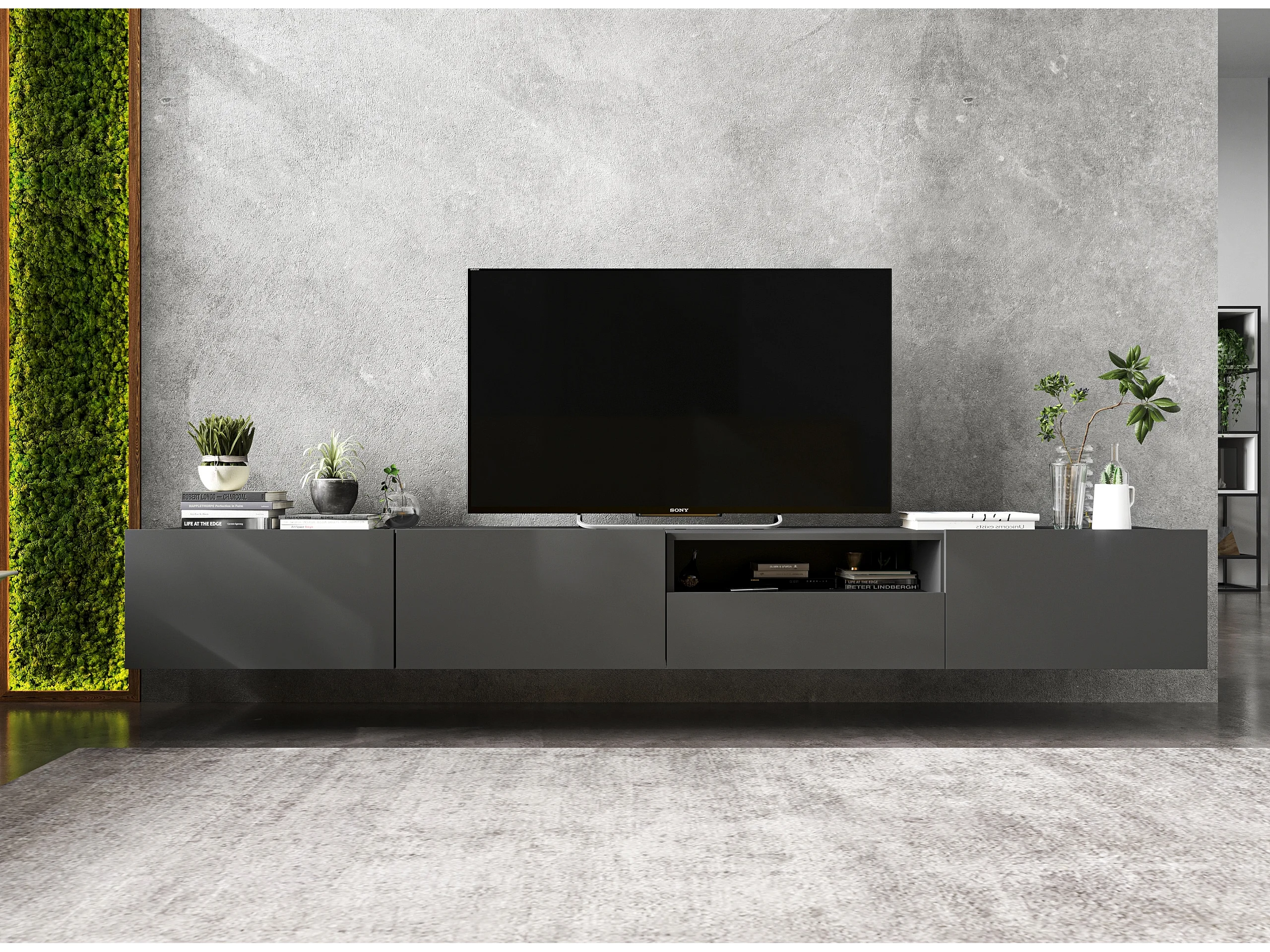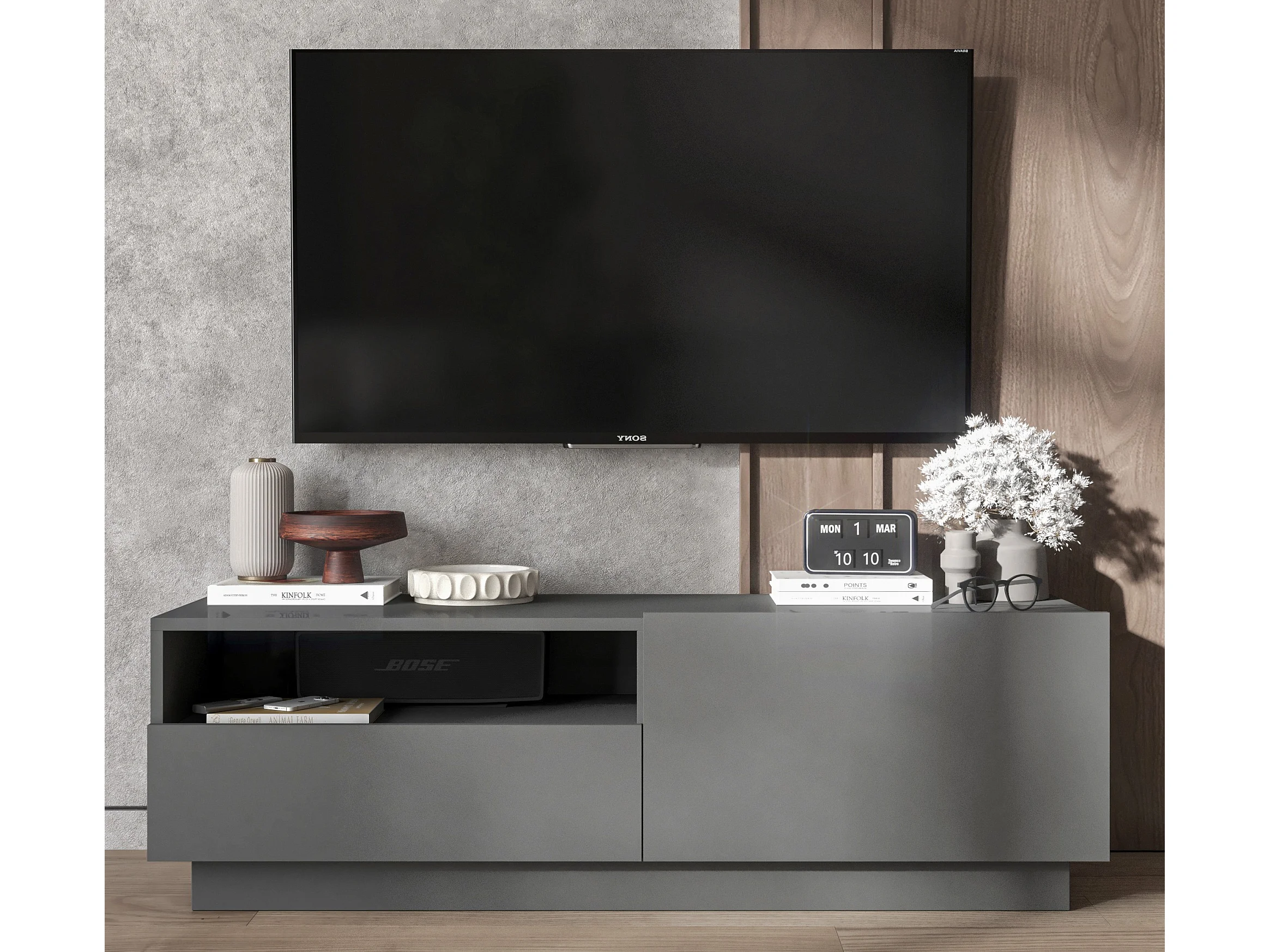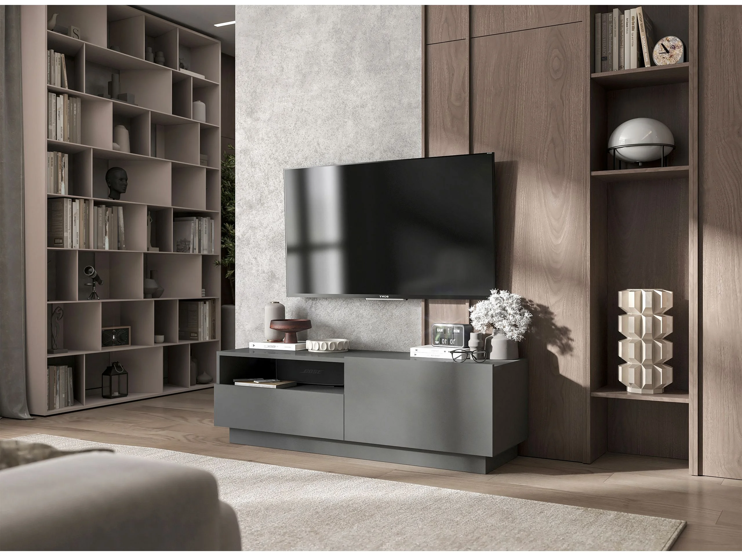 Meuble TV avec 1 portes et niche, tiroir - corps Graphite mat, façades Graphite mat - 120 cm, sur socle