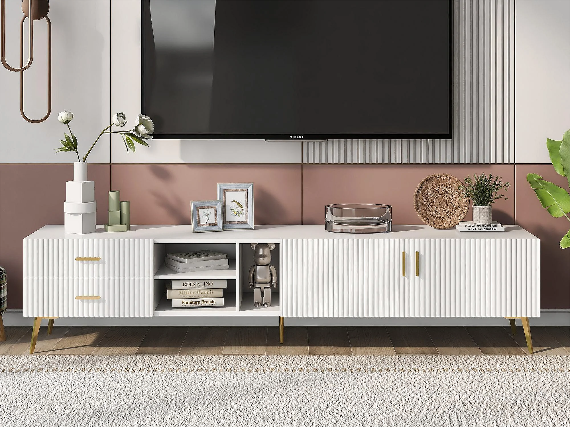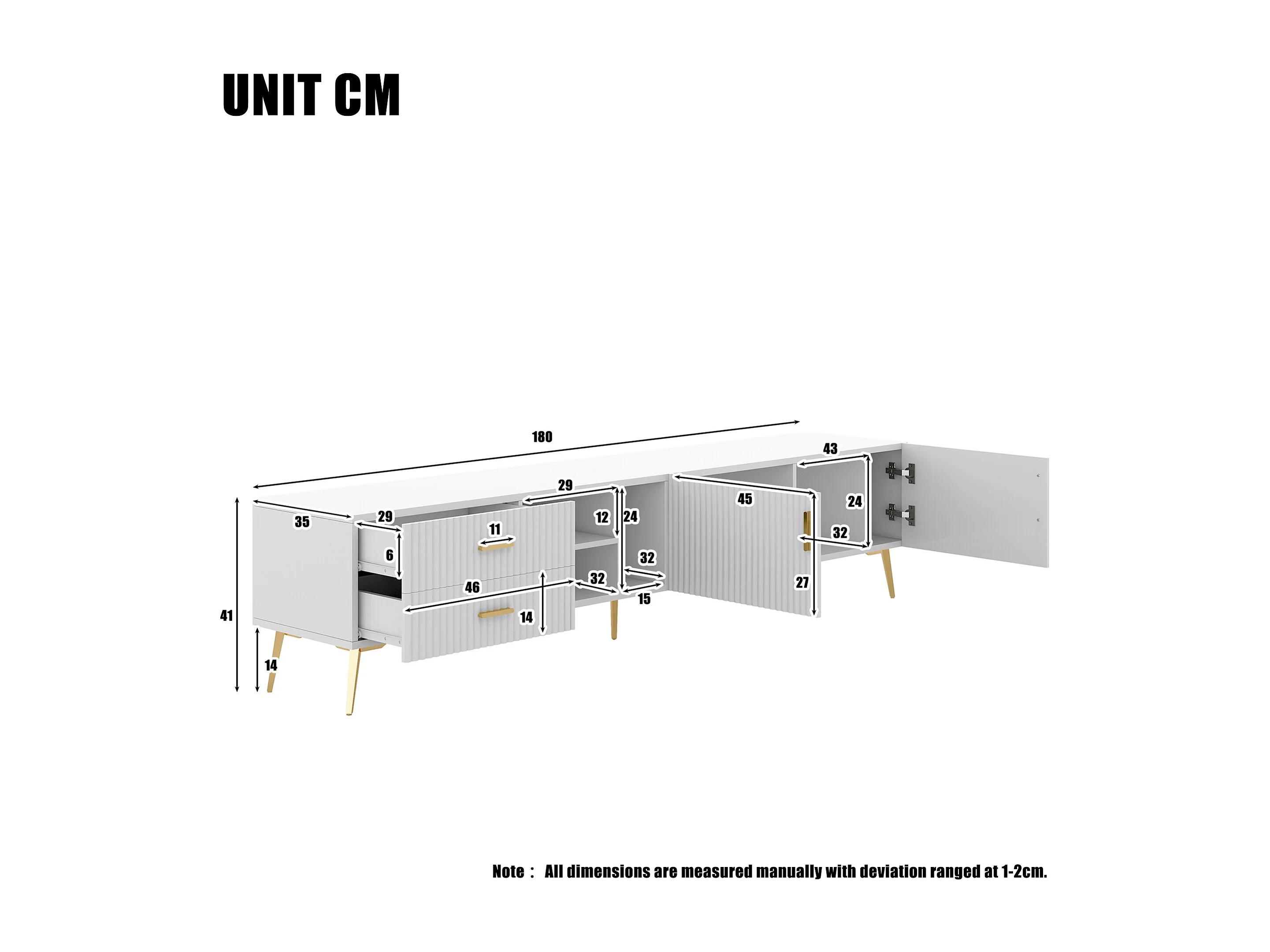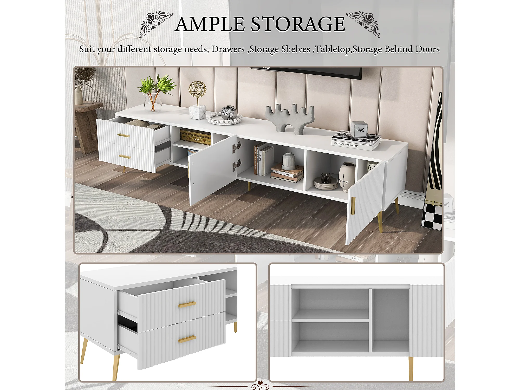 Meuble TV avec 2 portes, 2 tiroirs et 2 niches - MDF - pièds métallique - blanc
