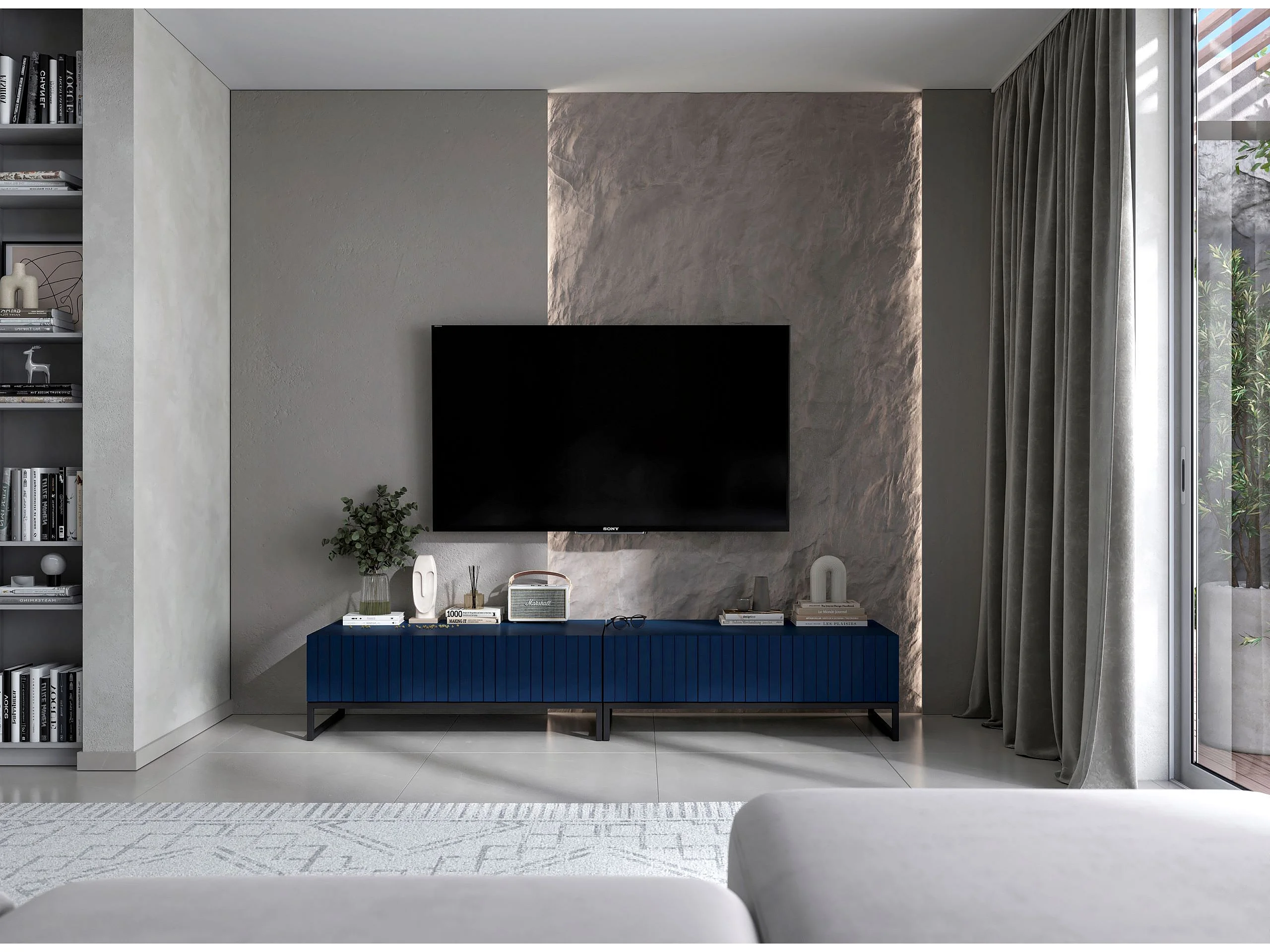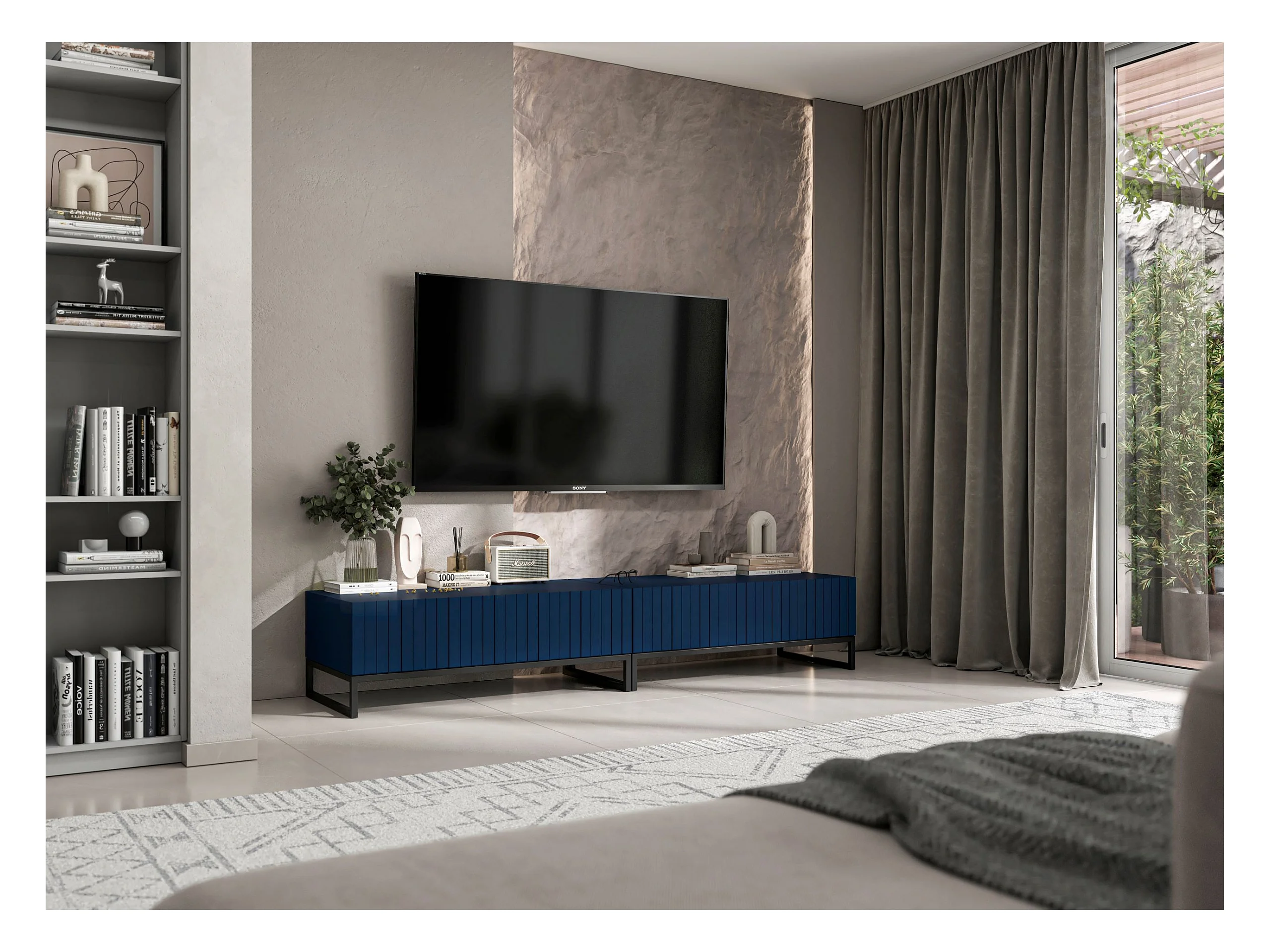 Meuble TV avec 2 portes - Corps Bleu marine mat, façades rainurées Bleu marine mat - 220 cm, Cadre en métal noir