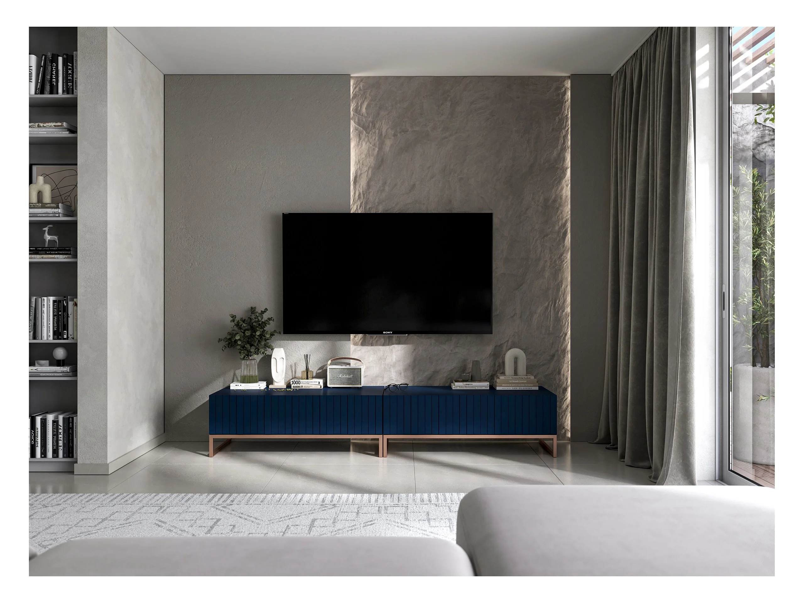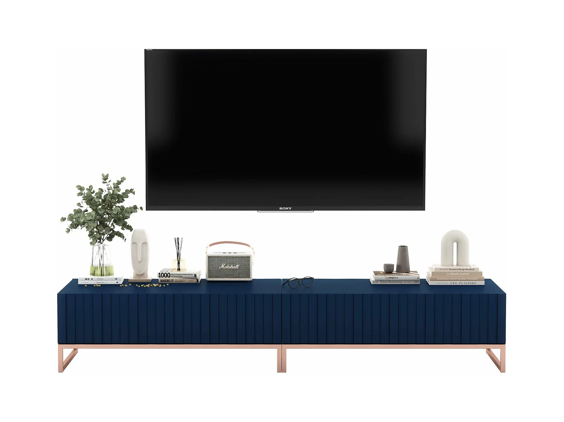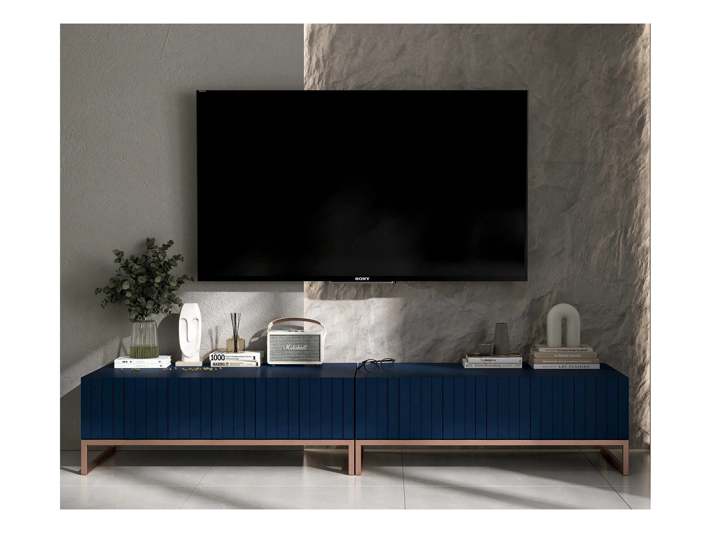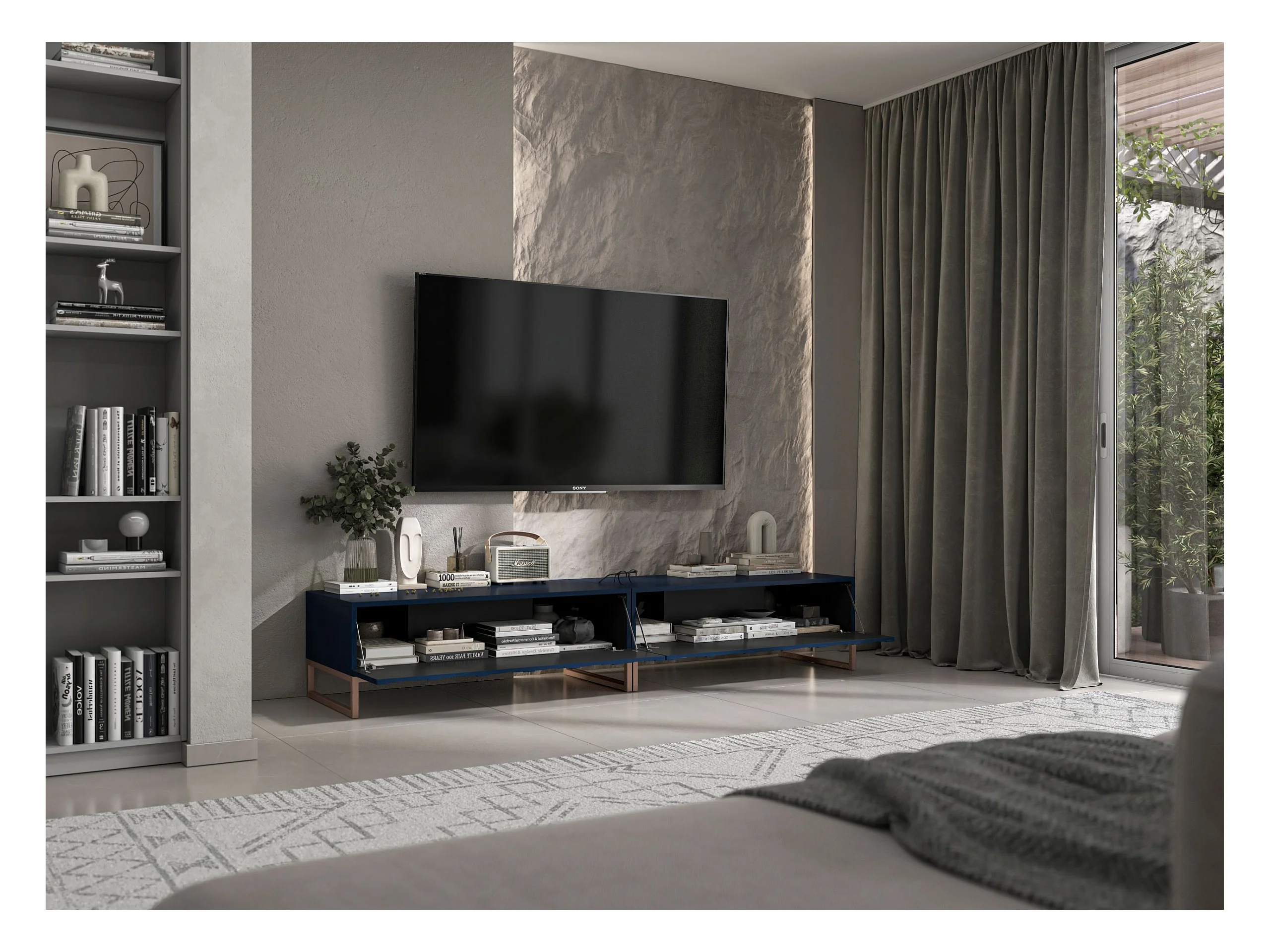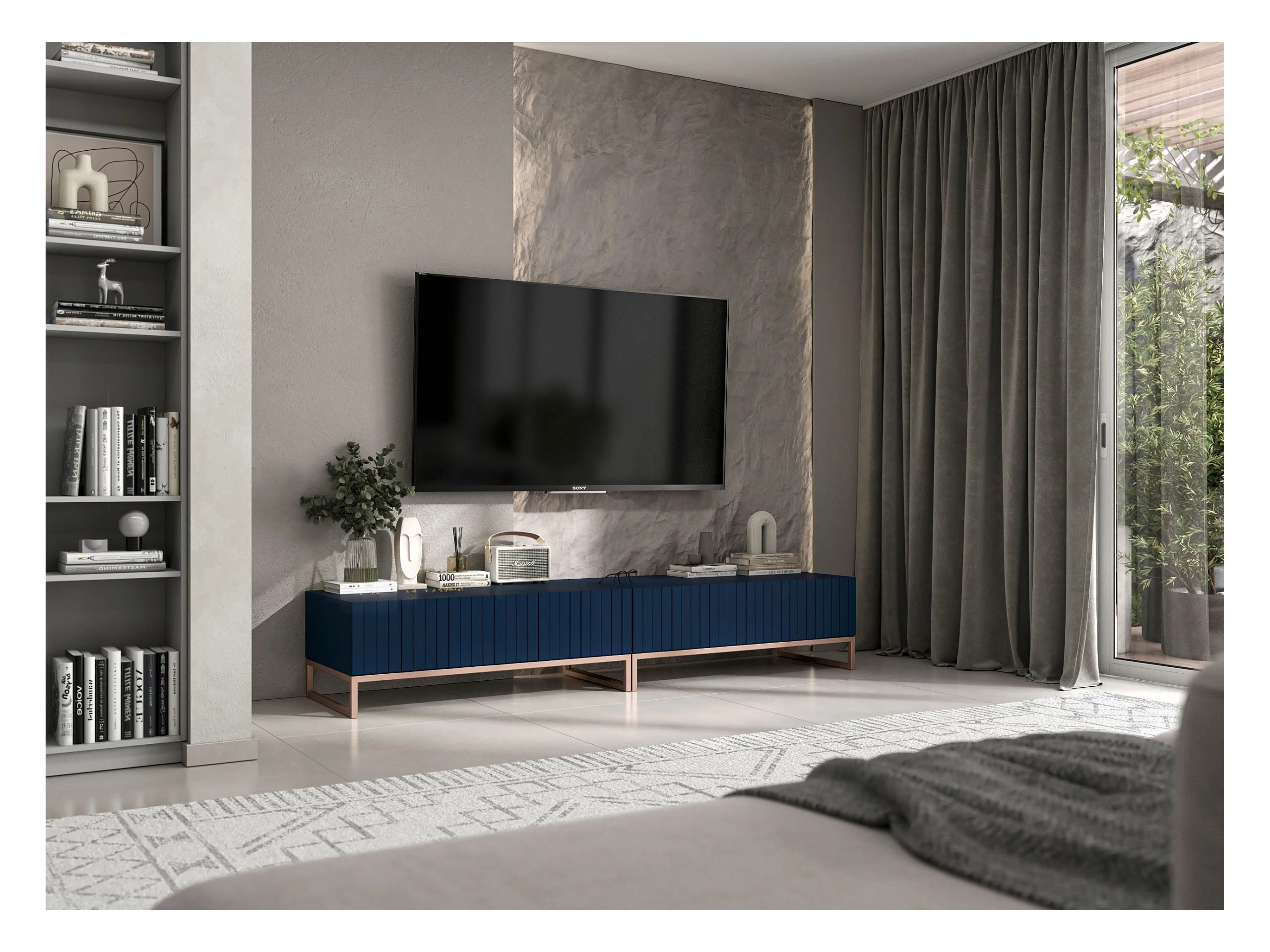 Meuble TV avec 2 portes - Corps Bleu marine mat, façades rainurées Bleu marine mat - 220 cm, cadre métallique