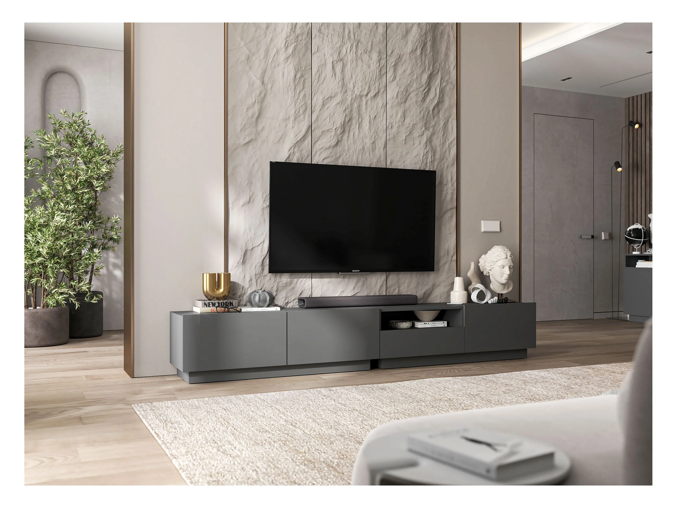 Meuble TV avec 4 portes - corps Graphite mat, façades Graphite mat - 240 cm, sur socle