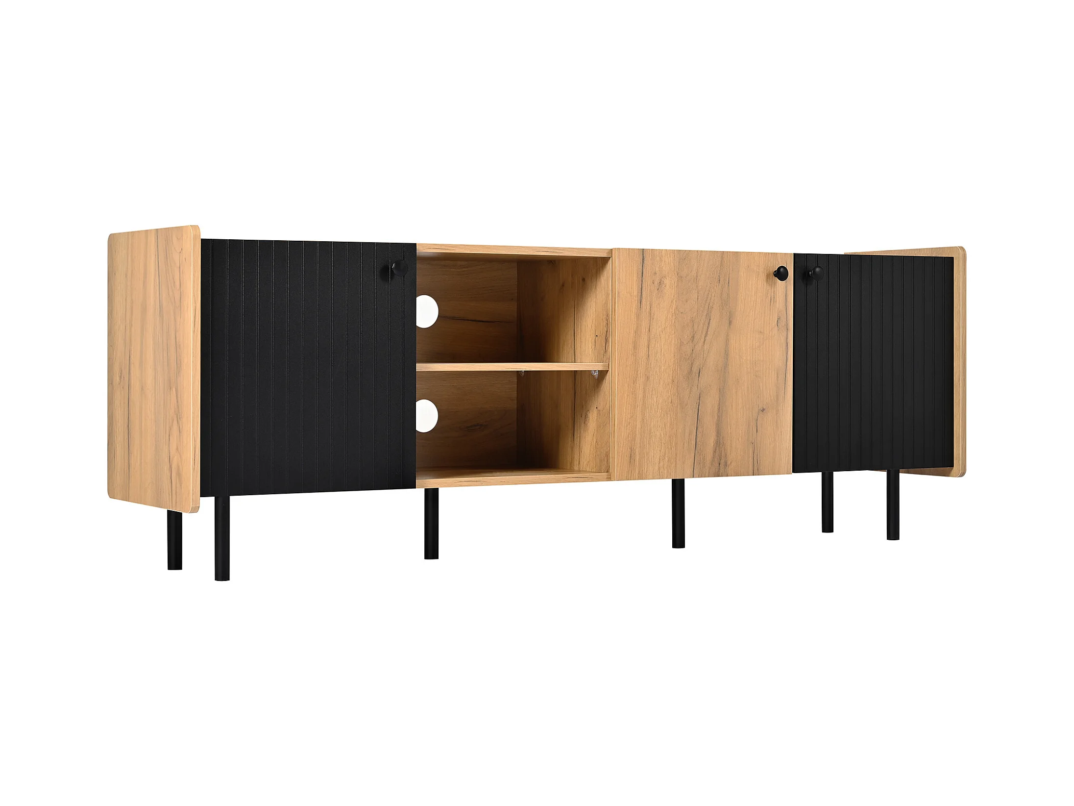 Meuble TV avec 3 portes et 2 niches, en finition bois naturel et noir - 160x38x57cm