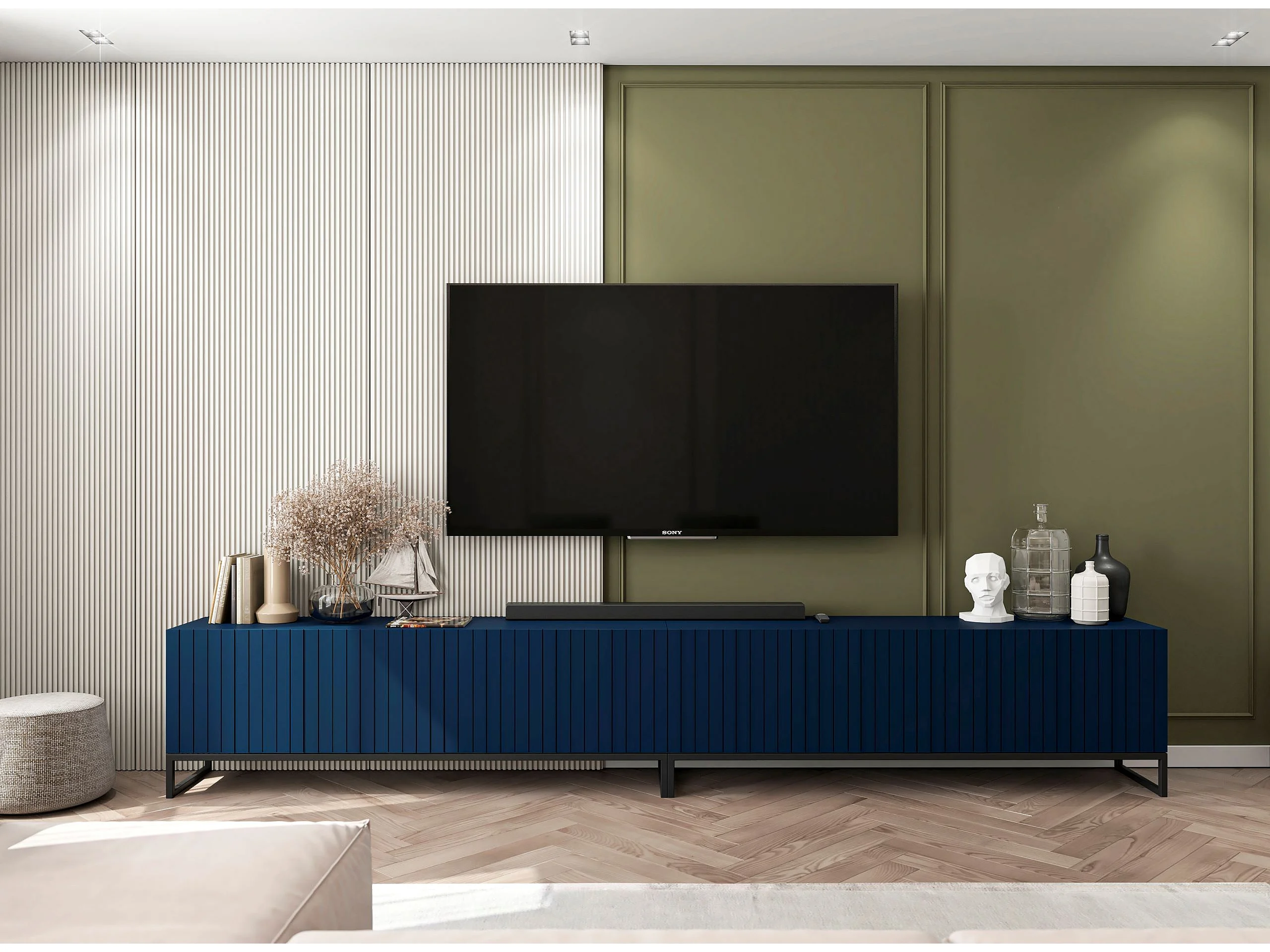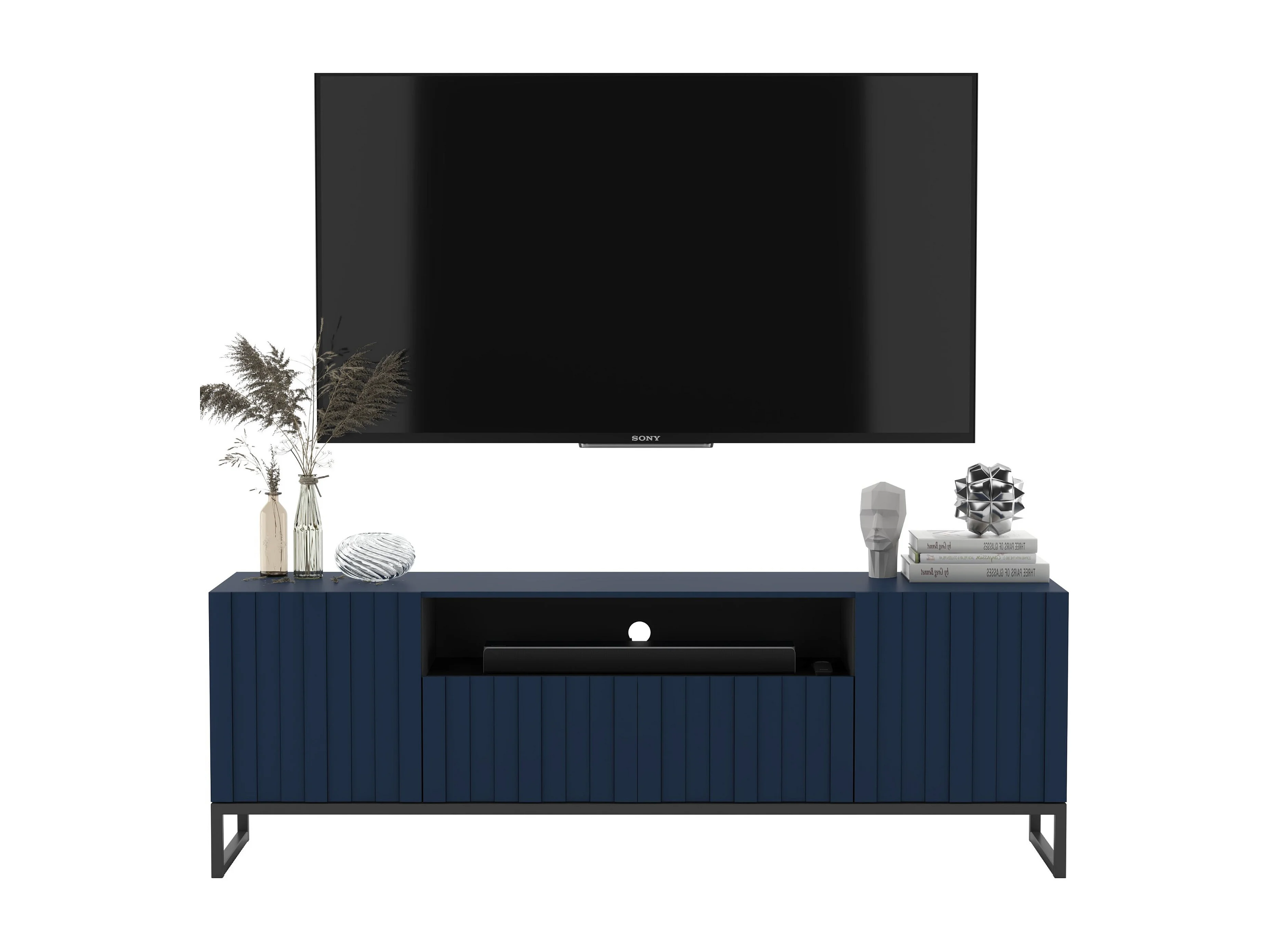 Meuble TV avec 3 portes et niche - Corps Bleu Marine mat, façades rainurées Bleu Marine mat - 150 cm, Cadre en métal noir