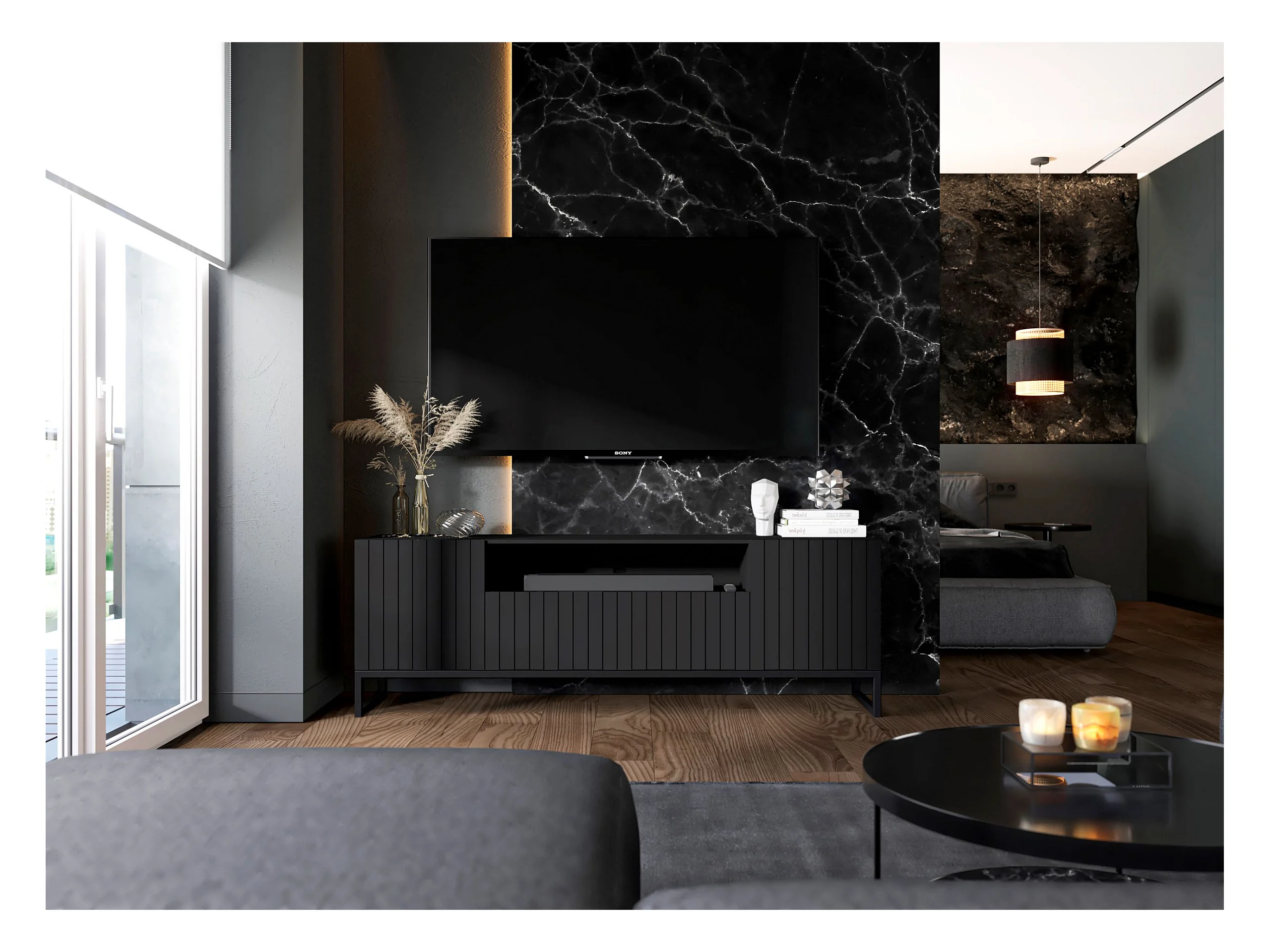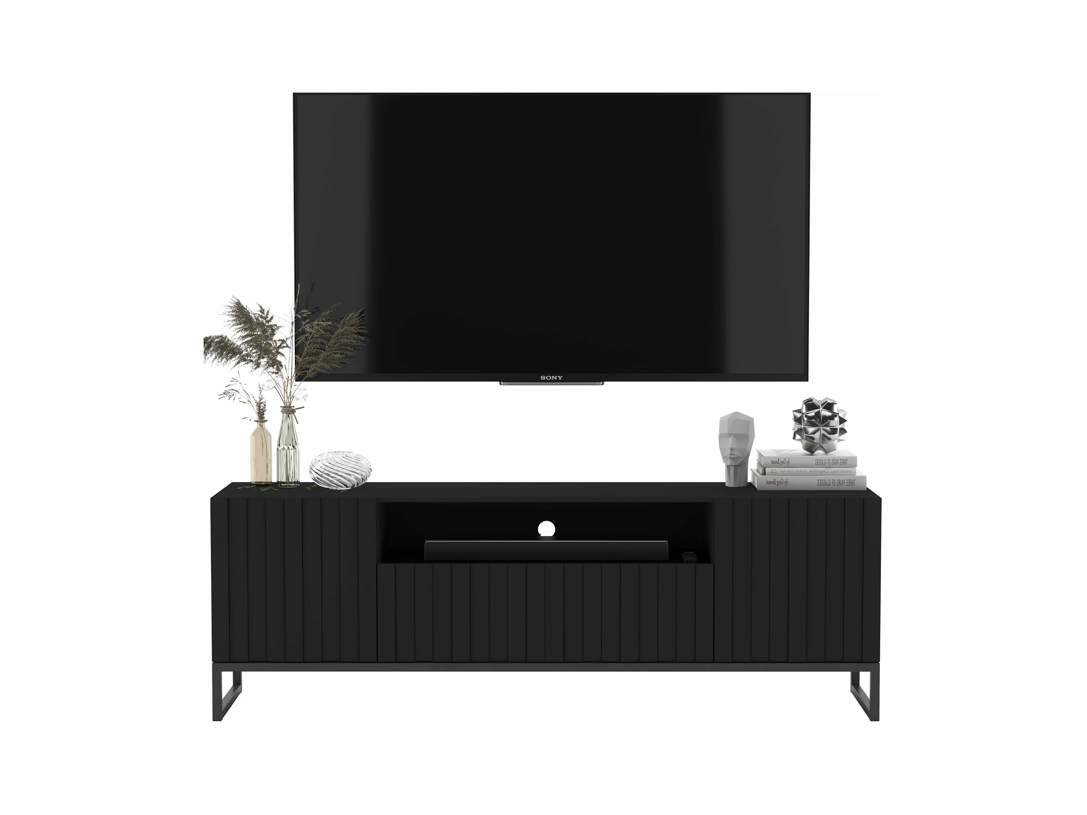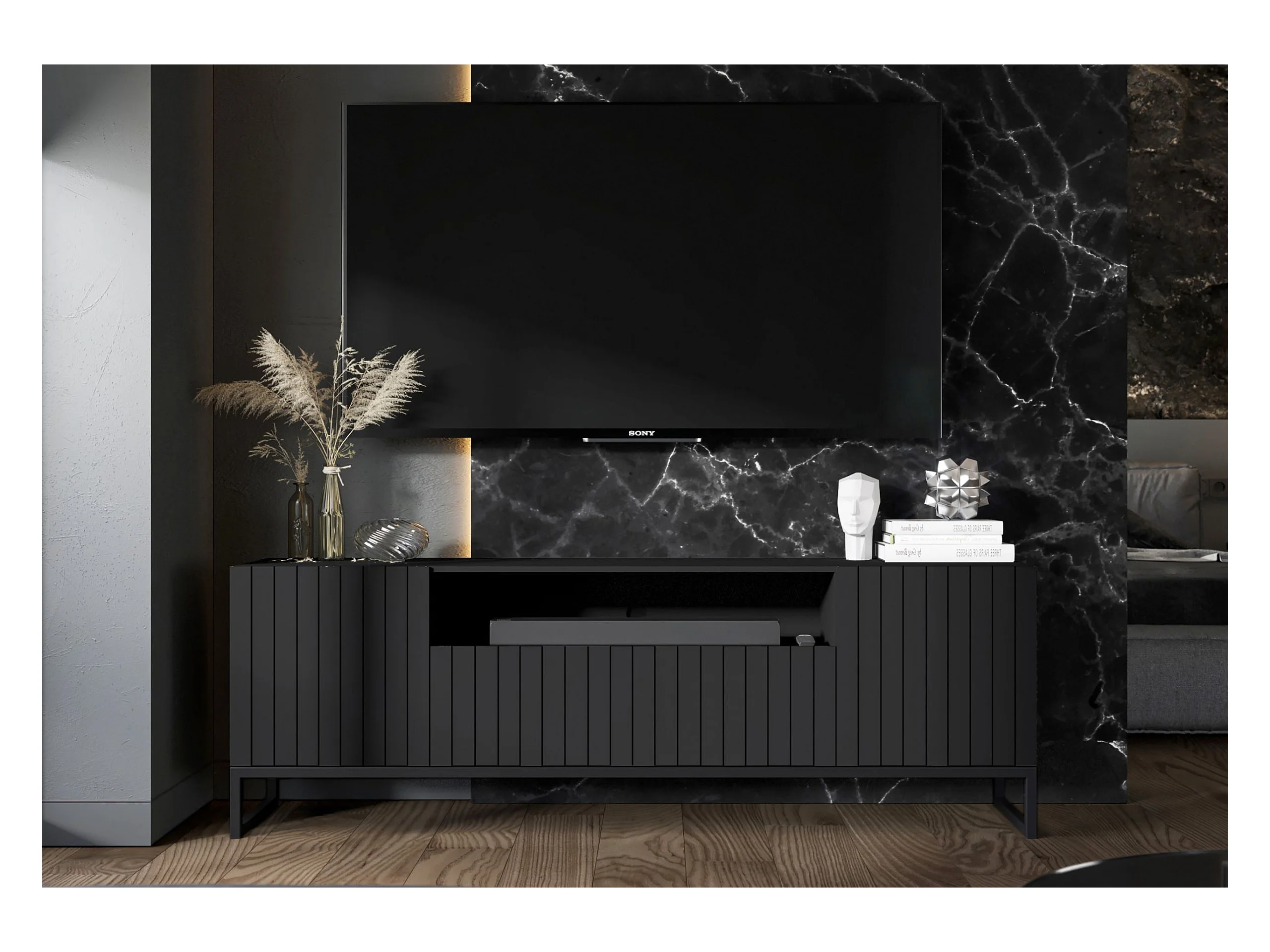 Meuble TV avec 3 portes et niche - Corps Noir mat, façades rainurées Noir mat - 150 cm, Cadre en métal noir