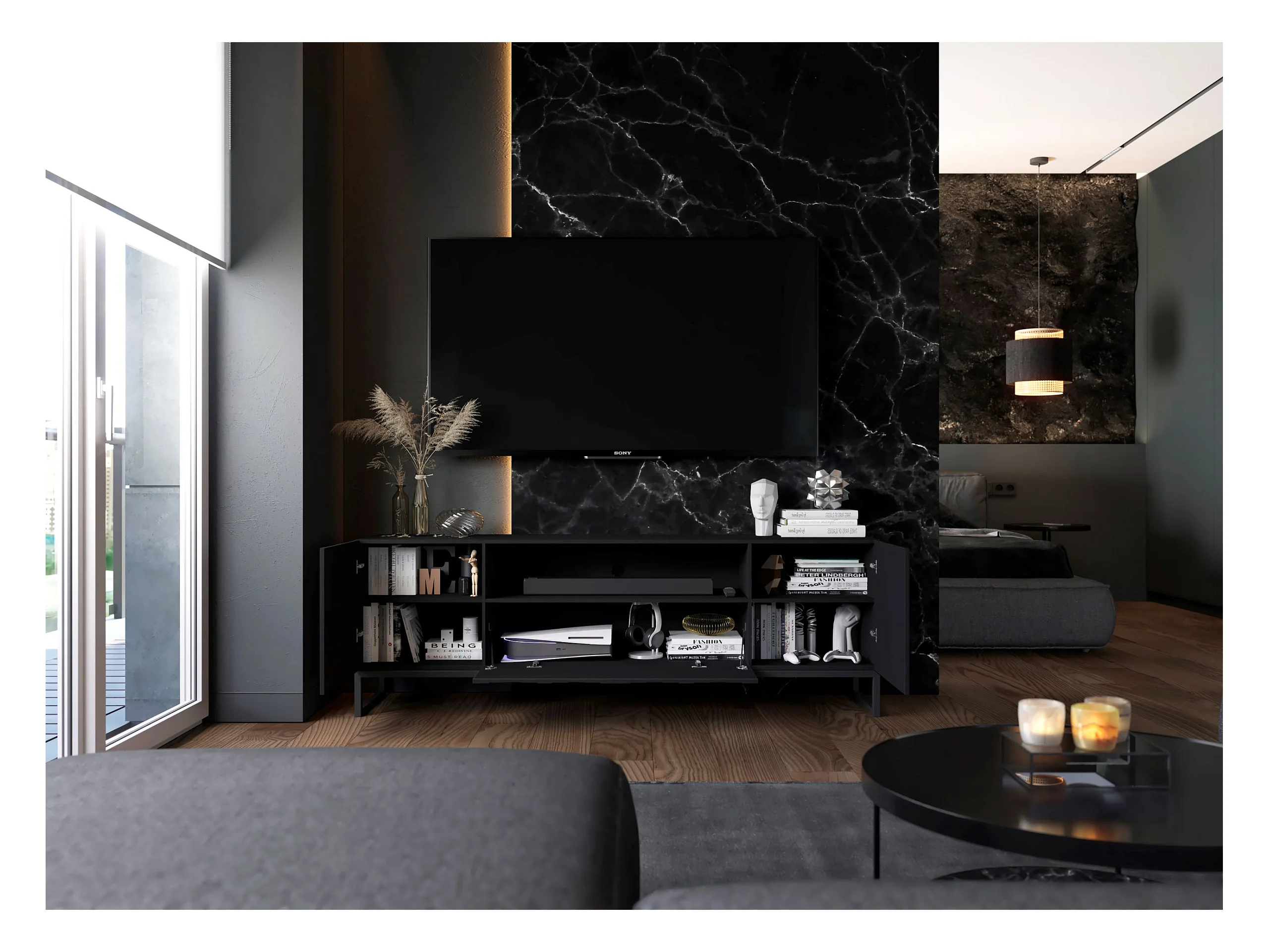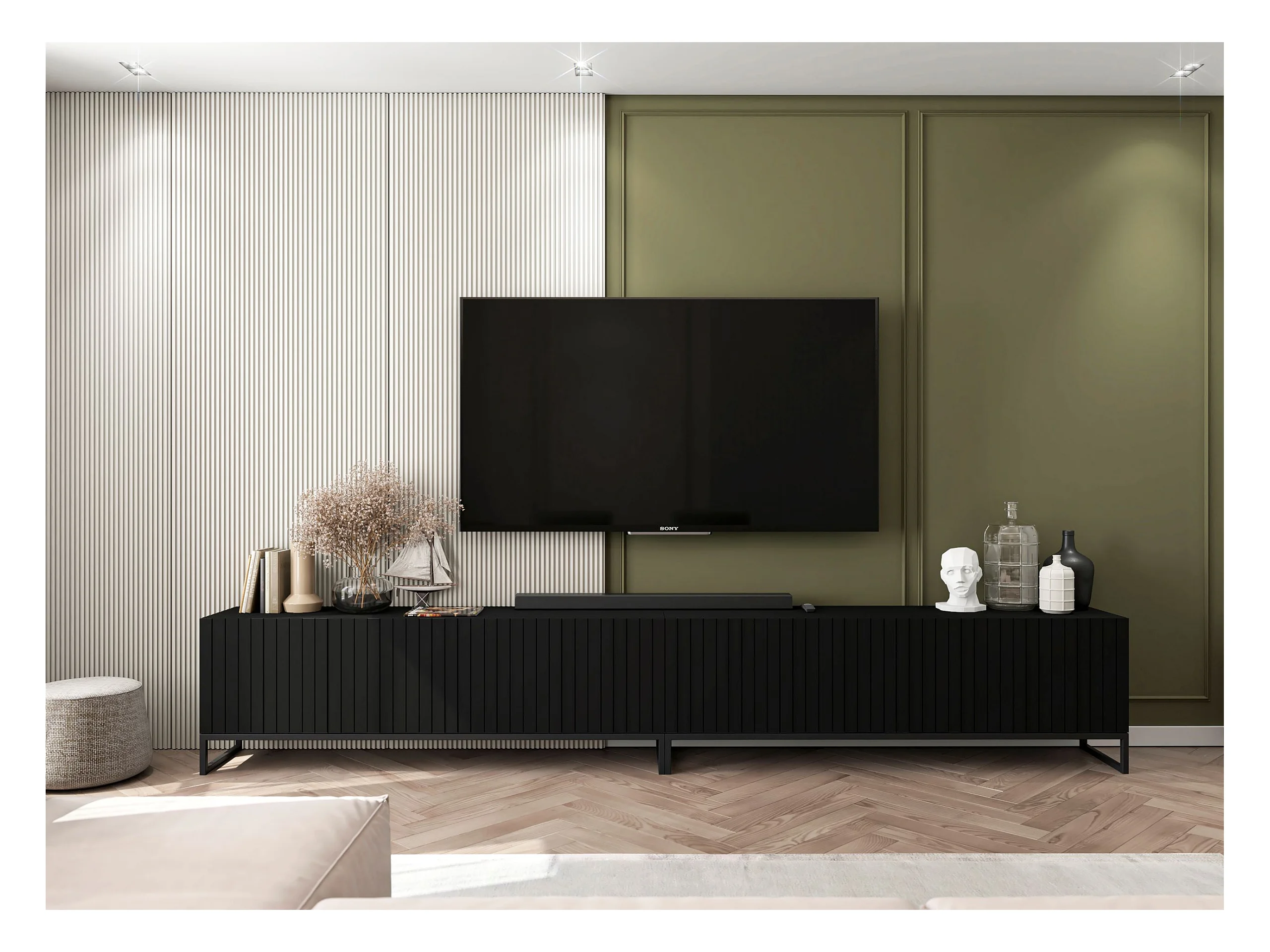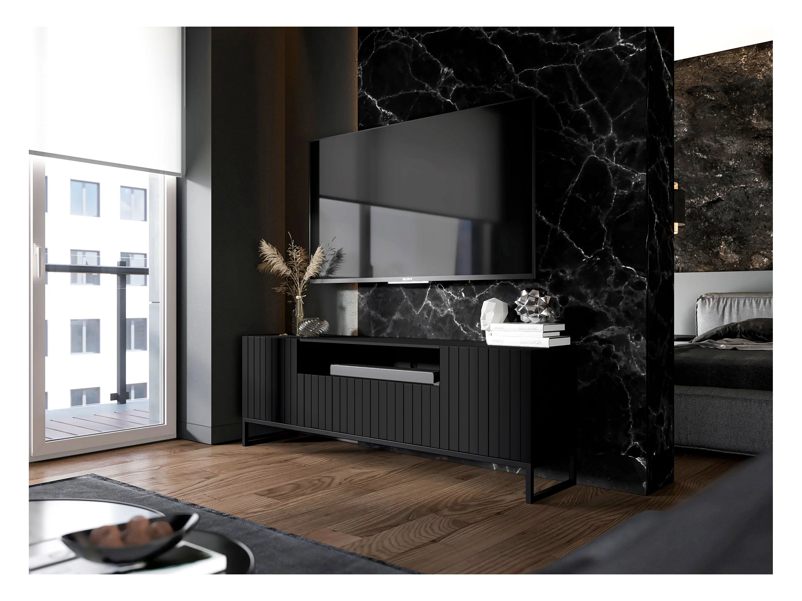 Meuble TV avec 3 portes et niche - Corps Noir mat, façades rainurées Noir mat - 150 cm, Cadre en métal noir