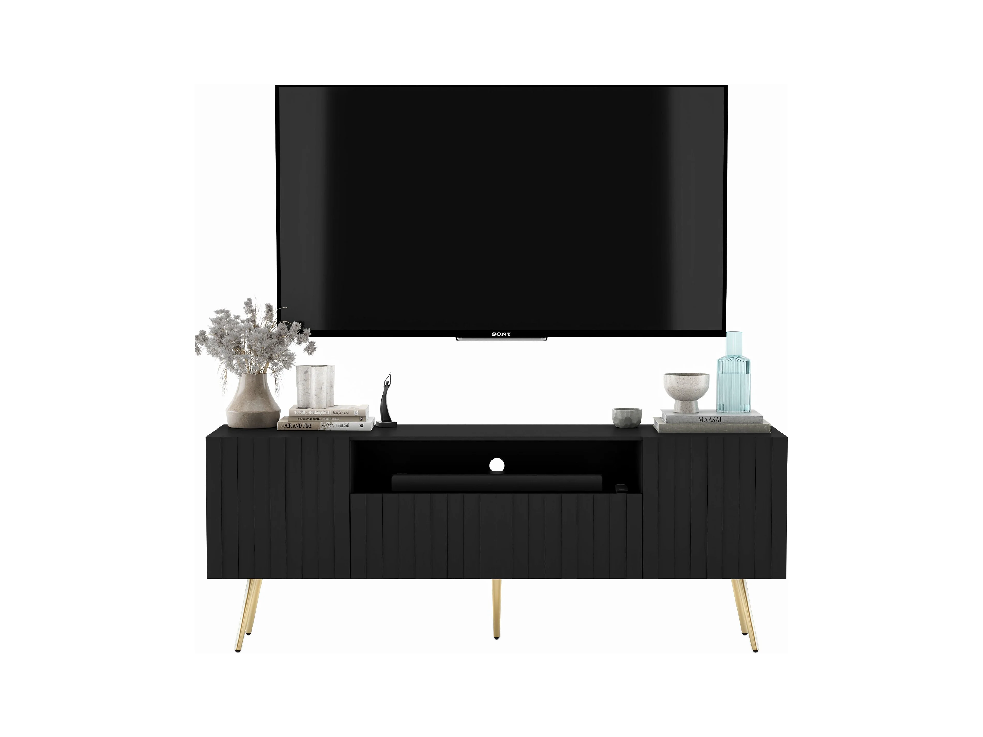 Meuble TV avec 3 portes et niche - Corps Noir mat, façades rainurées Noir mat - 150 cm, pieds noirs