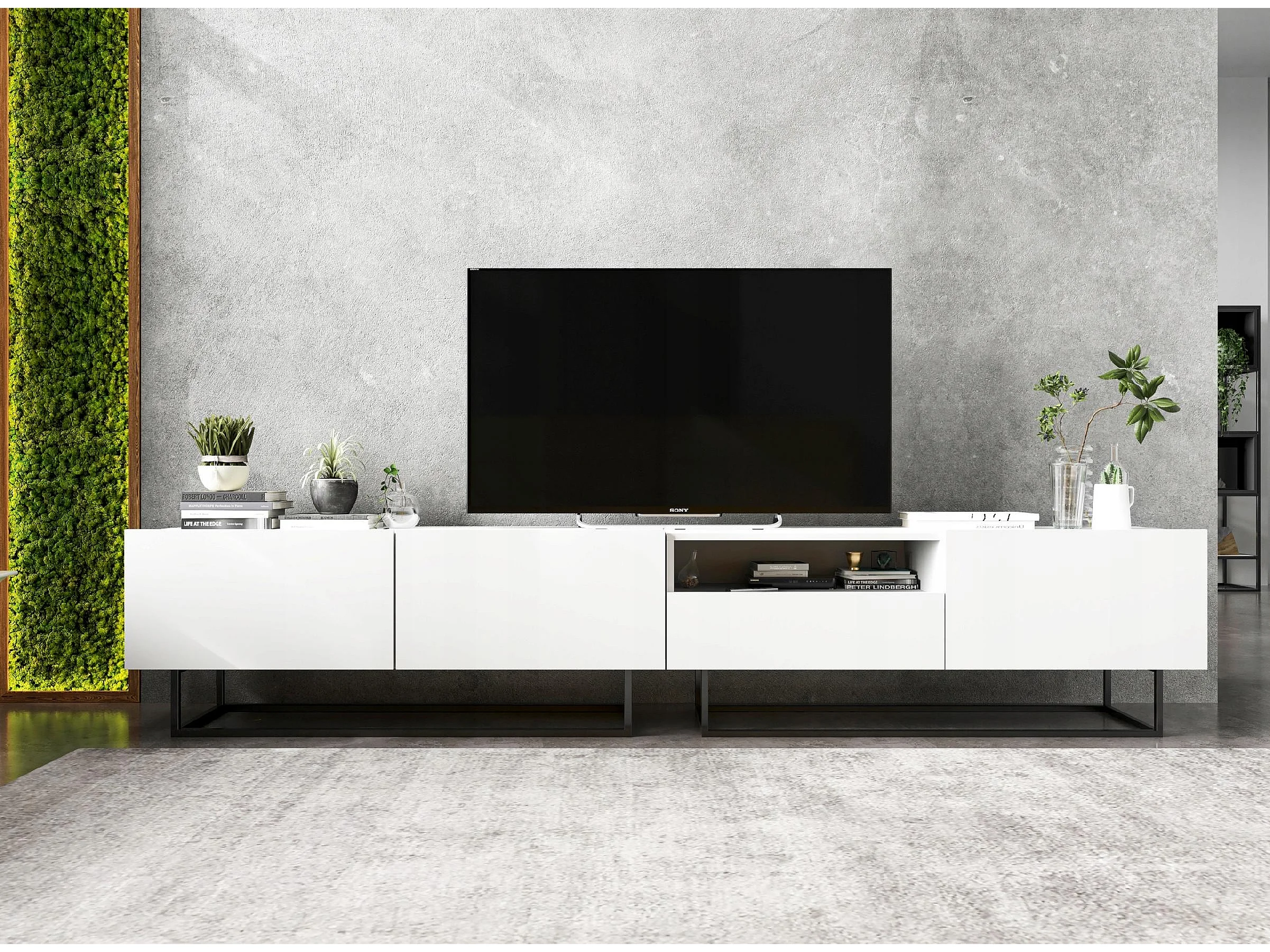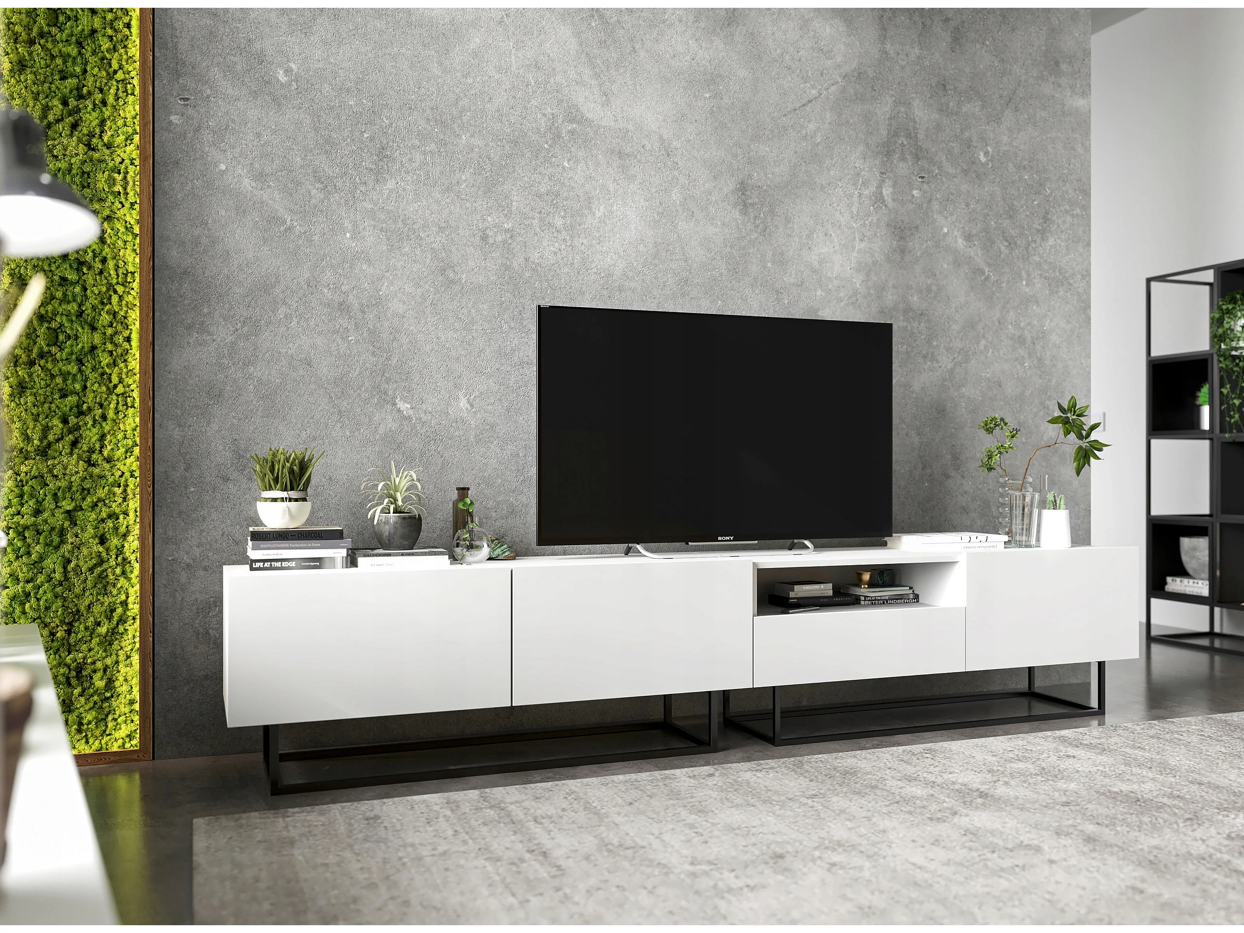 Meuble TV avec 3 portes et niche, tiroir - corps Blanc mat, façades Blanc mat - 240 cm, Cadre en métal noir