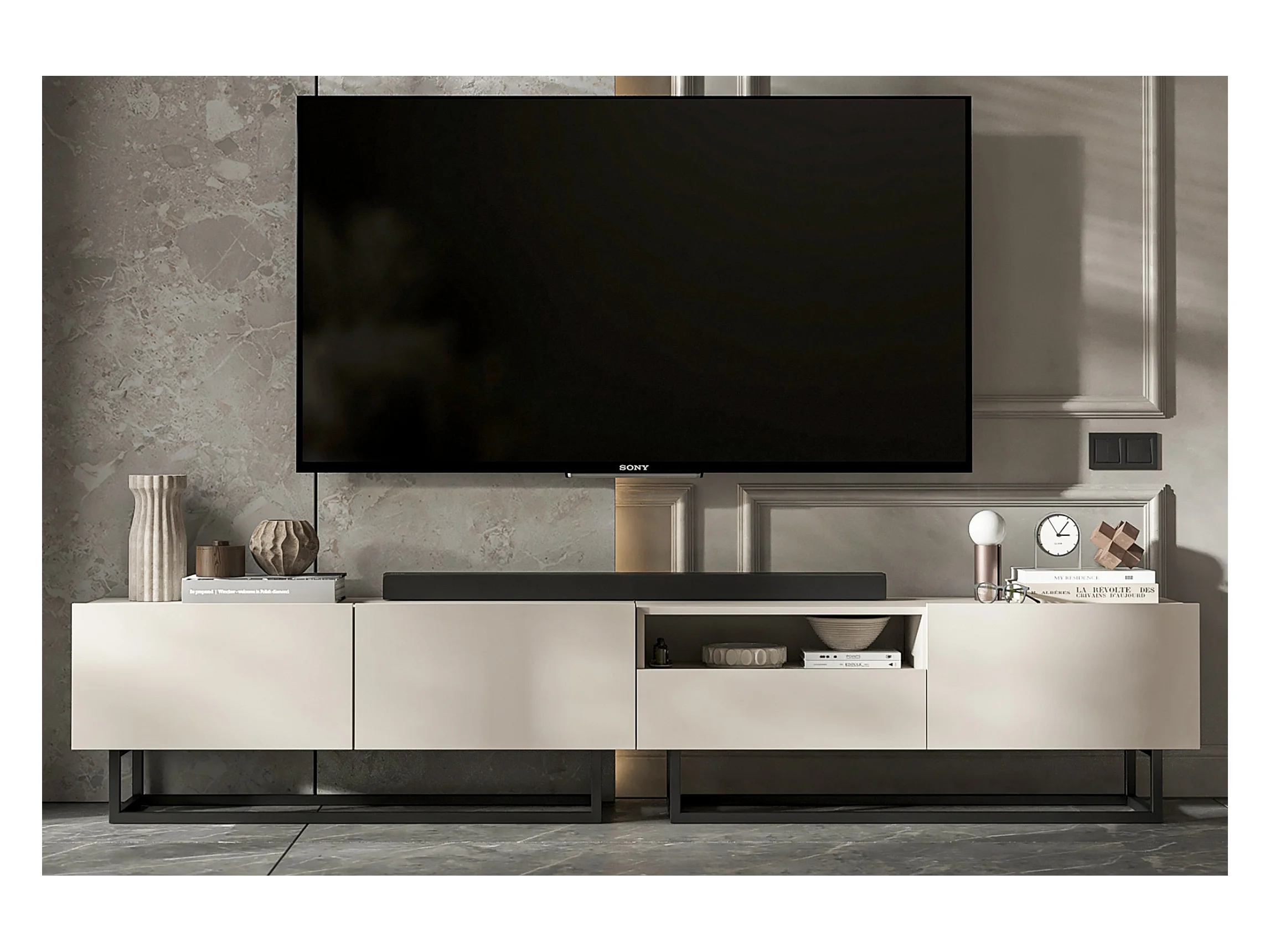 Meuble TV avec 3 portes et niche, tiroir - corps Cachemire mat, façades Cachemire mat - 240 cm, Cadre en métal noir