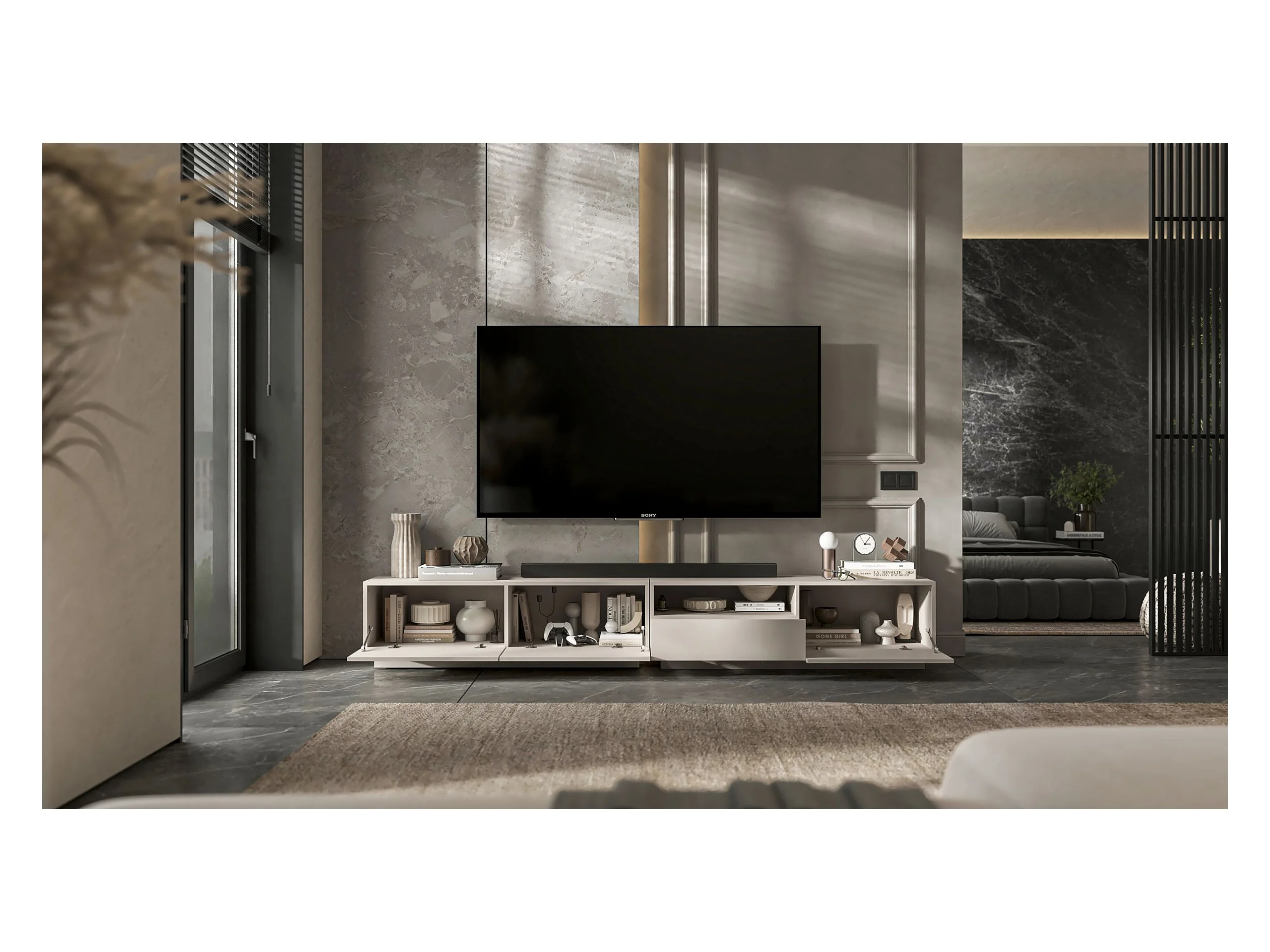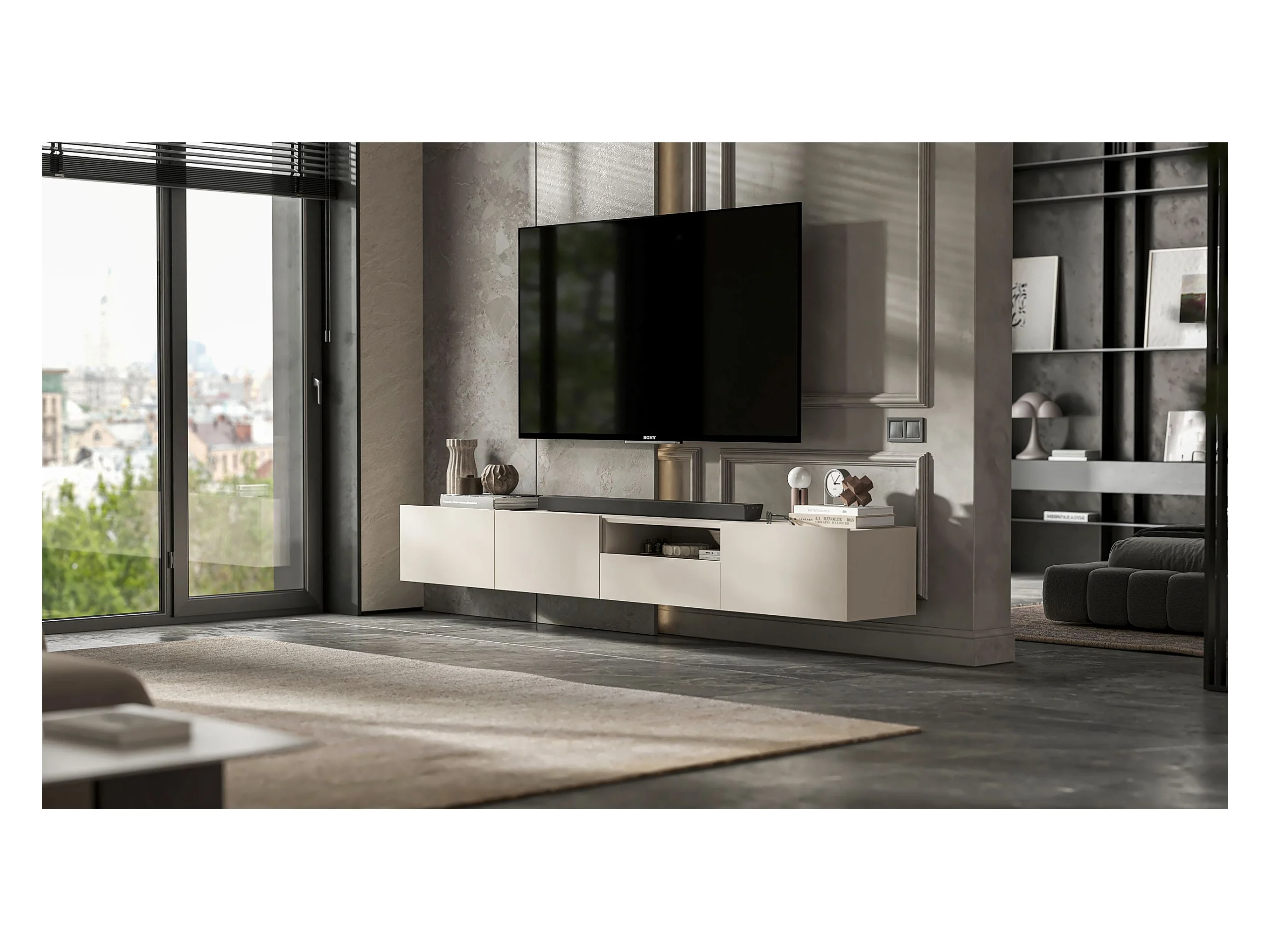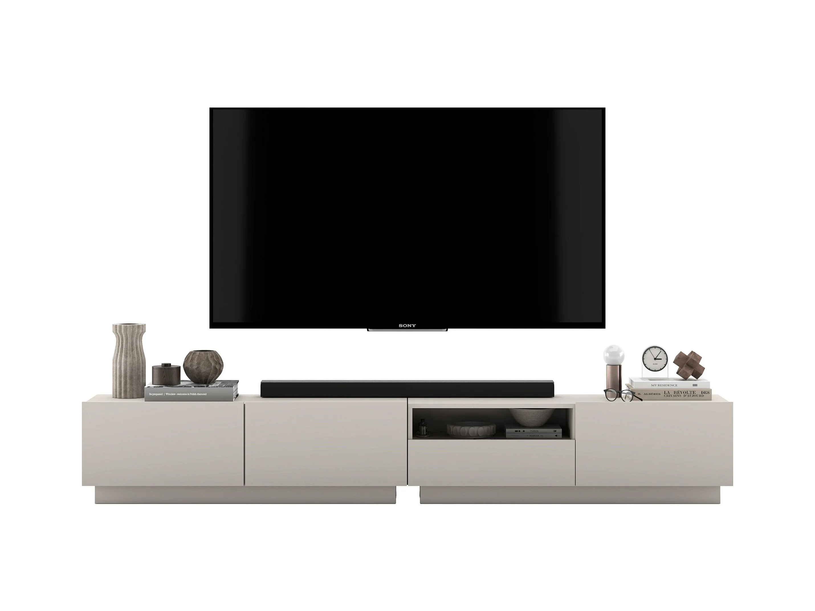 Meuble TV avec 3 portes et niche, tiroir - corps Cachemire mat, façades Cachemire mat - 240 cm, sur socle