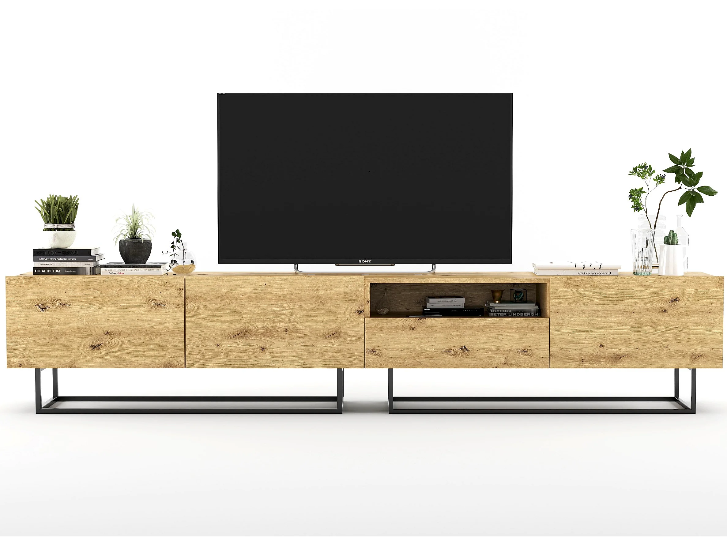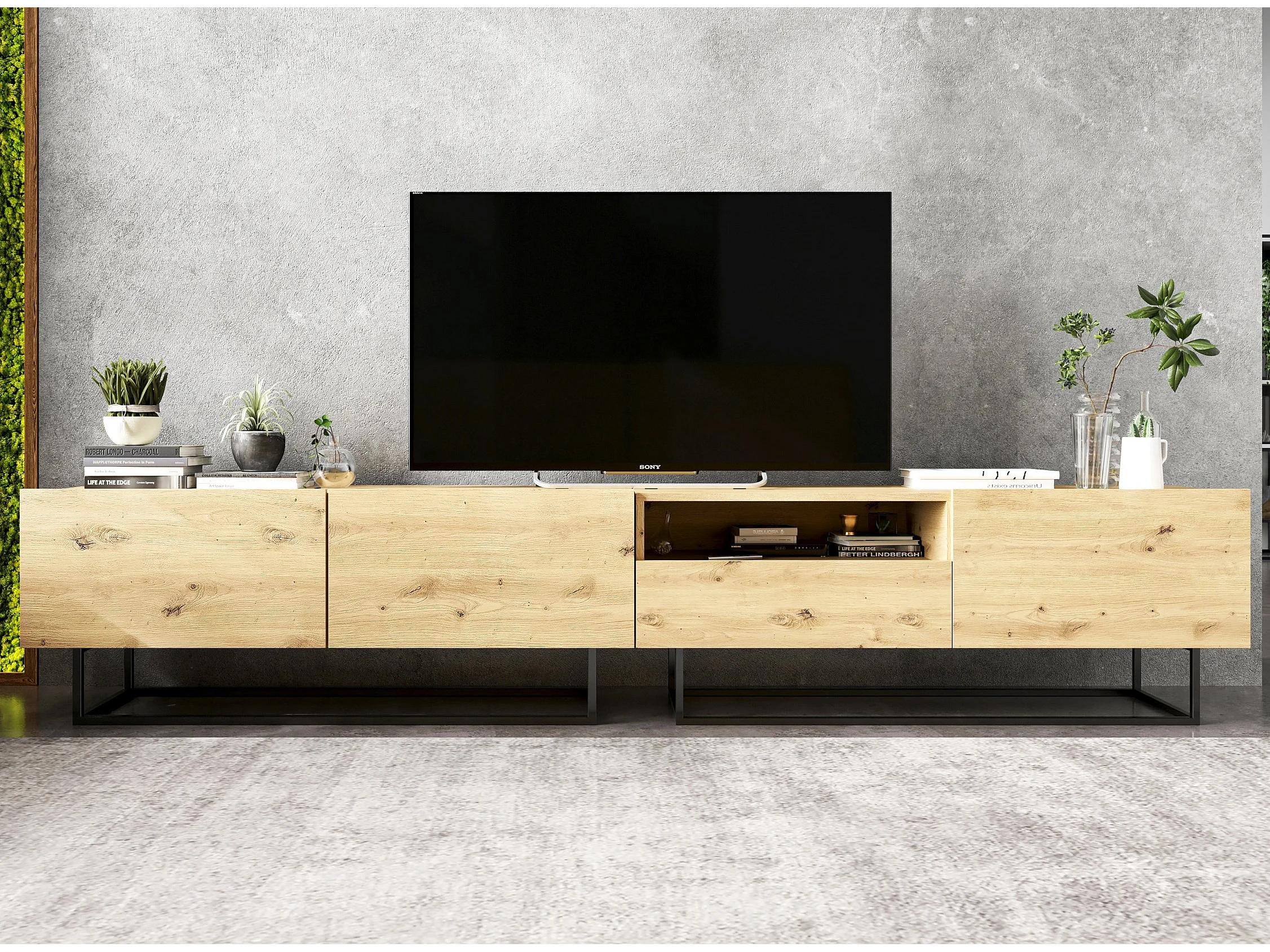 Meuble TV avec 3 portes et niche, tiroir - corps Chêne artisanal mat, façades Chêne artisanal mat - 240 cm, Cadre en métal noir