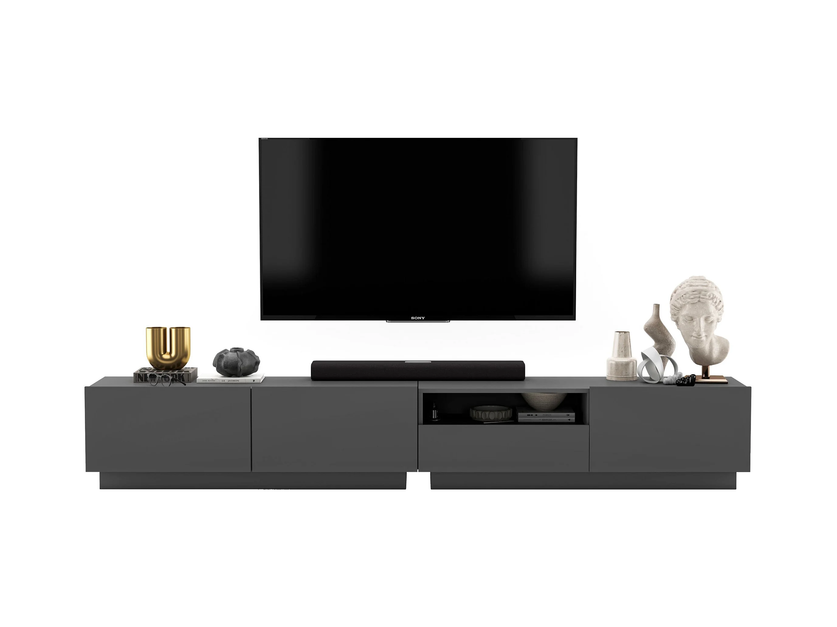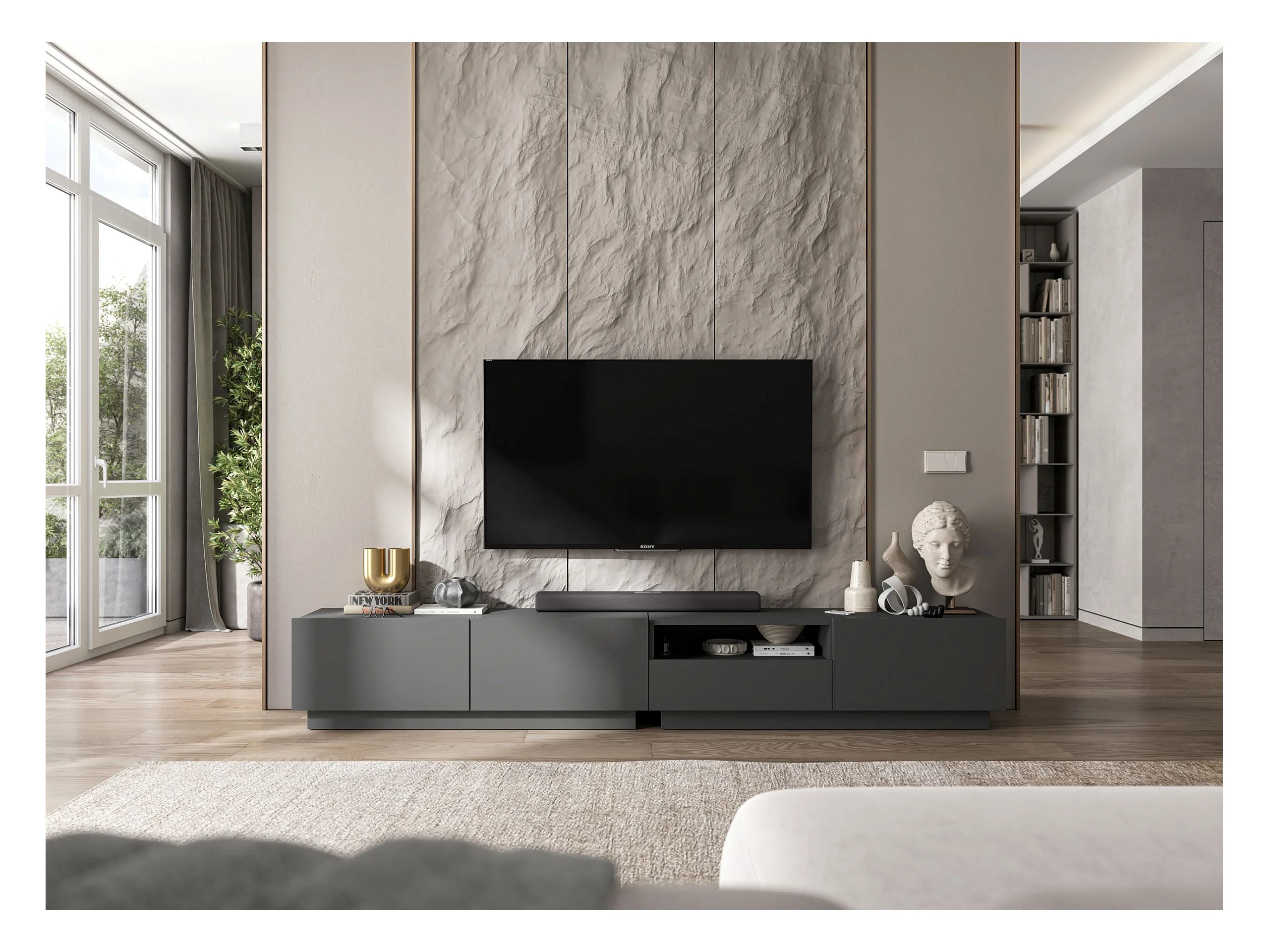 Meuble TV avec 3 portes et niche, tiroir - corps Graphite mat, façades Graphite mat - 240 cm, sur socle