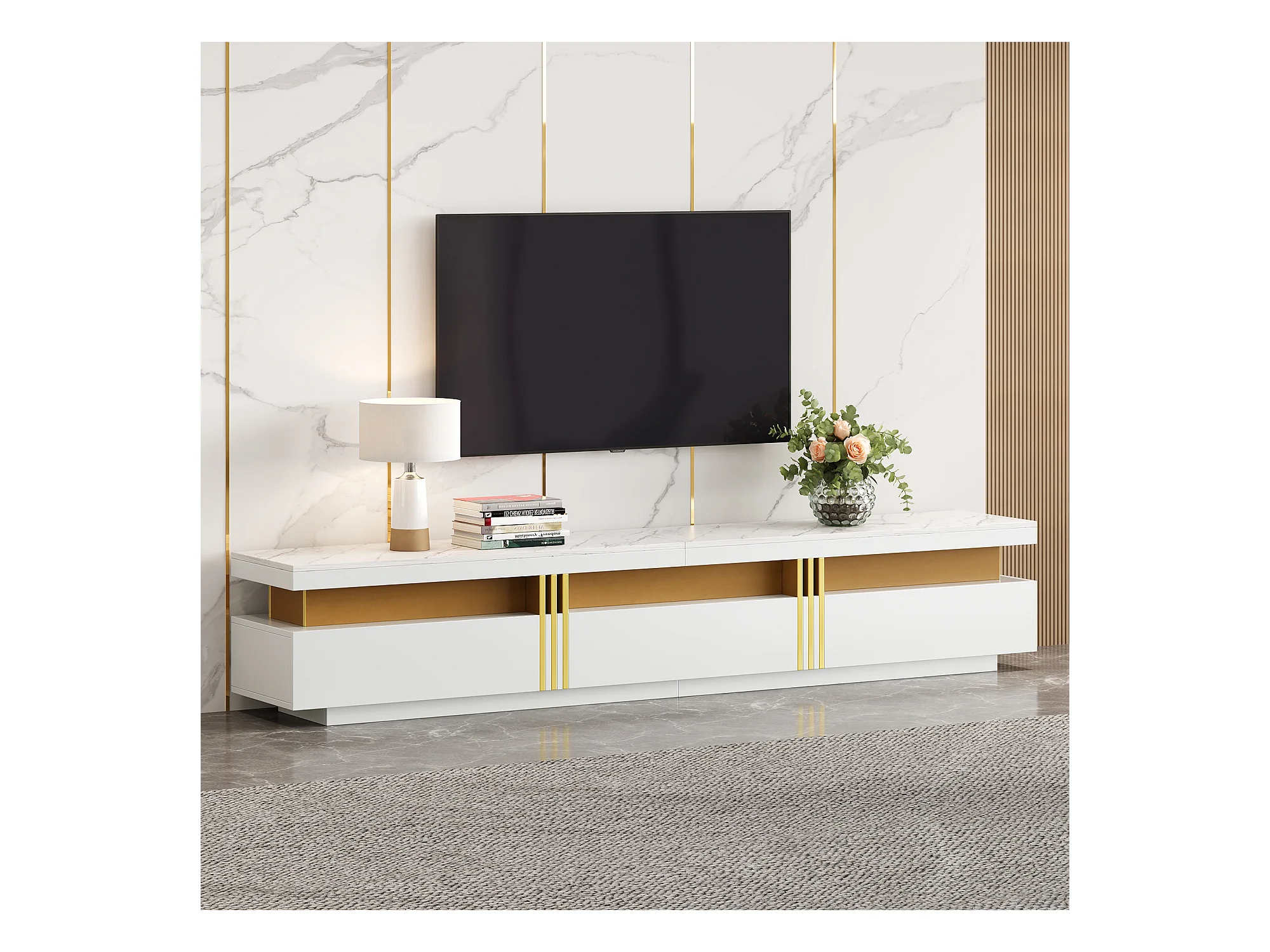 Meuble TV avec 3 tiroirs - 200 x 40 x 42 cm - Panneau de particules - Aspect marbre - Blanc