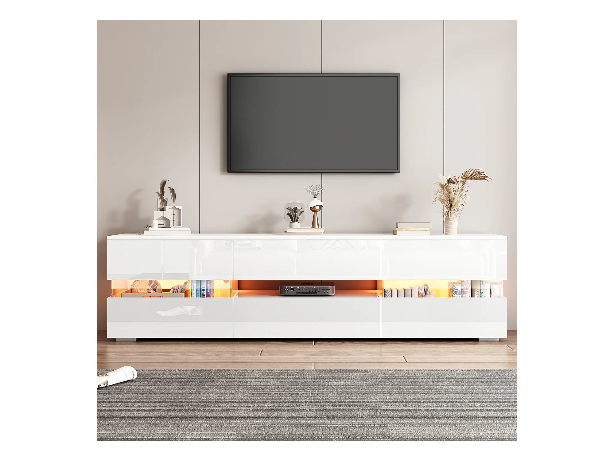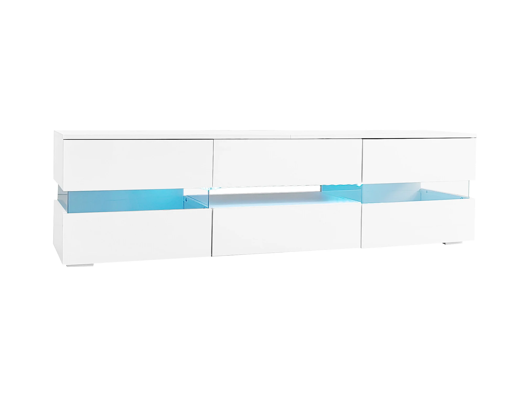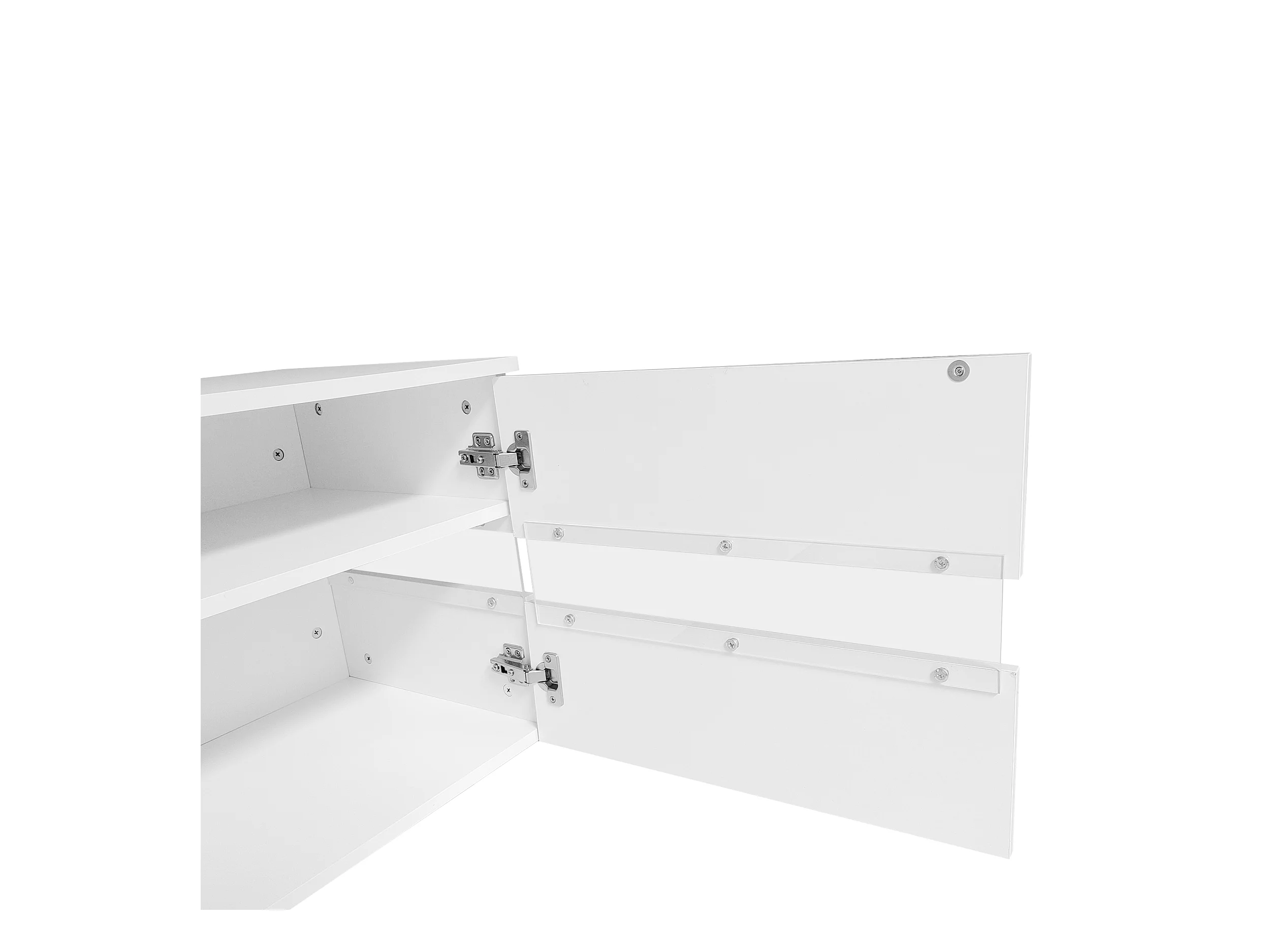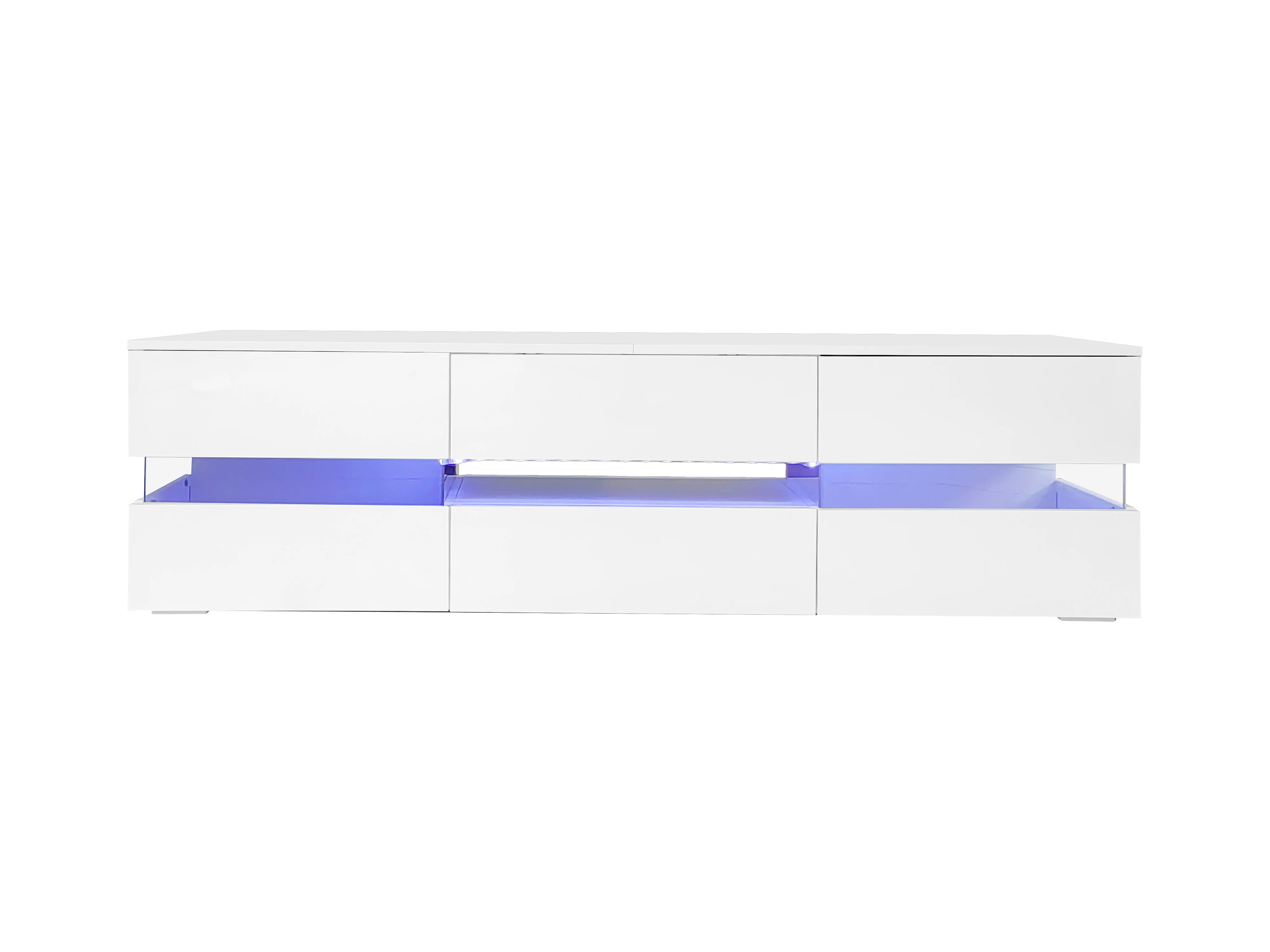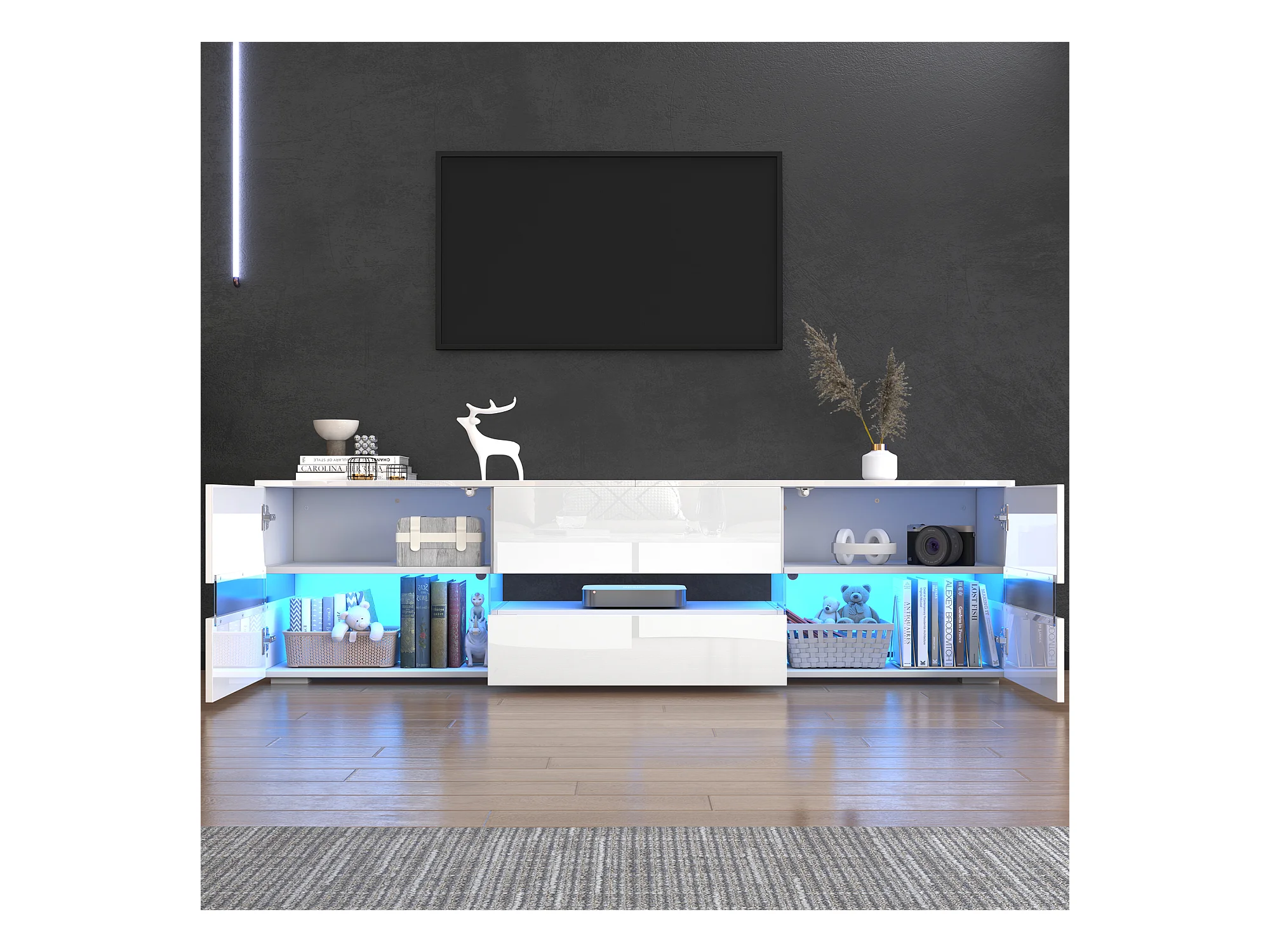 Meuble TV avec 4 portes, 2 tiroirs, compartiment ouvert - 160 x 39 x 45 cm - Panneau de particules - LEDs - Blanc brillant