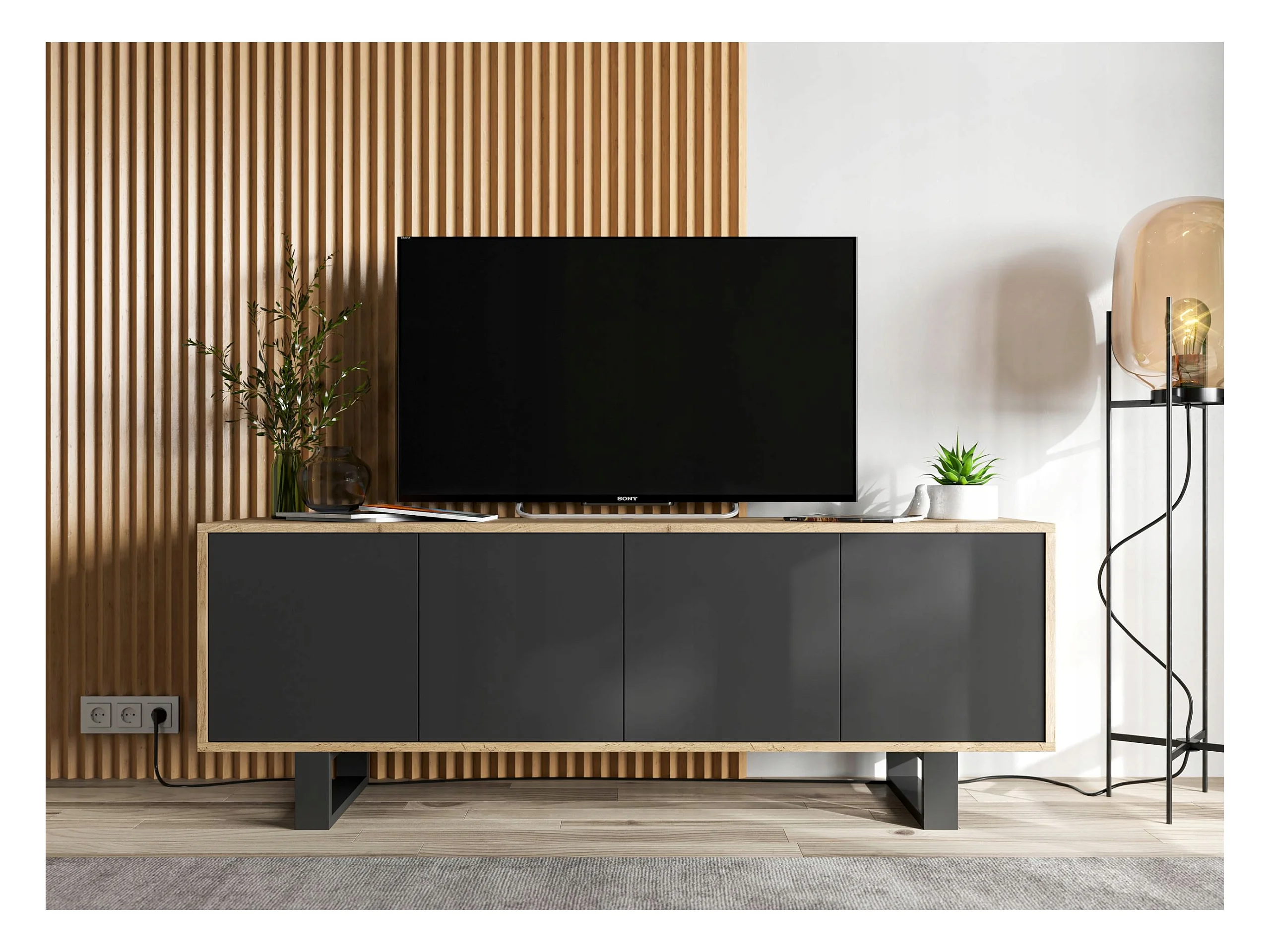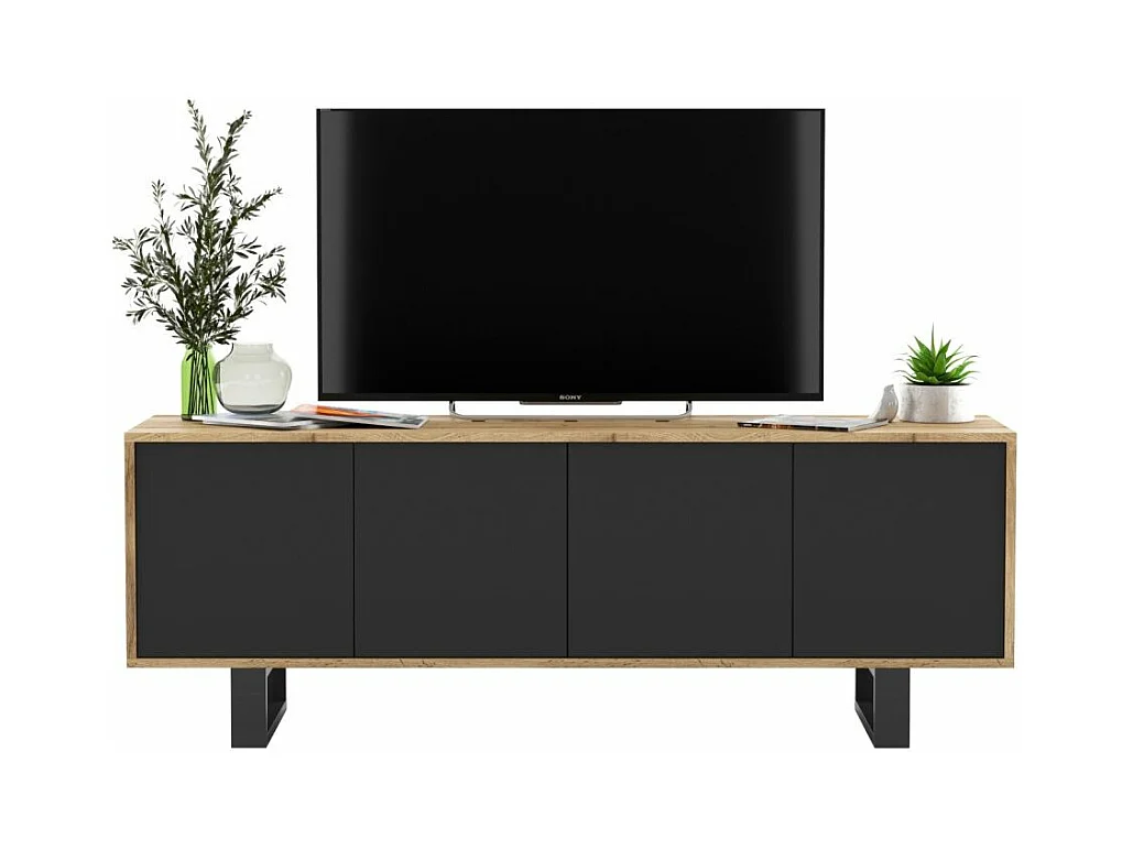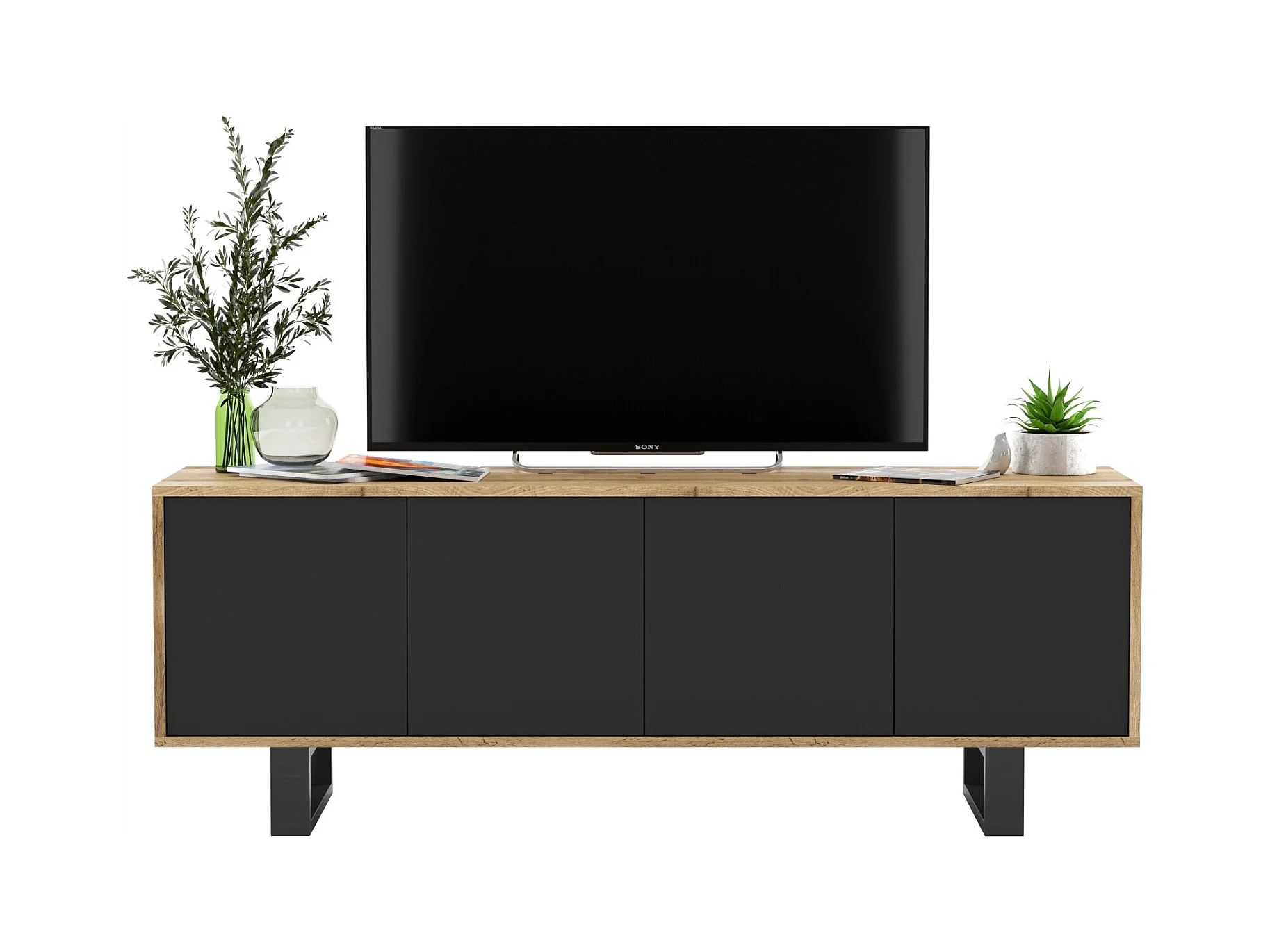 Meuble TV avec 4 portes - carcasse chêne wotan façades noir mat - 150 cm, pieds en métal