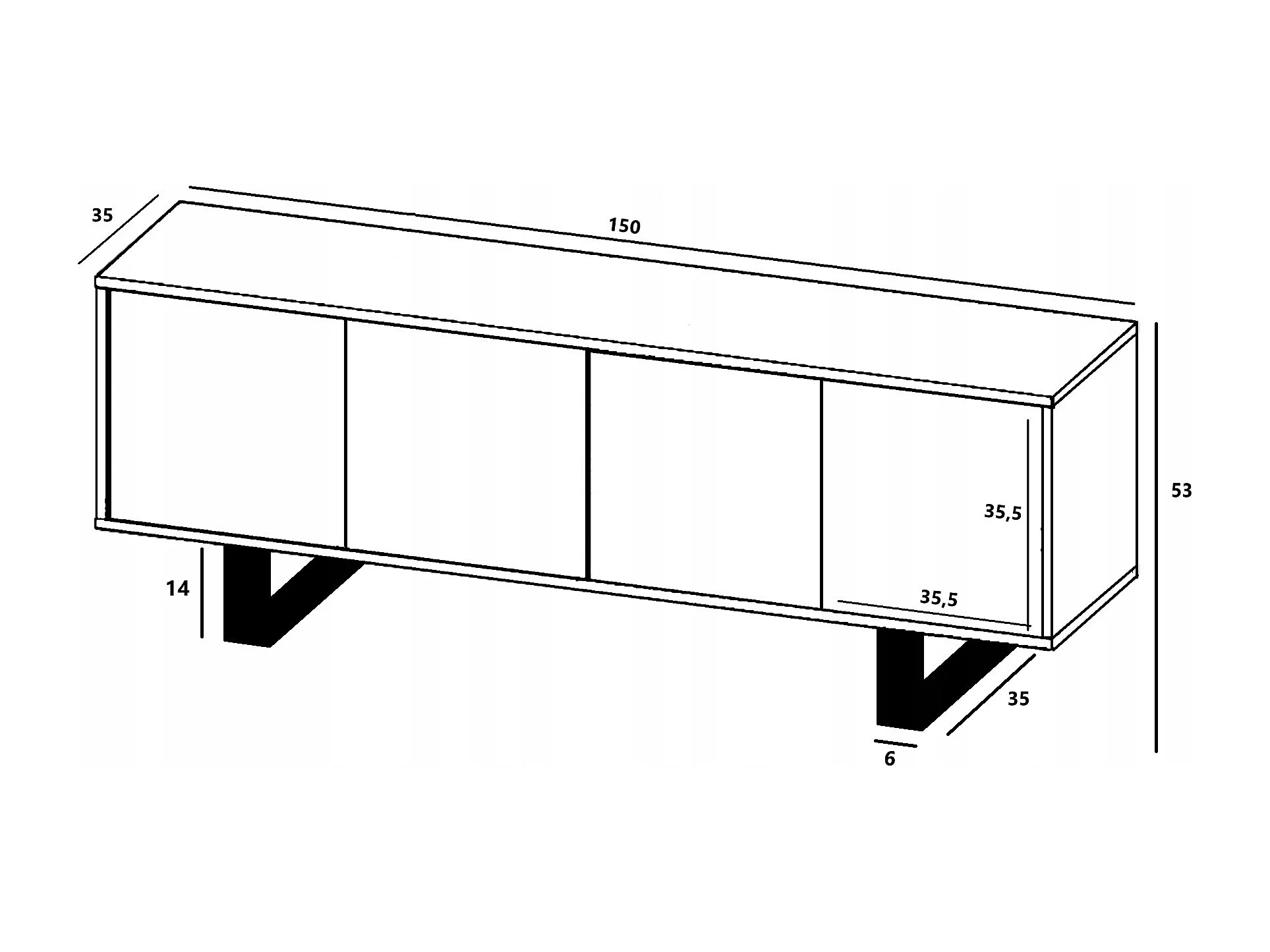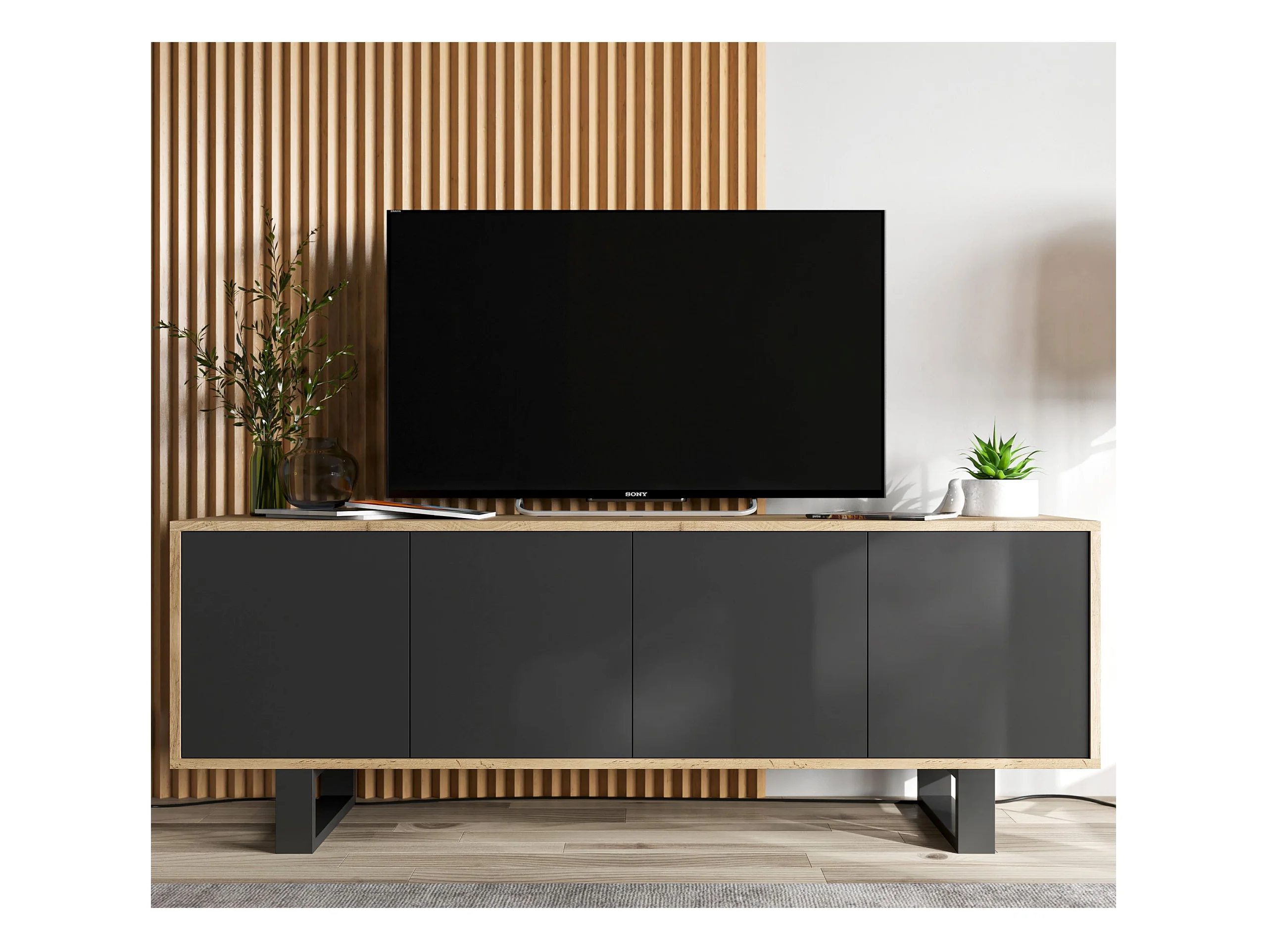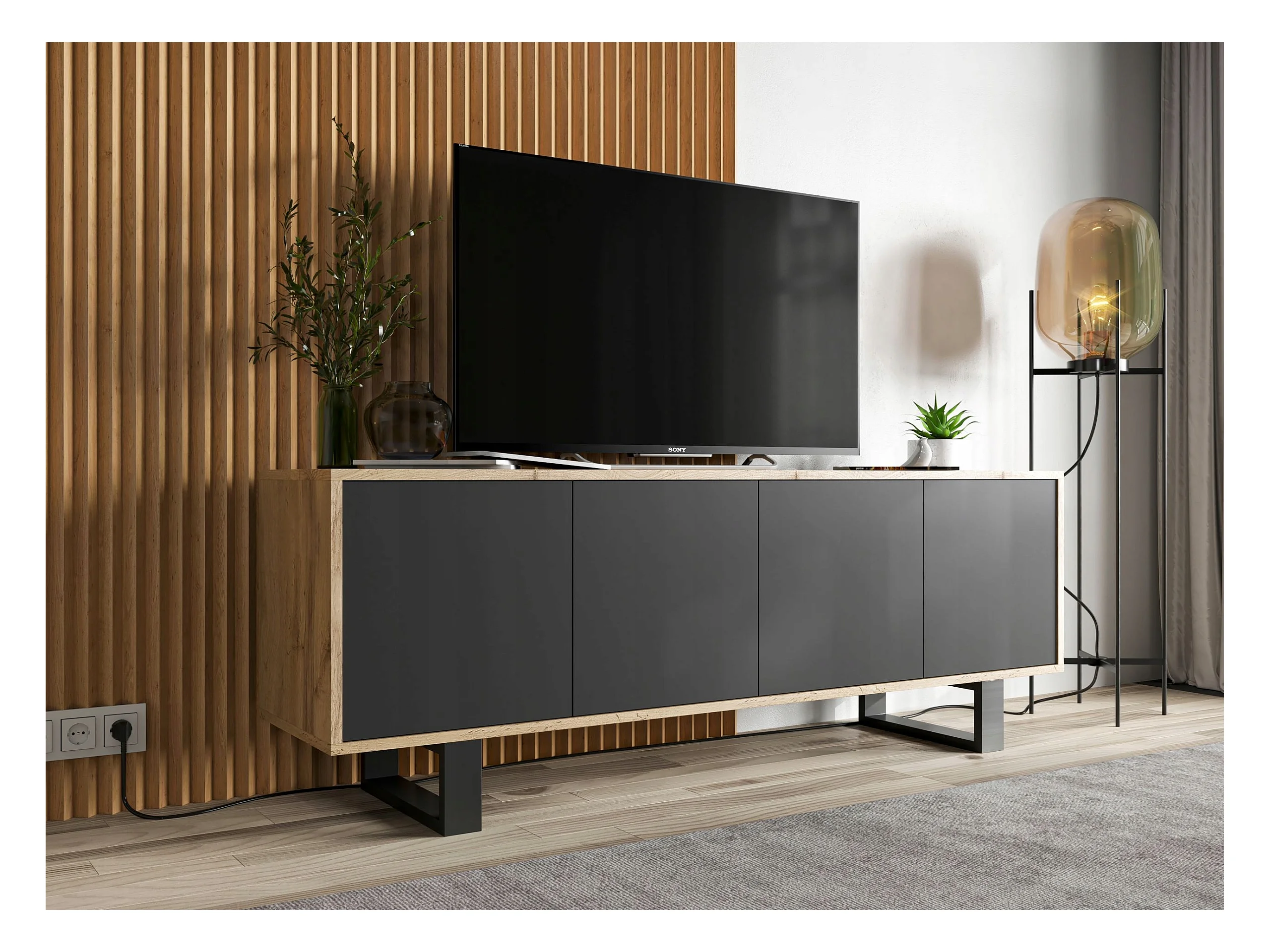 Meuble TV avec 4 portes - carcasse chêne wotan façades noir mat - 150 cm, pieds en métal