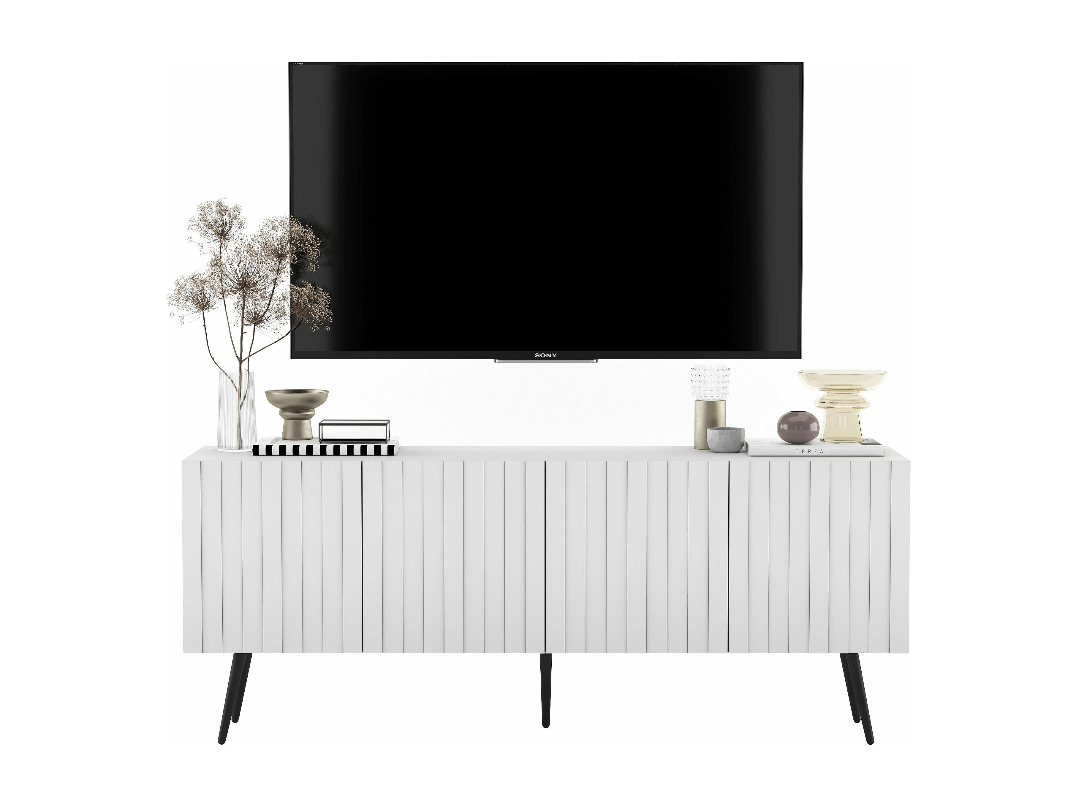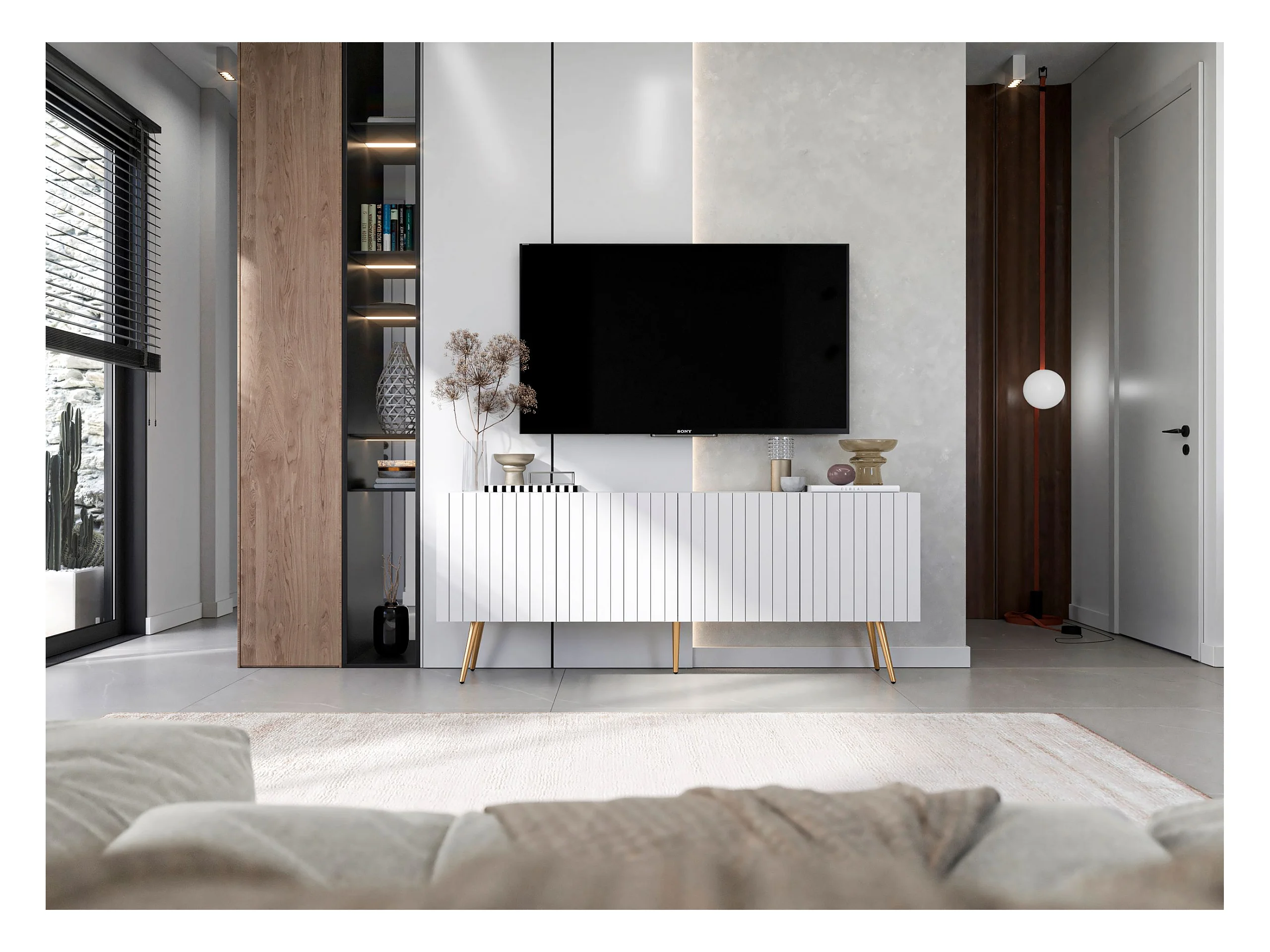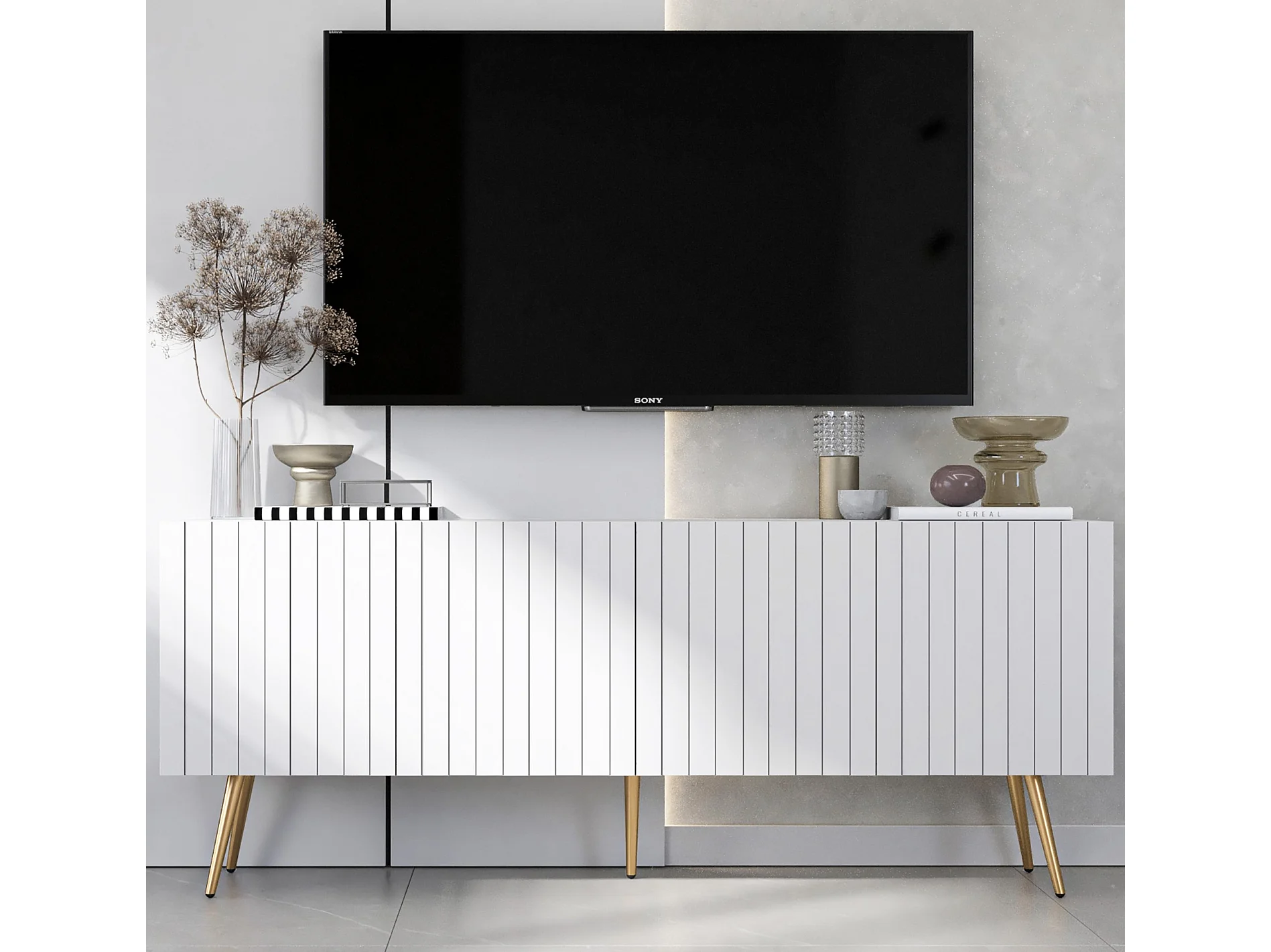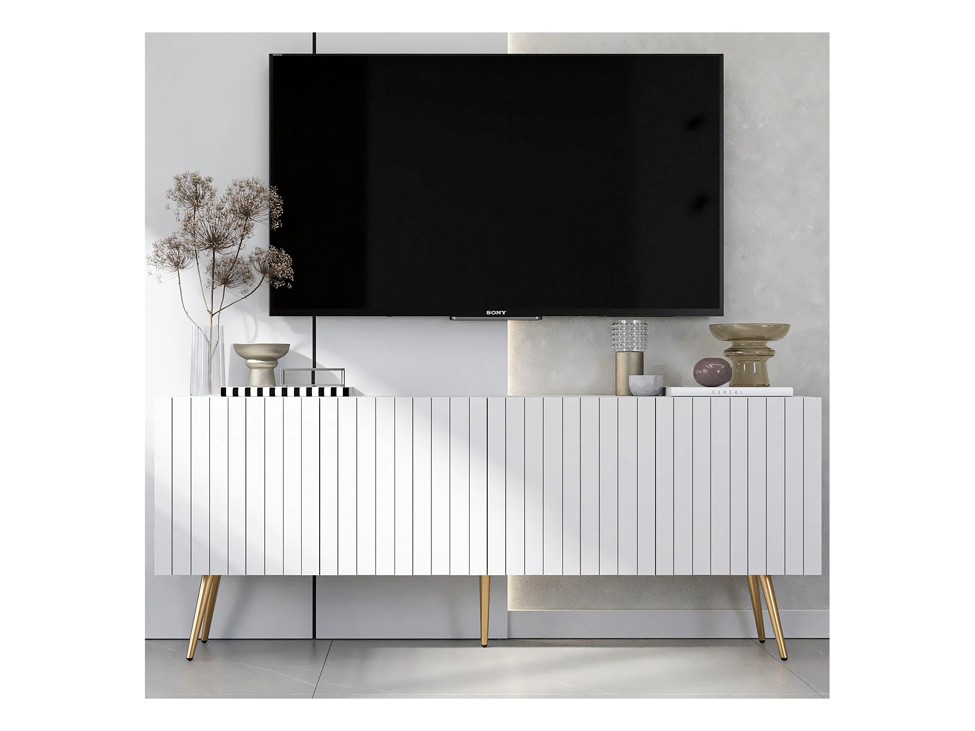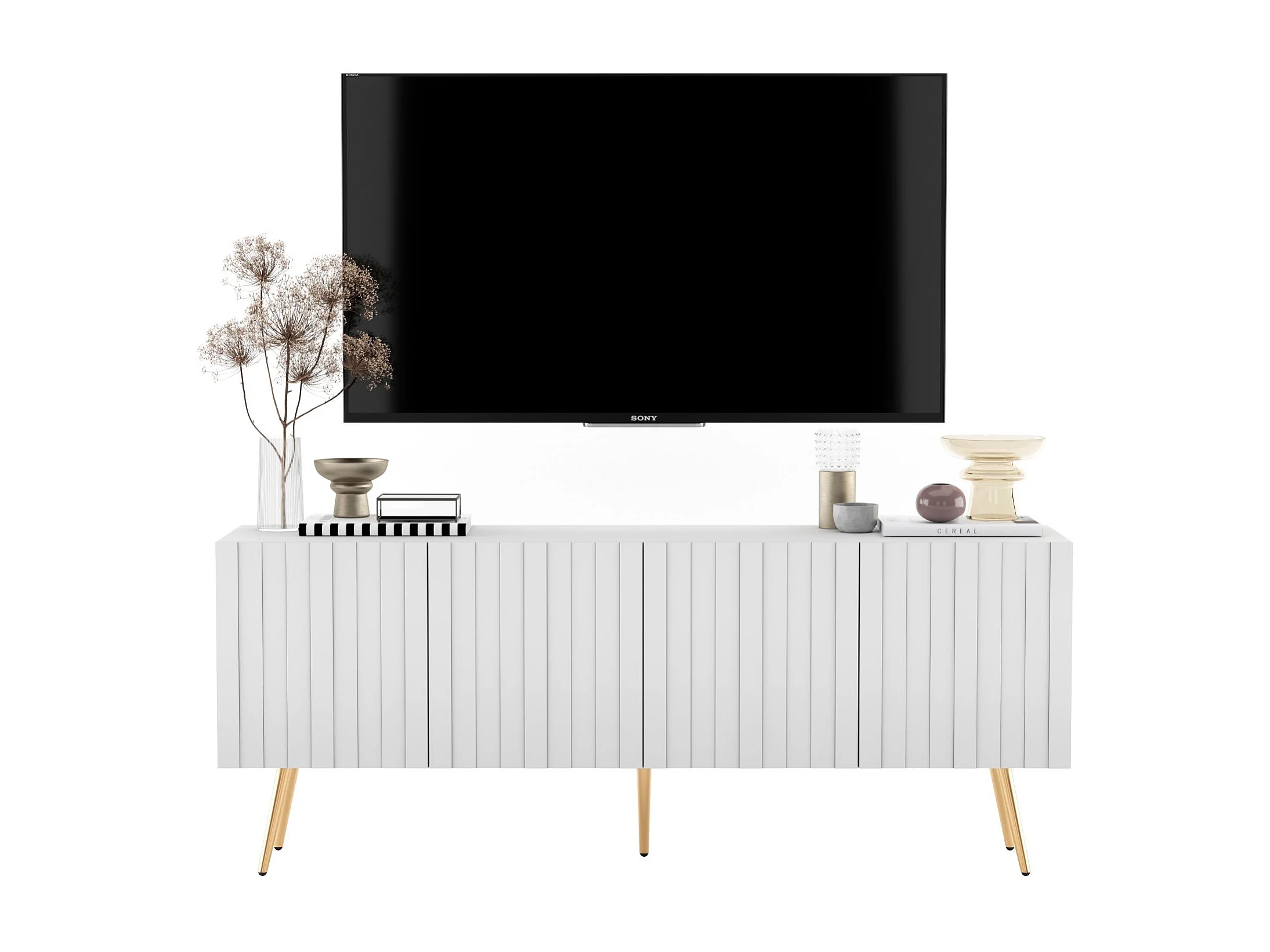Meuble TV avec 4 portes - Corps Blanc mat, façades rainurées Blanc mat - 150 cm, pieds dorés