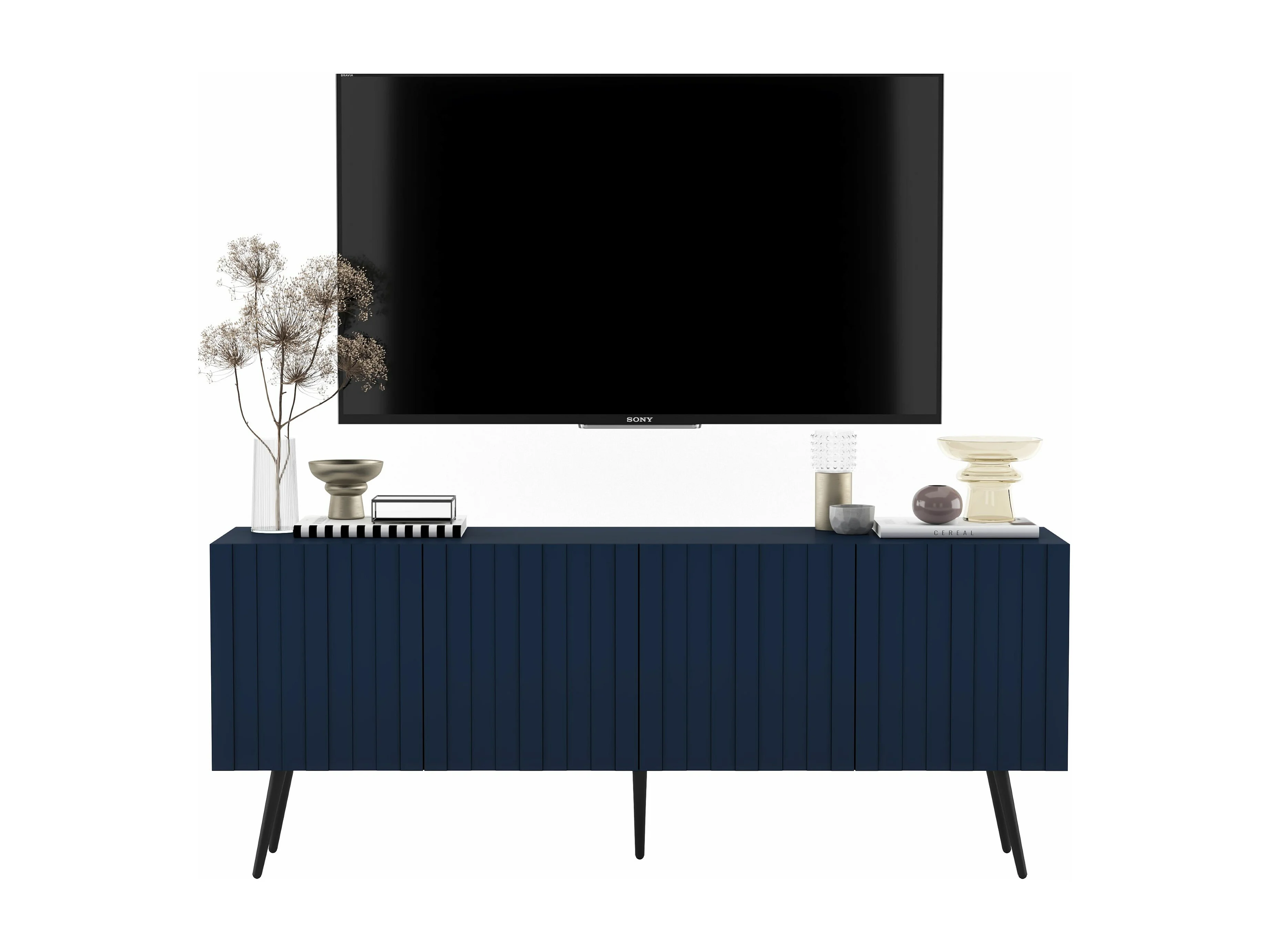Meuble TV avec 4 portes - Corps Bleu marine mat, façades rainurées Bleu marine mat - 150 cm, pieds dorés