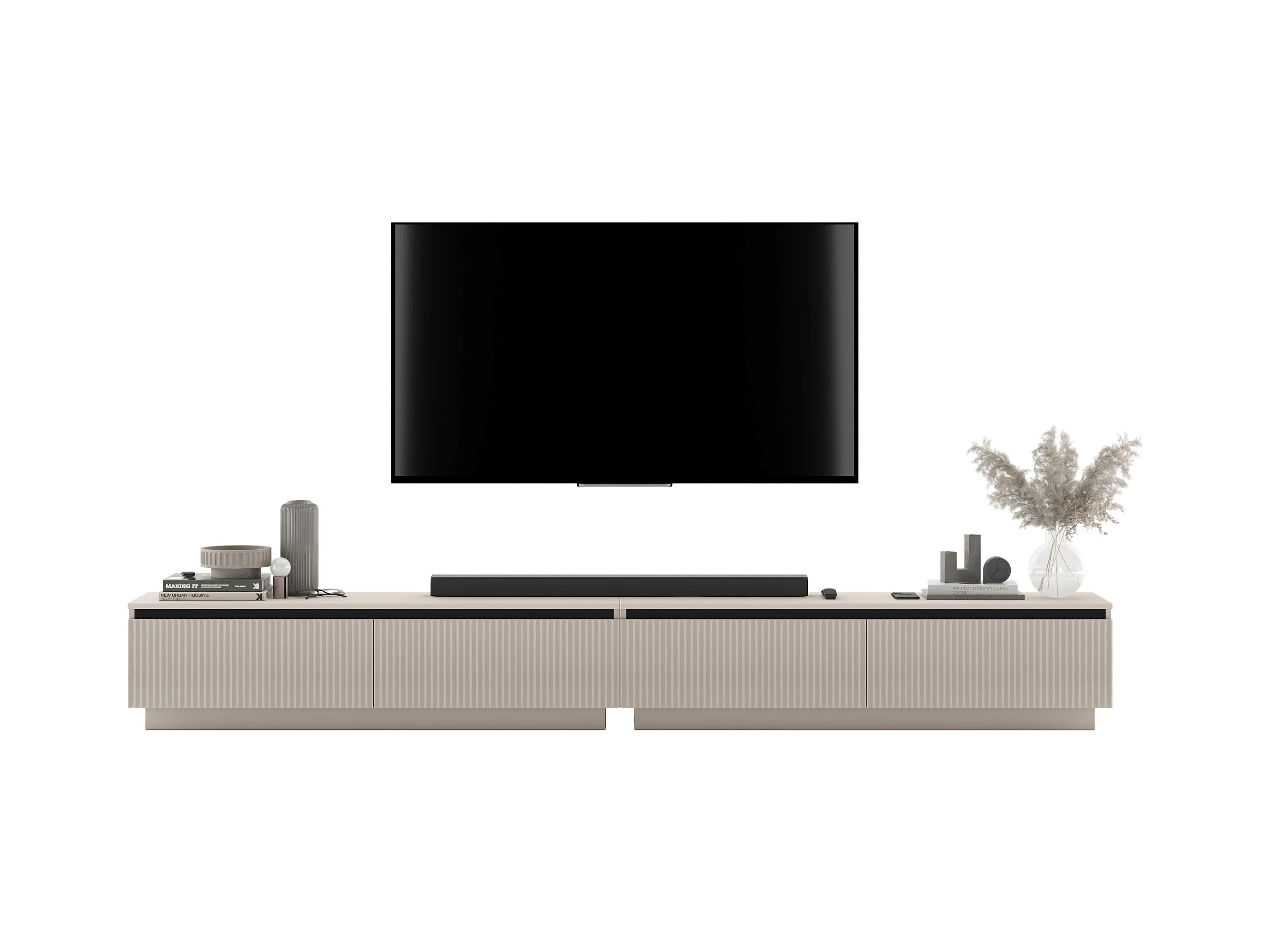 Meuble TV avec 4 portes - Corps Cachemire mat, façades rainurées Cachemire mat - 280 cm, sur socle