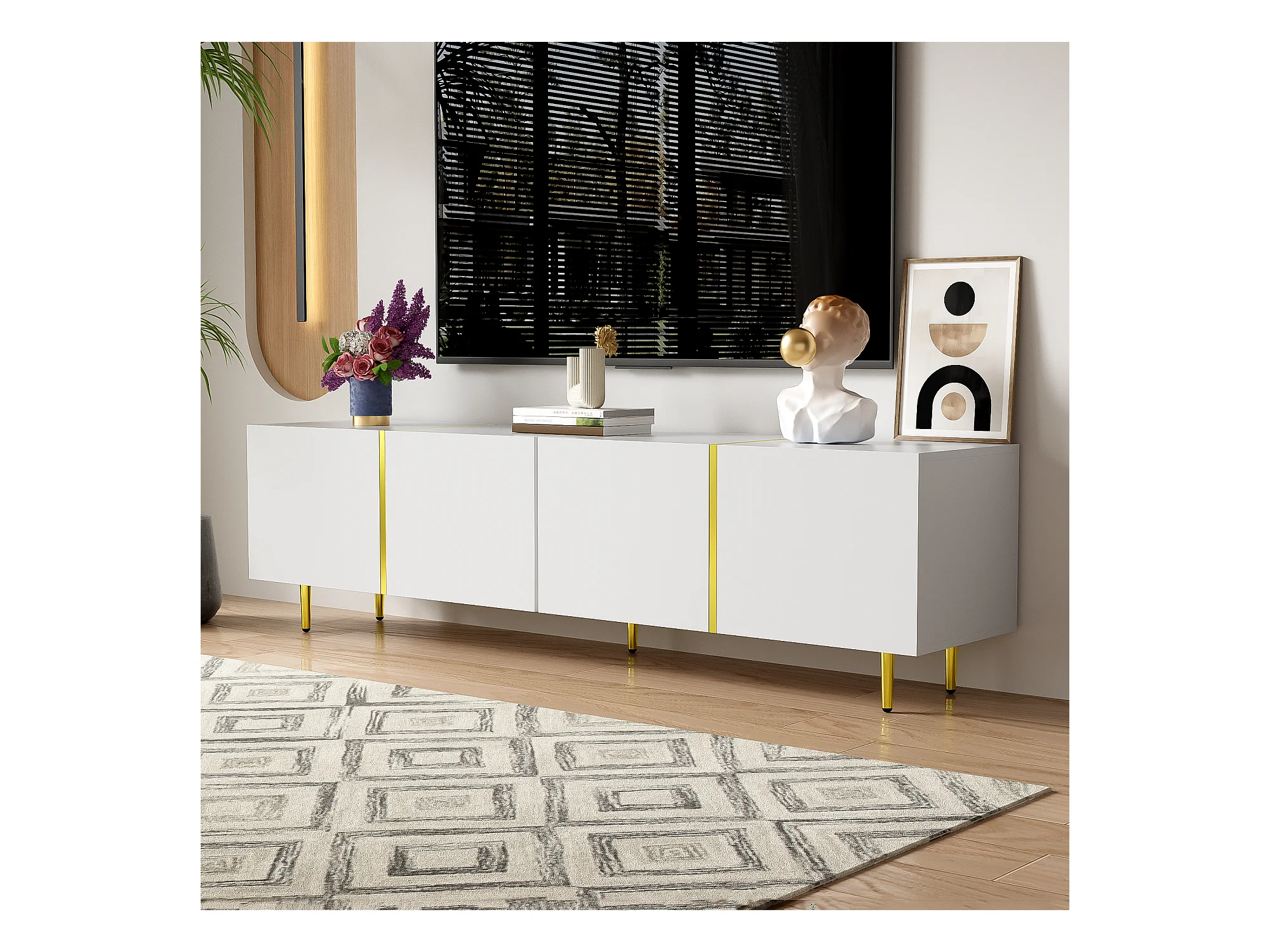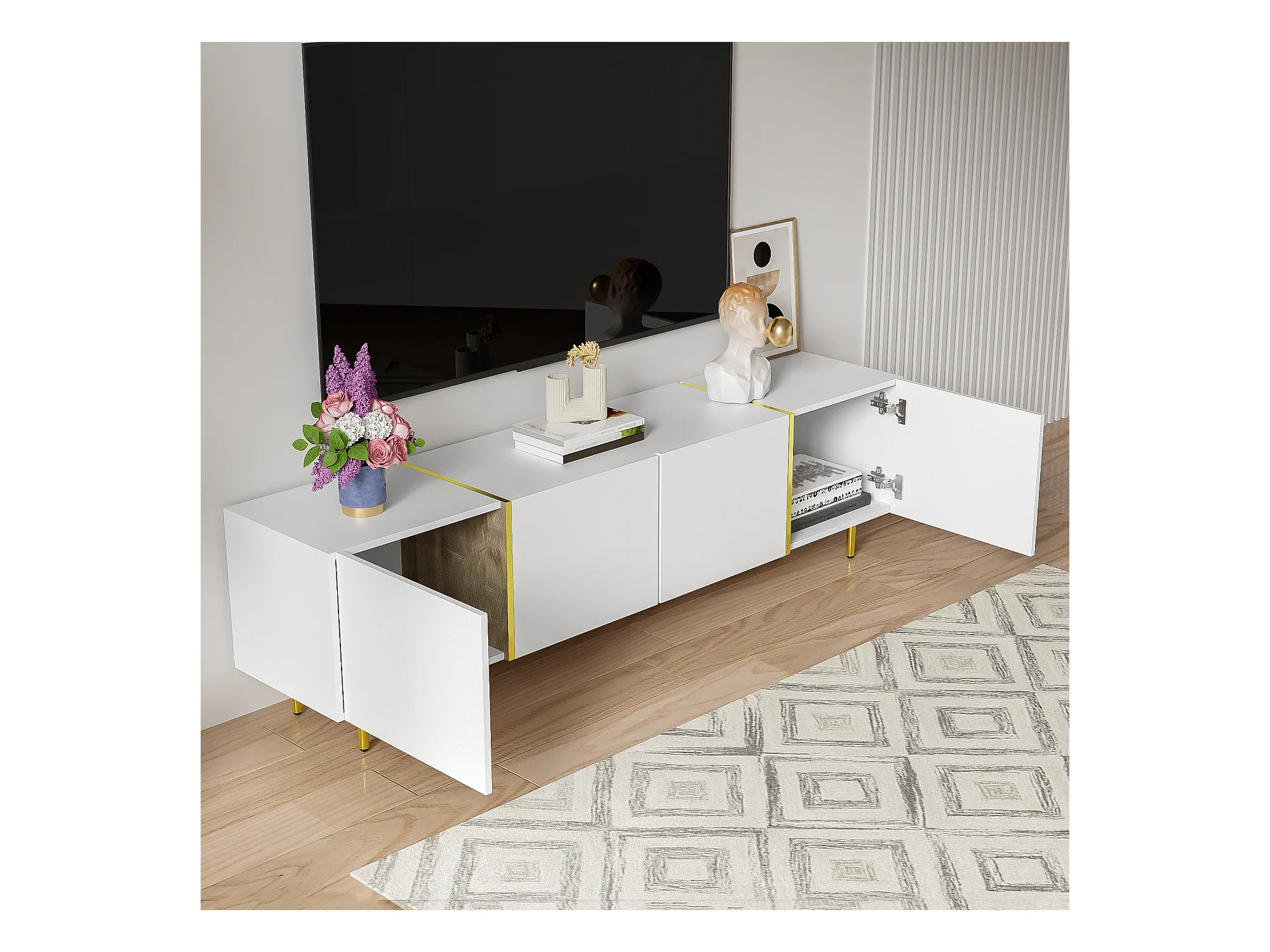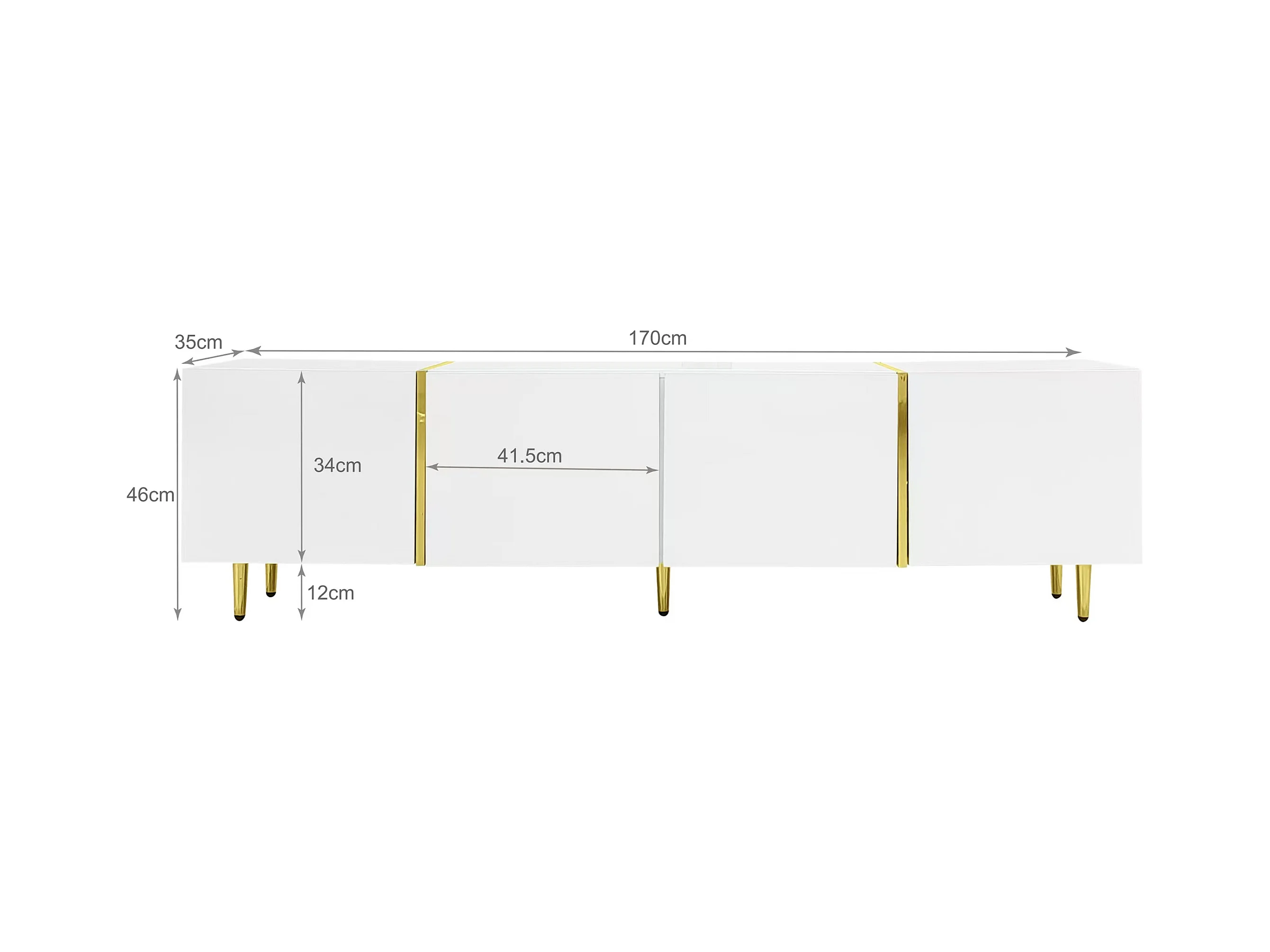 Meuble TV avec 4 portes, corps en blanc laqué brillant et bande doré - 170x35x46cm