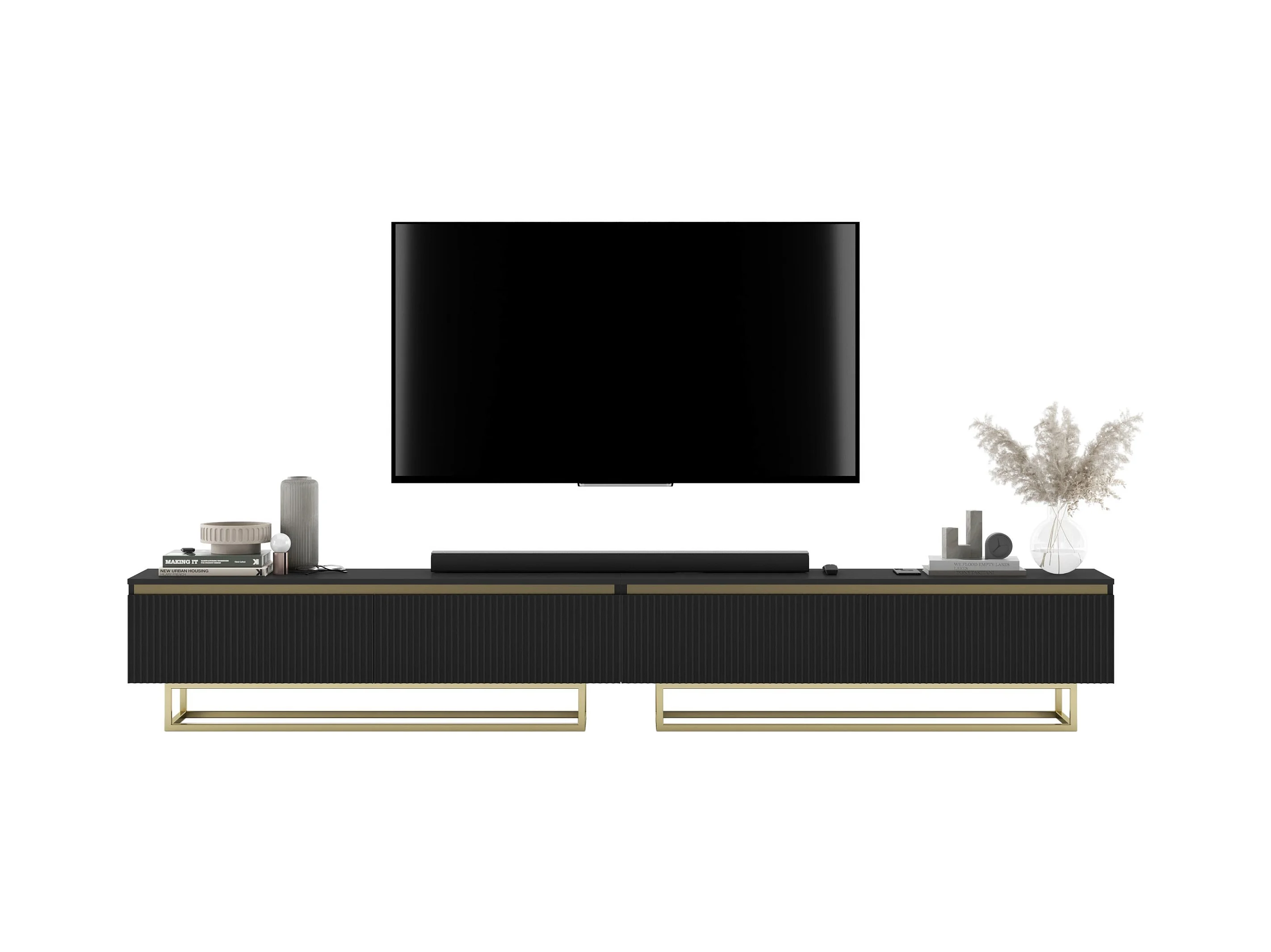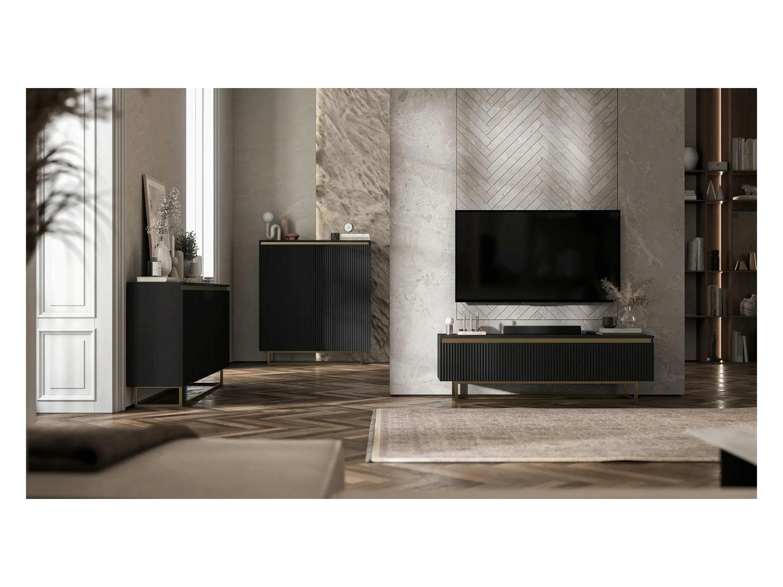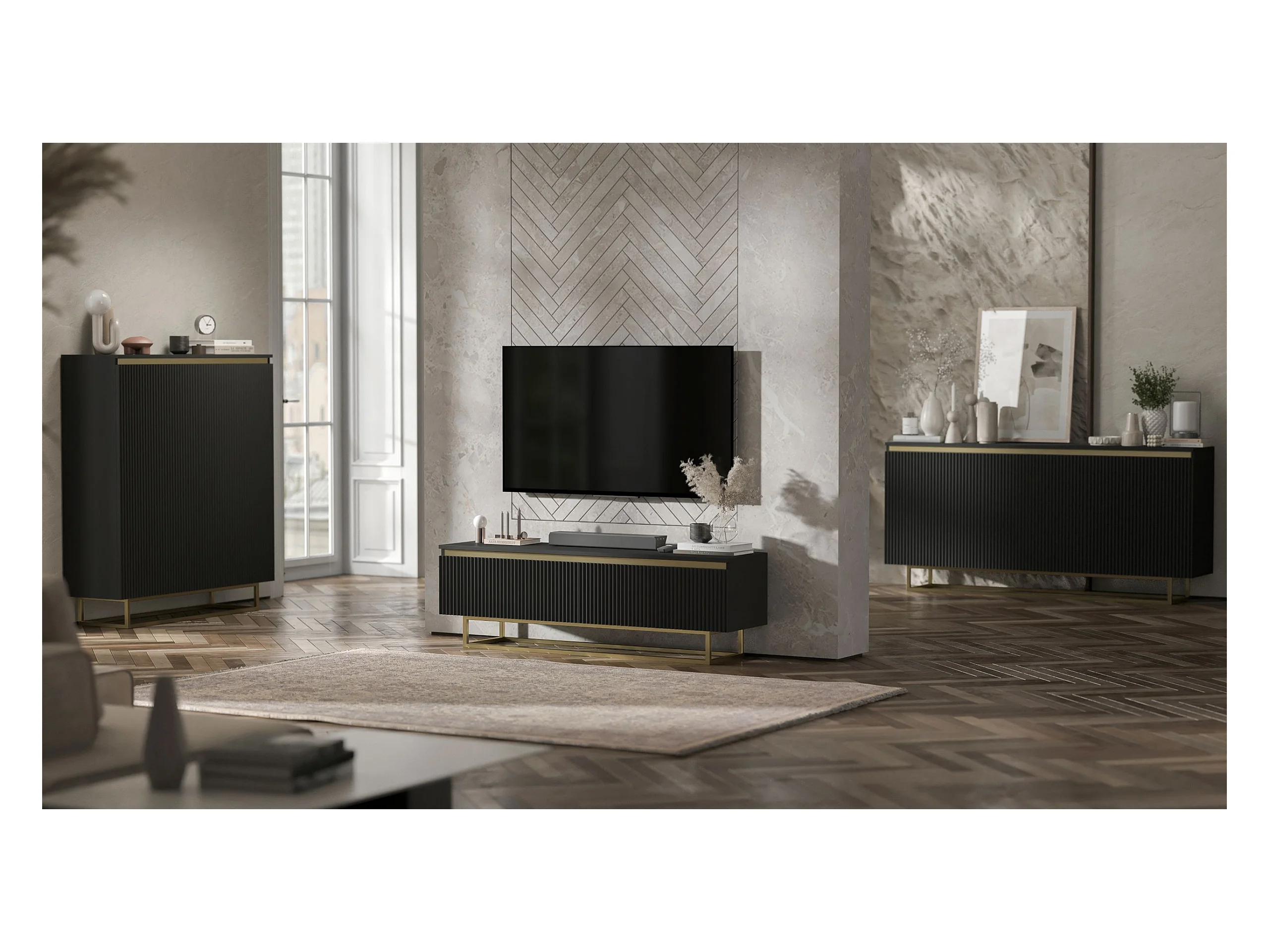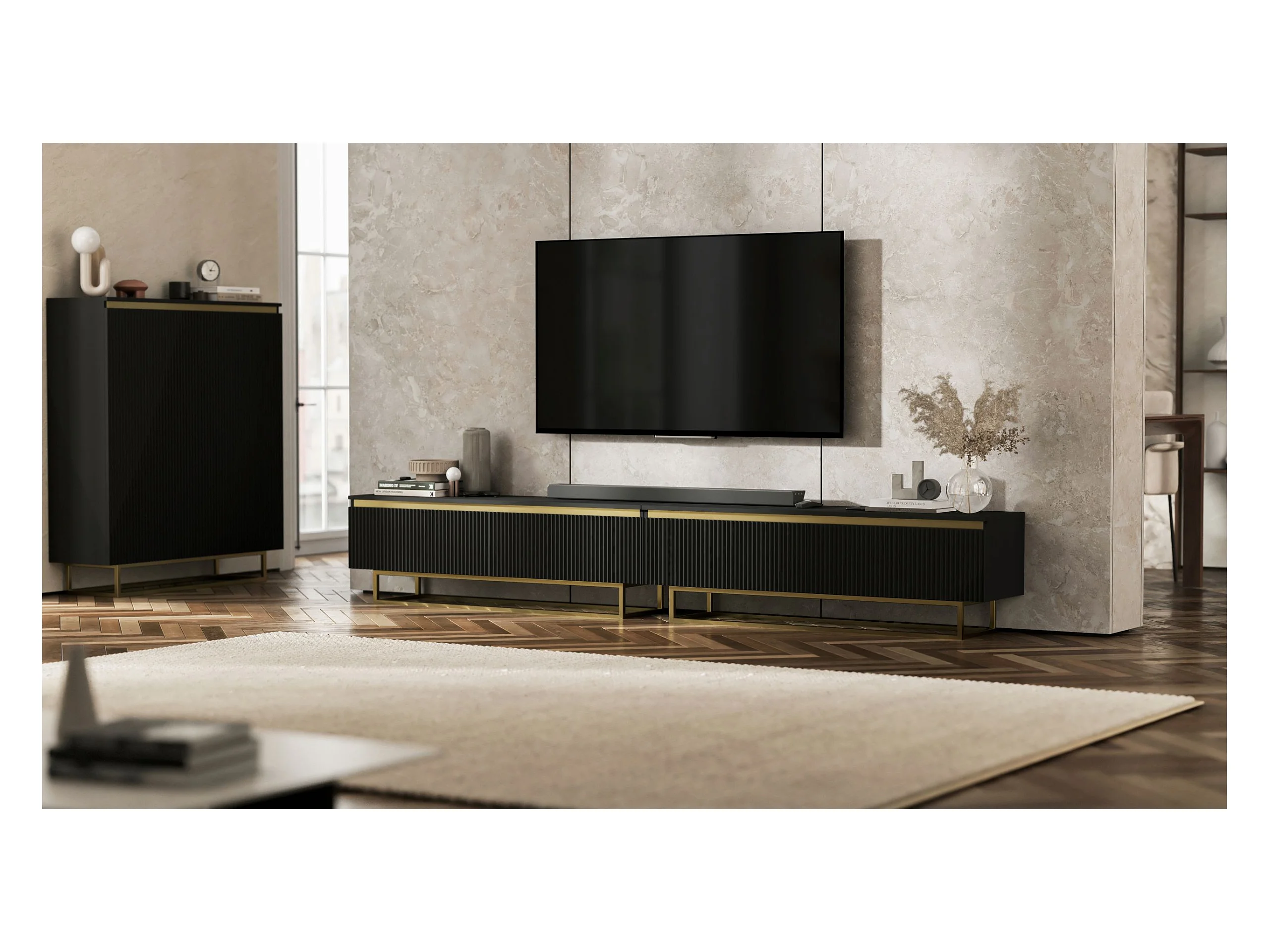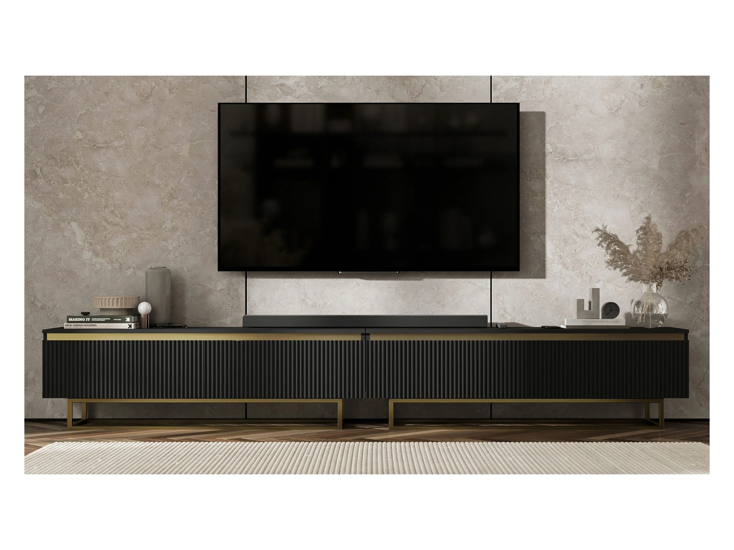 Meuble TV avec 4 portes - Corps Noir mat, façades rainurées Noir mat - 280 cm, Cadre en métal doré