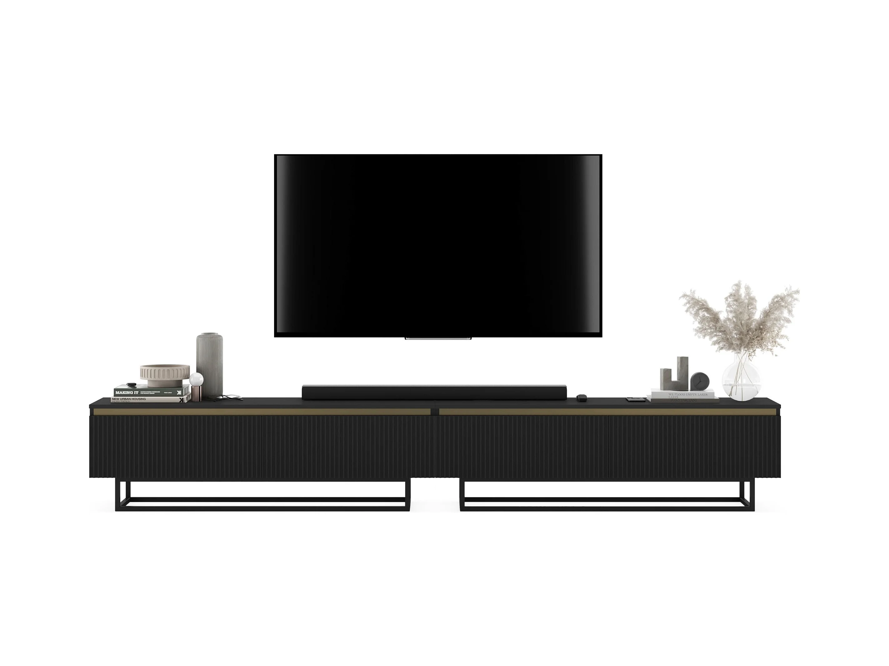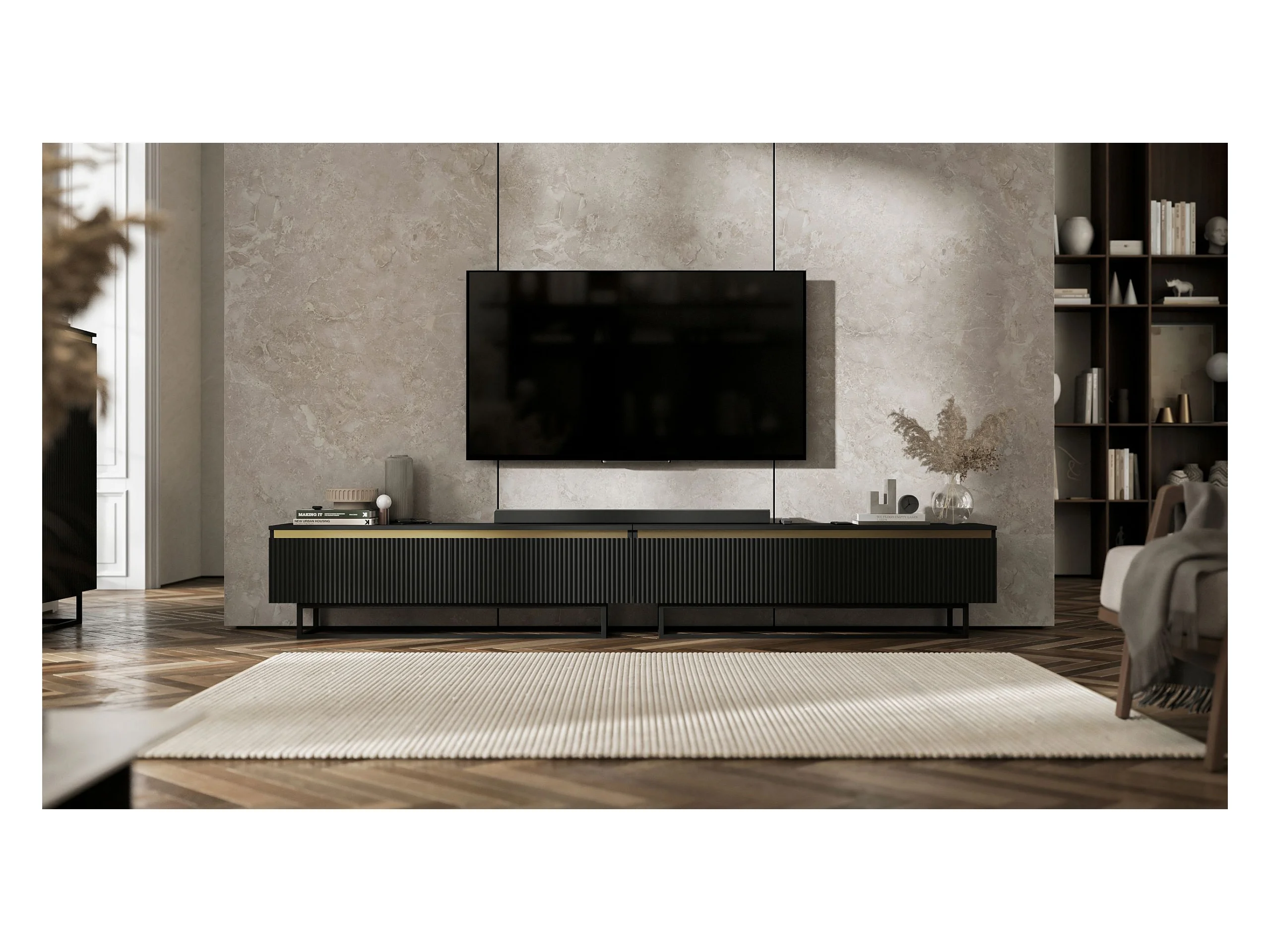 Meuble TV avec 4 portes - Corps Noir mat, façades rainurées Noir mat - 280 cm, Cadre en métal noir