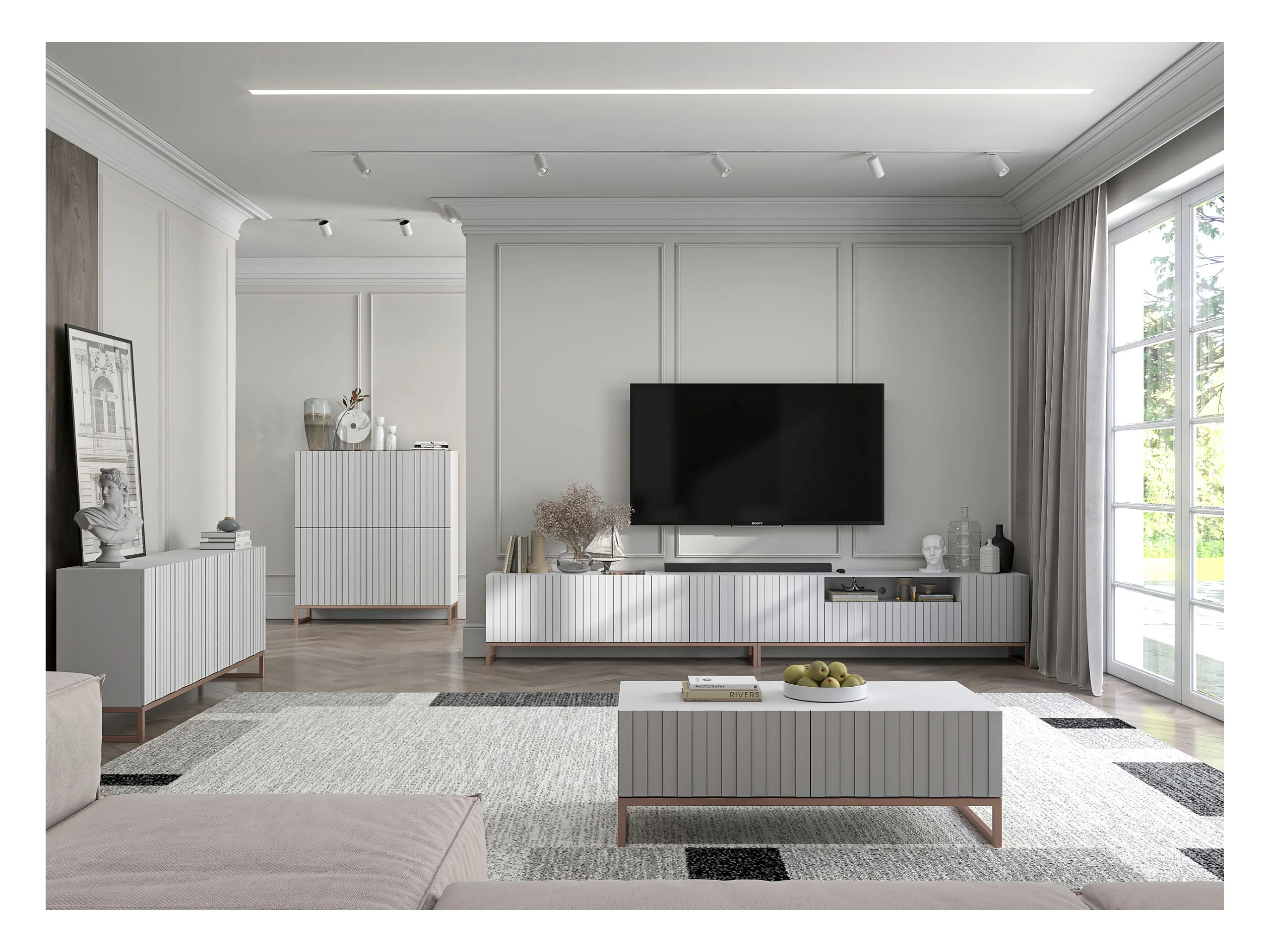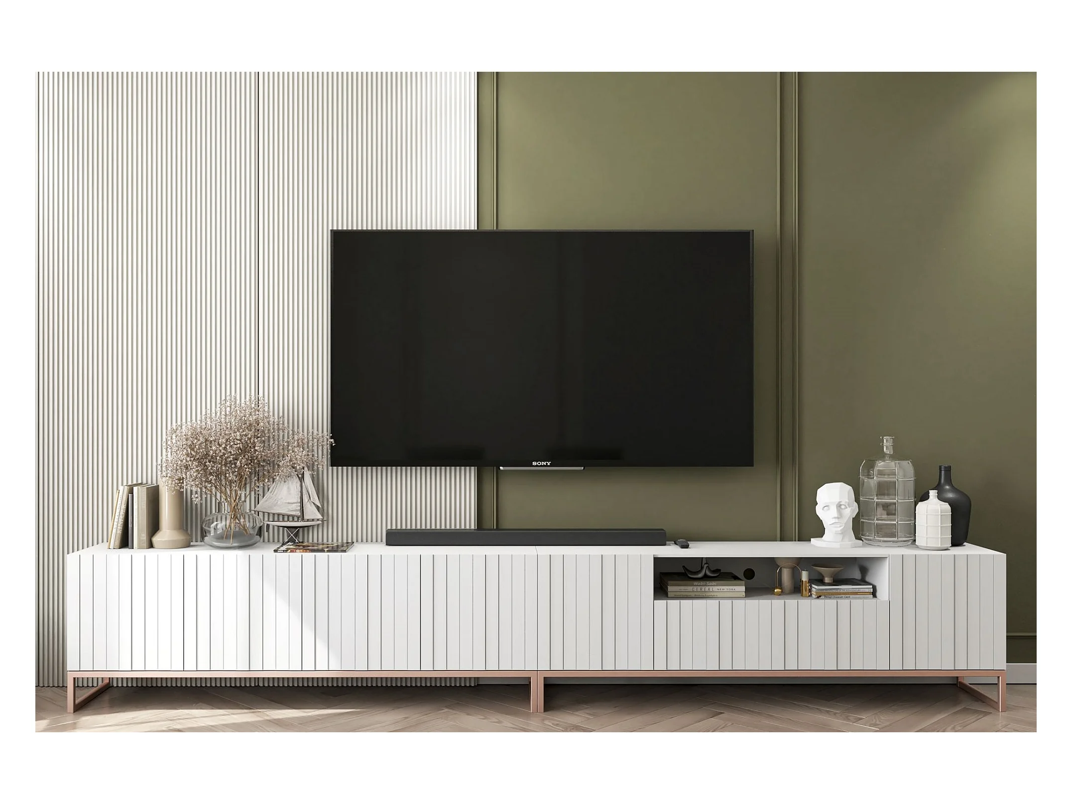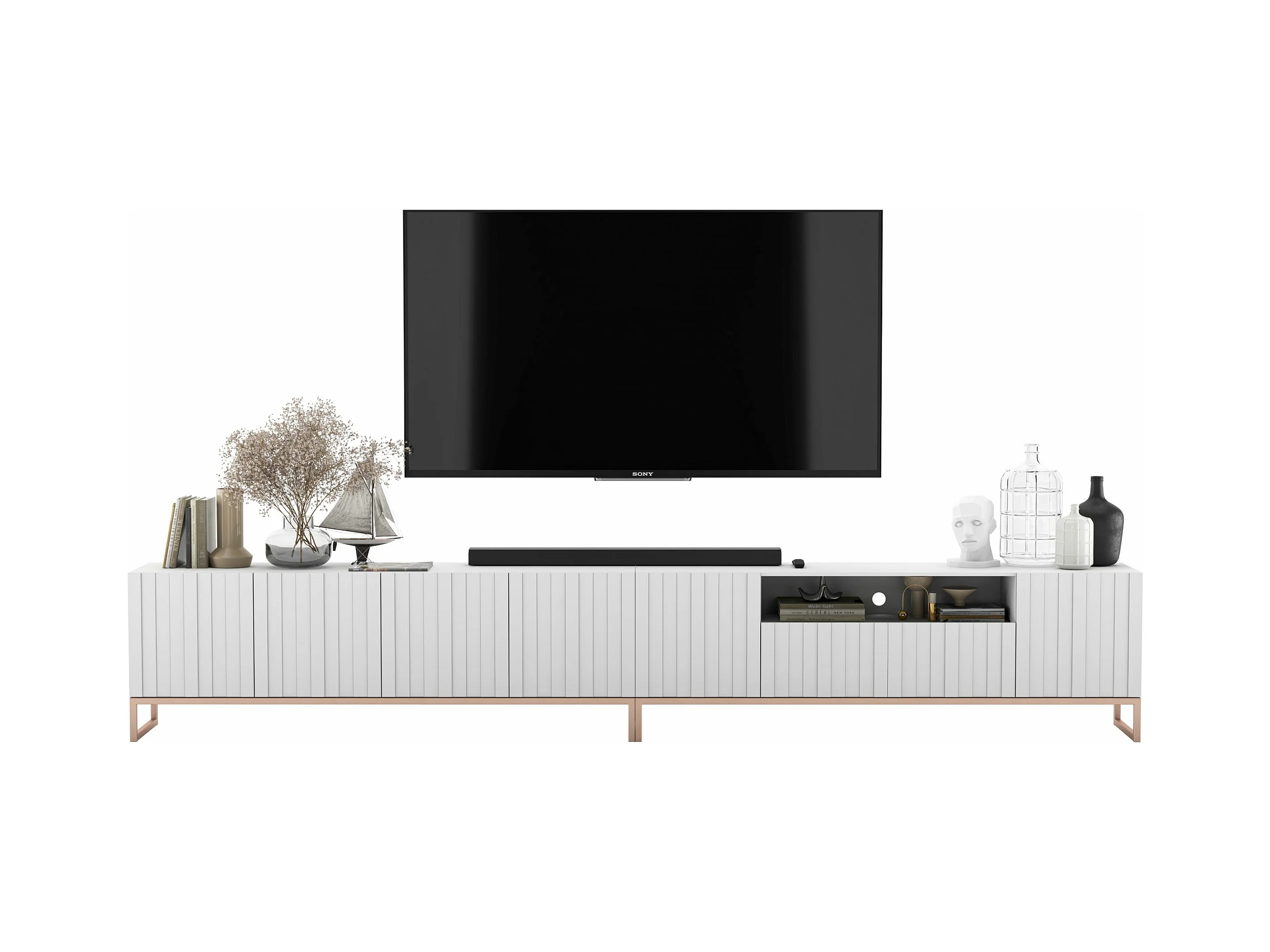 Meuble TV avec 7 portes et niche - corps Blanc mat, façades cannelées Blanc mat - 300 cm, cadre en métal
