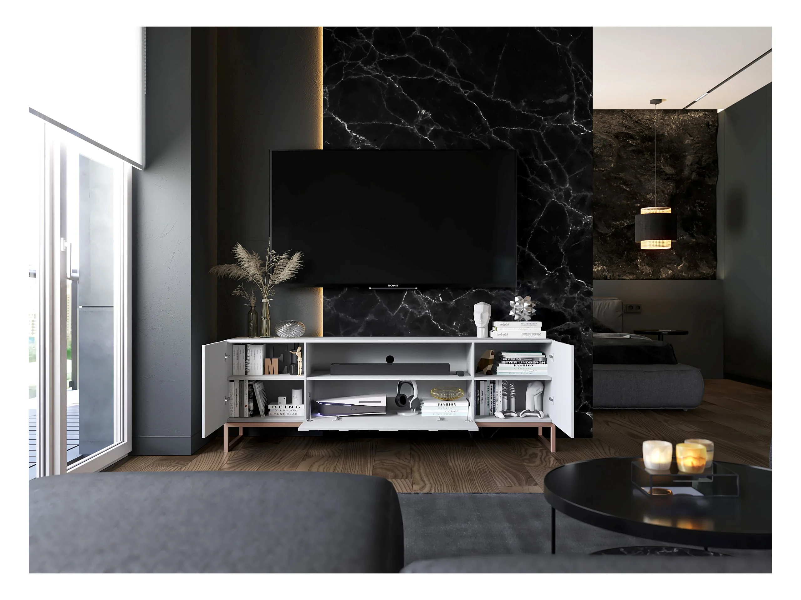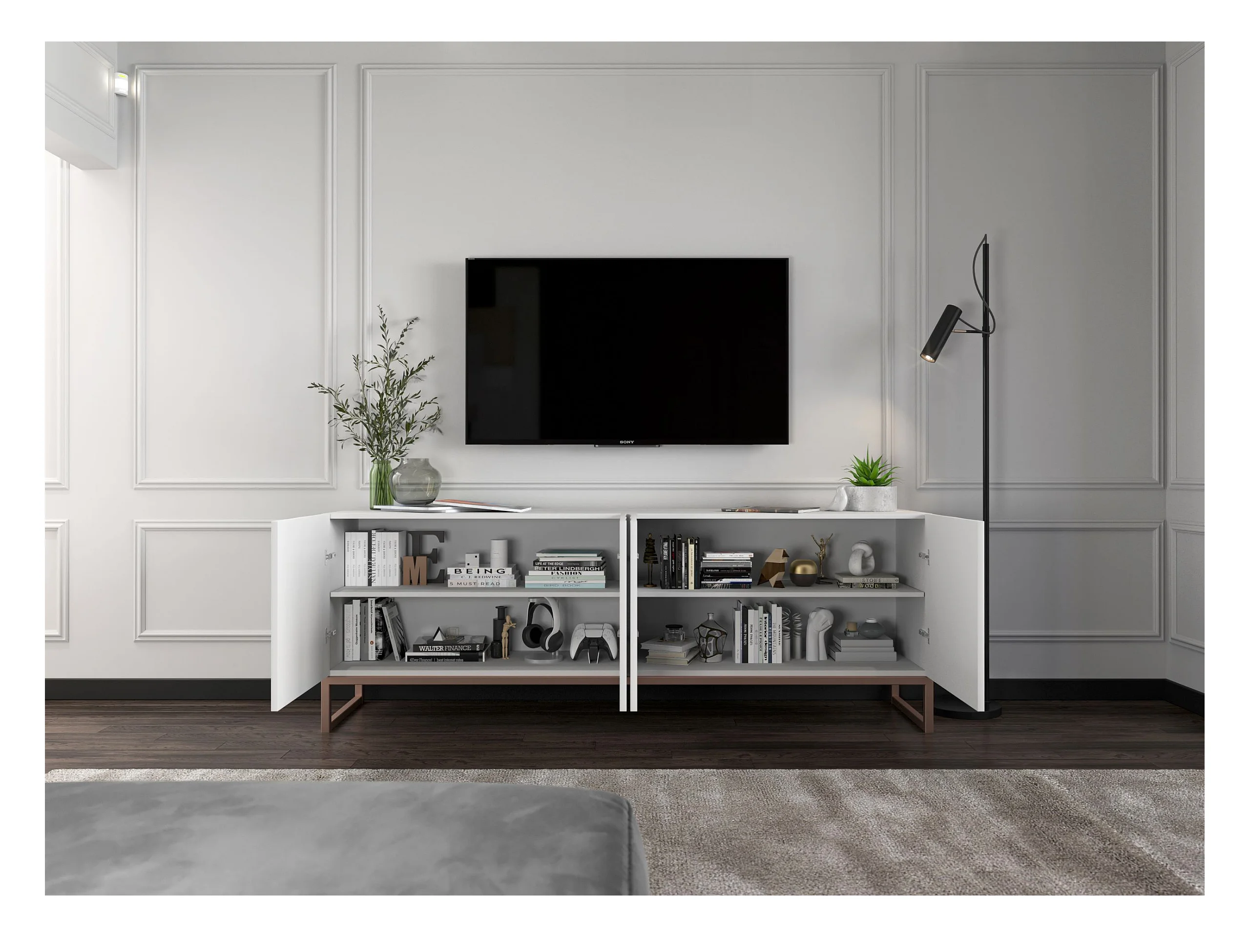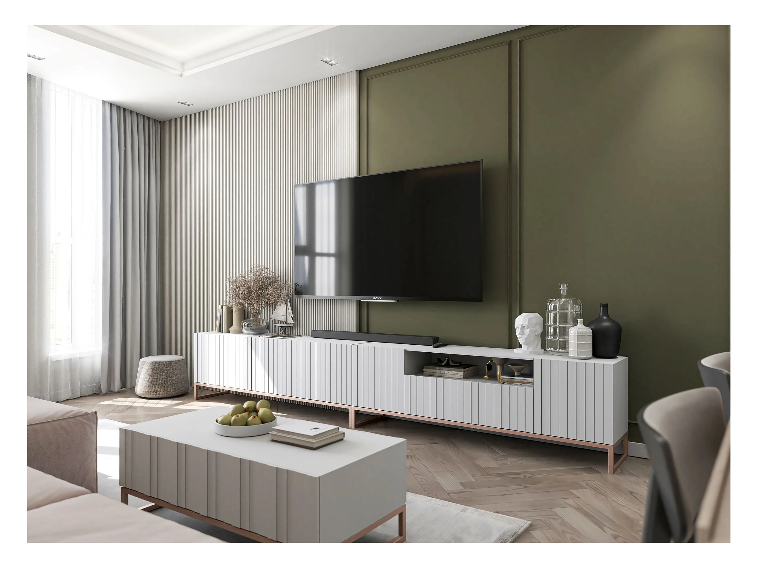 Meuble TV avec 7 portes et niche - corps Blanc mat, façades cannelées Blanc mat - 300 cm, cadre en métal