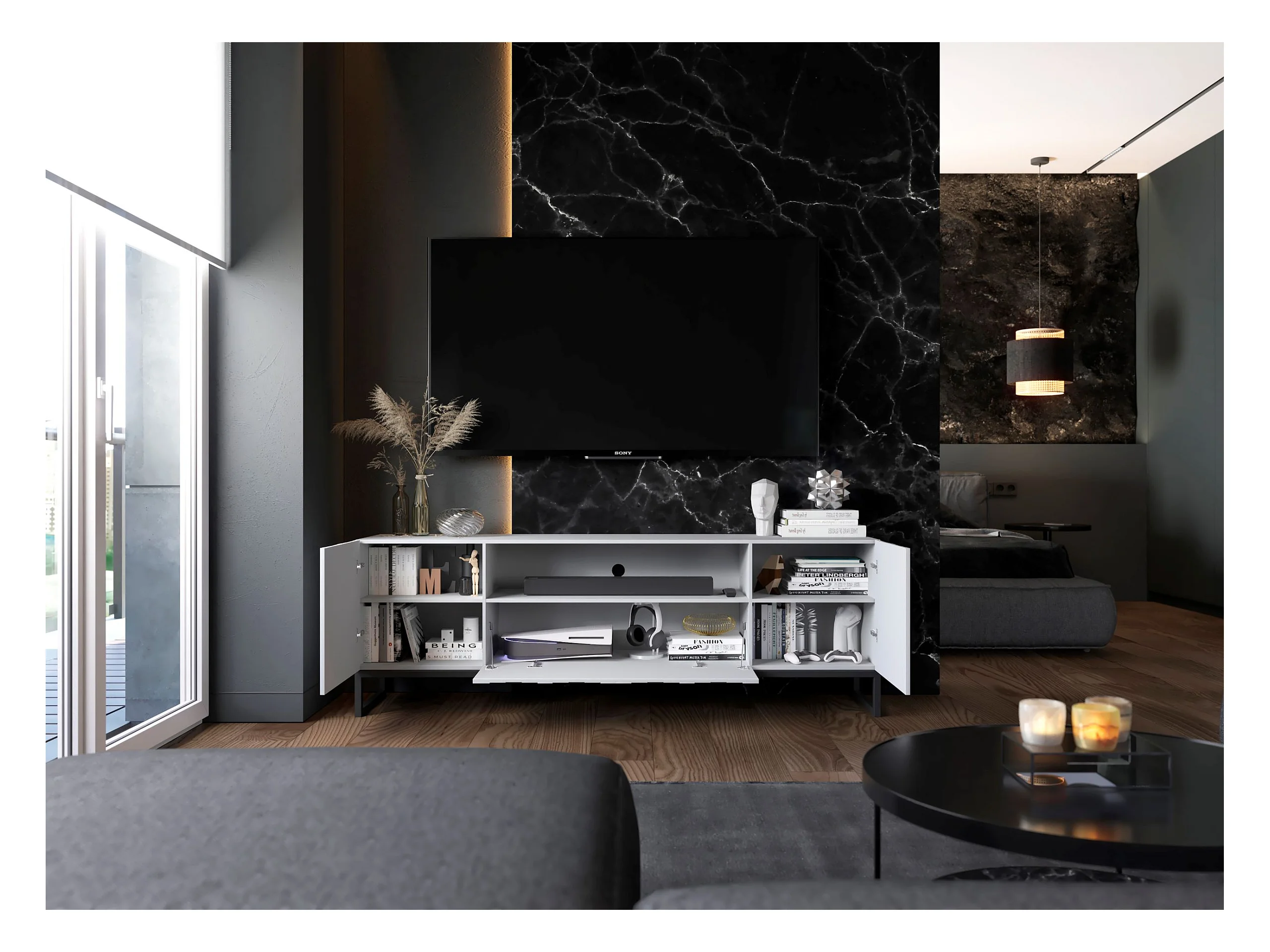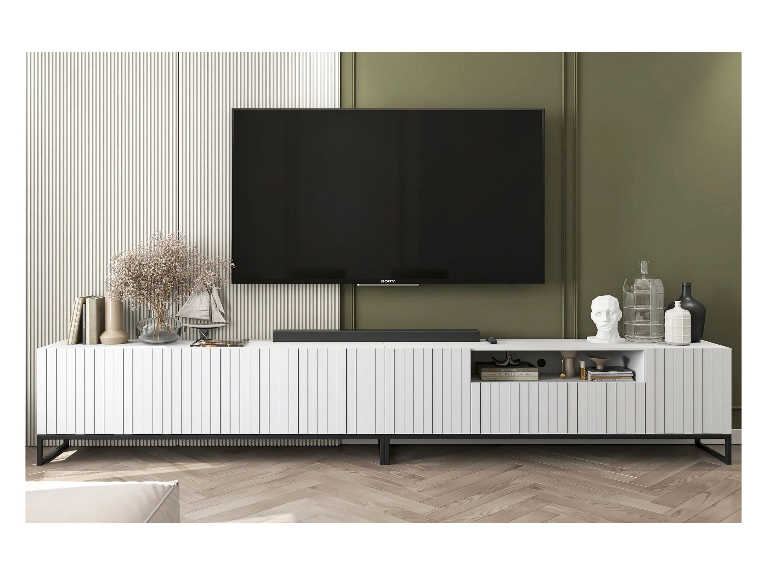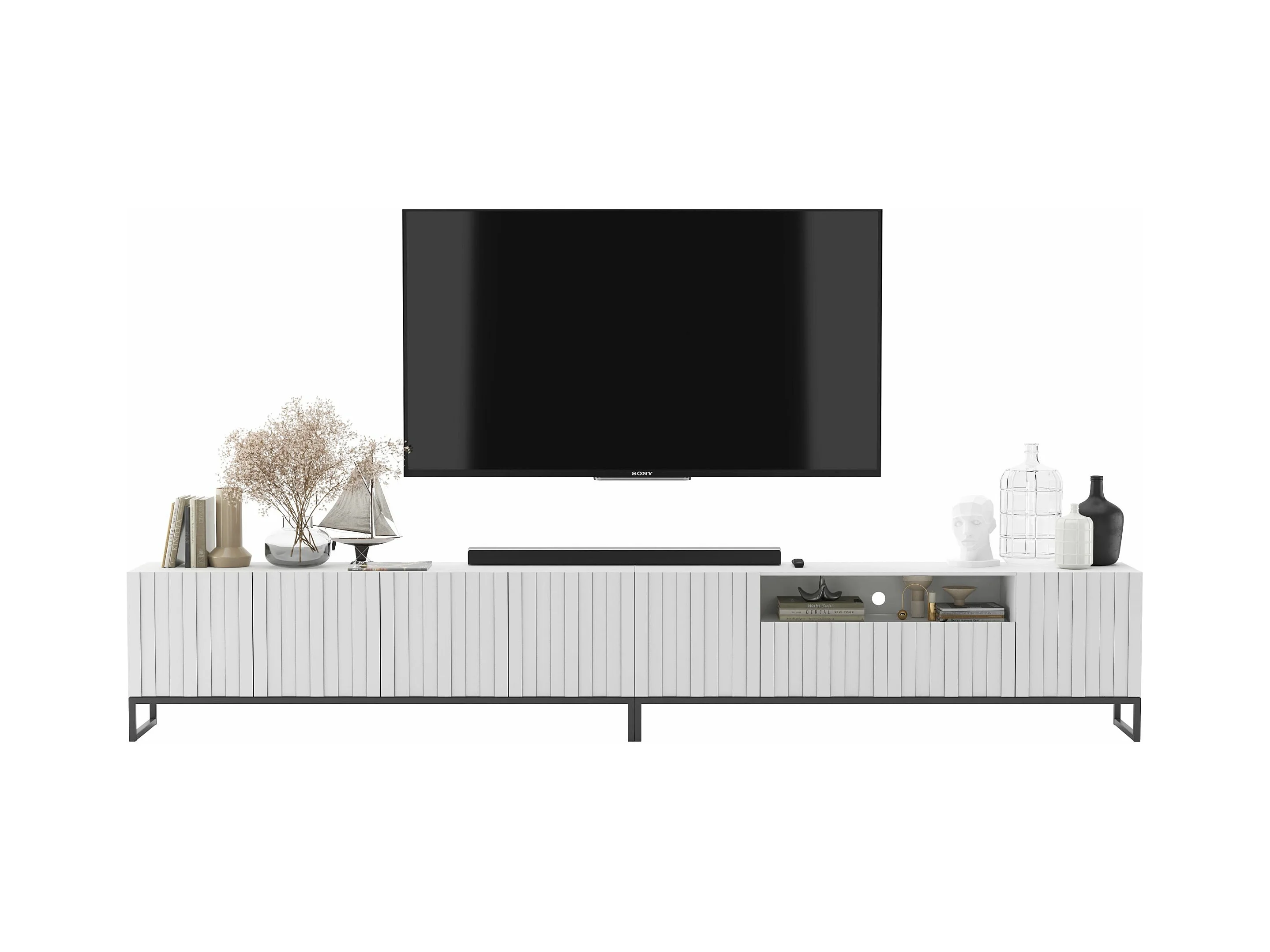 Meuble TV avec 7 portes et niche - corps Blanc mat, façades cannelées Blanc mat - 300 cm, Cadre en métal noir