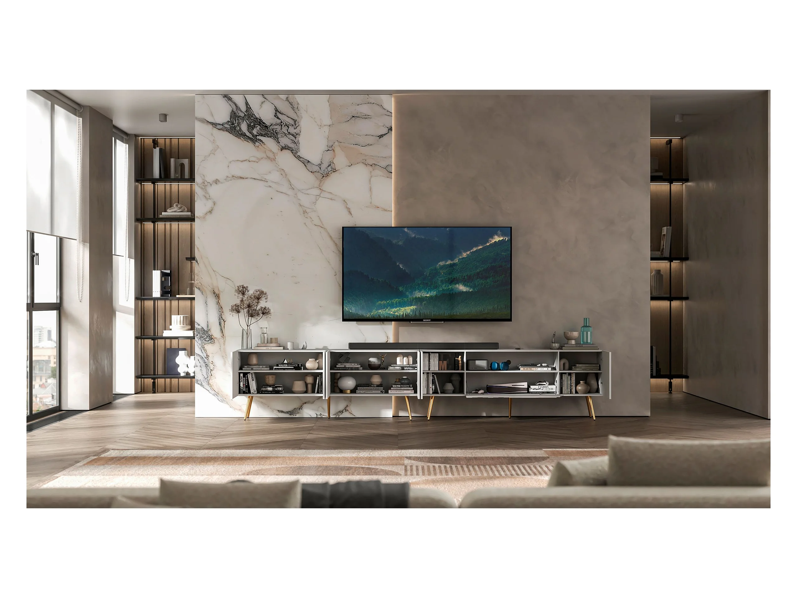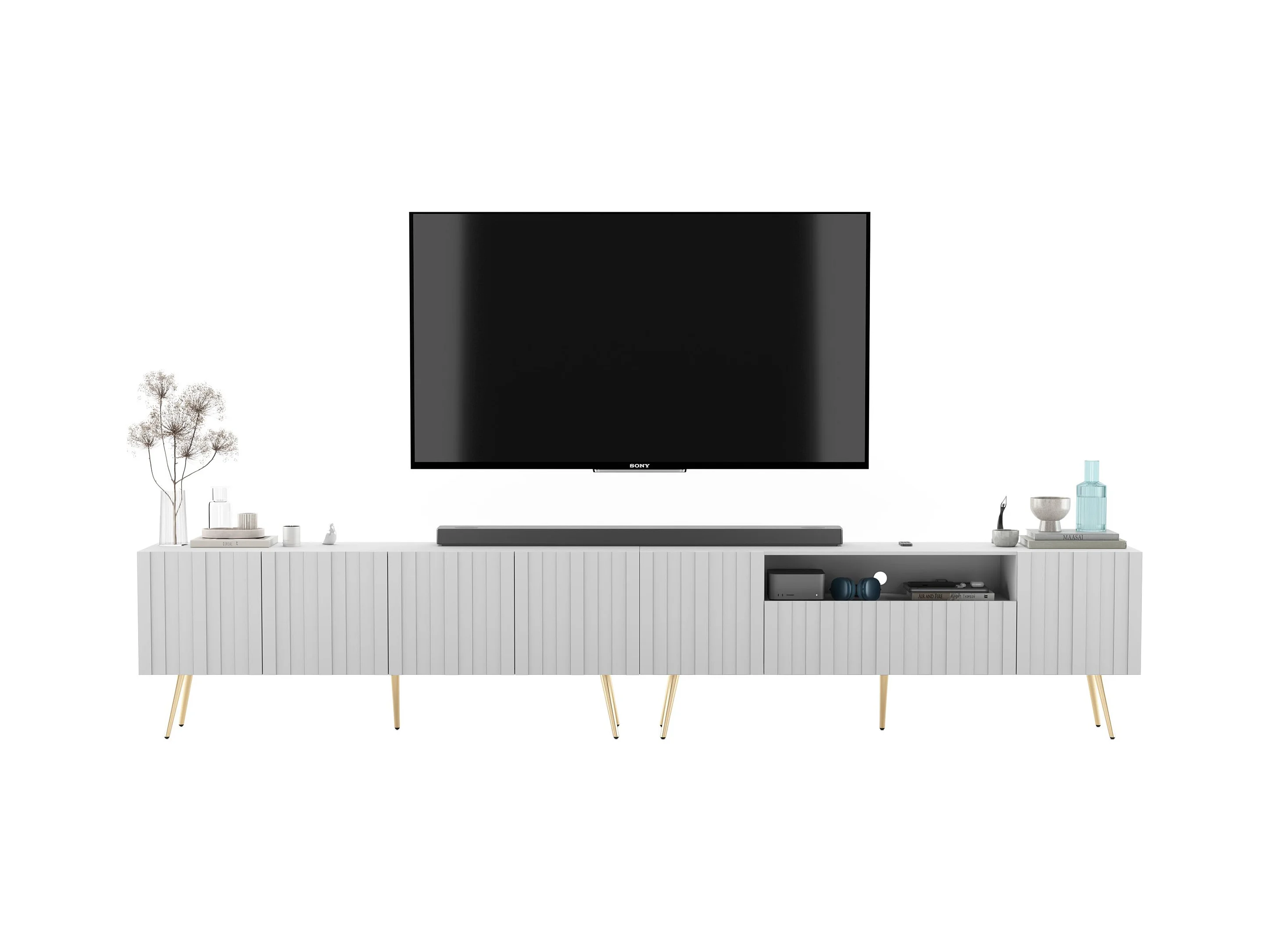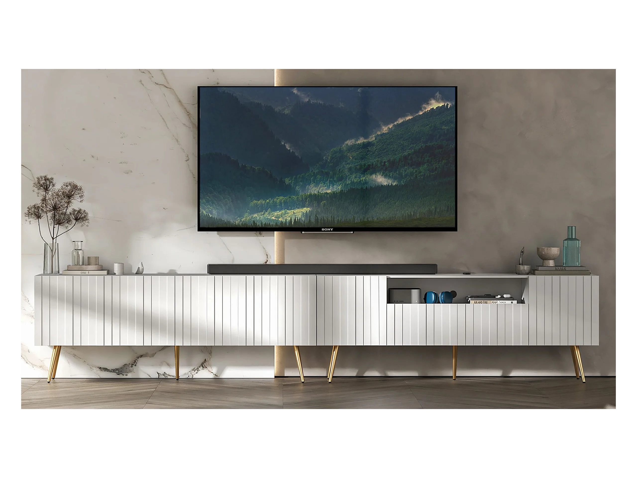 Meuble TV avec 7 portes et niche - Corps blanc mat, façades rainurées blanc mat - 300 cm, pieds dorés