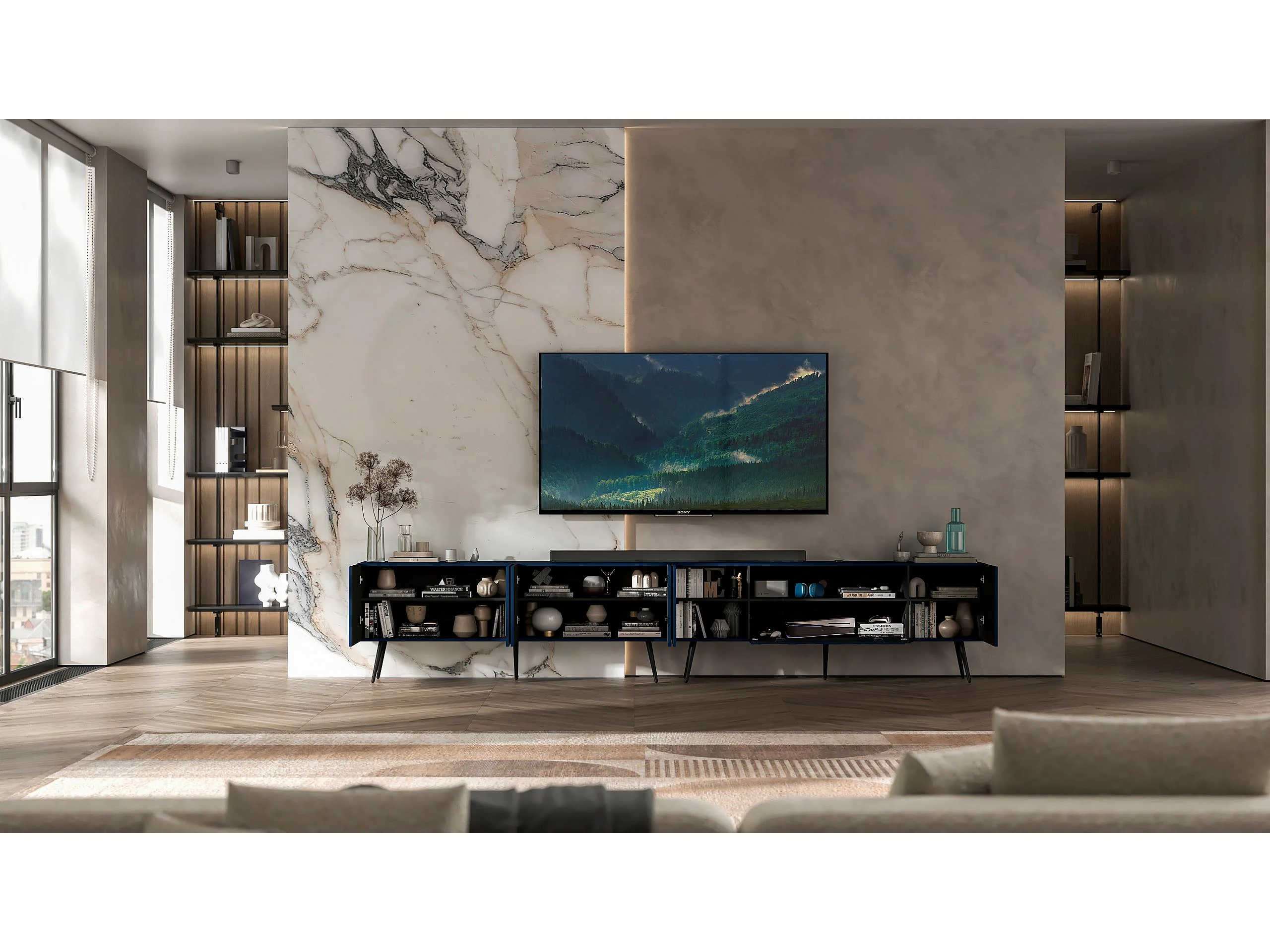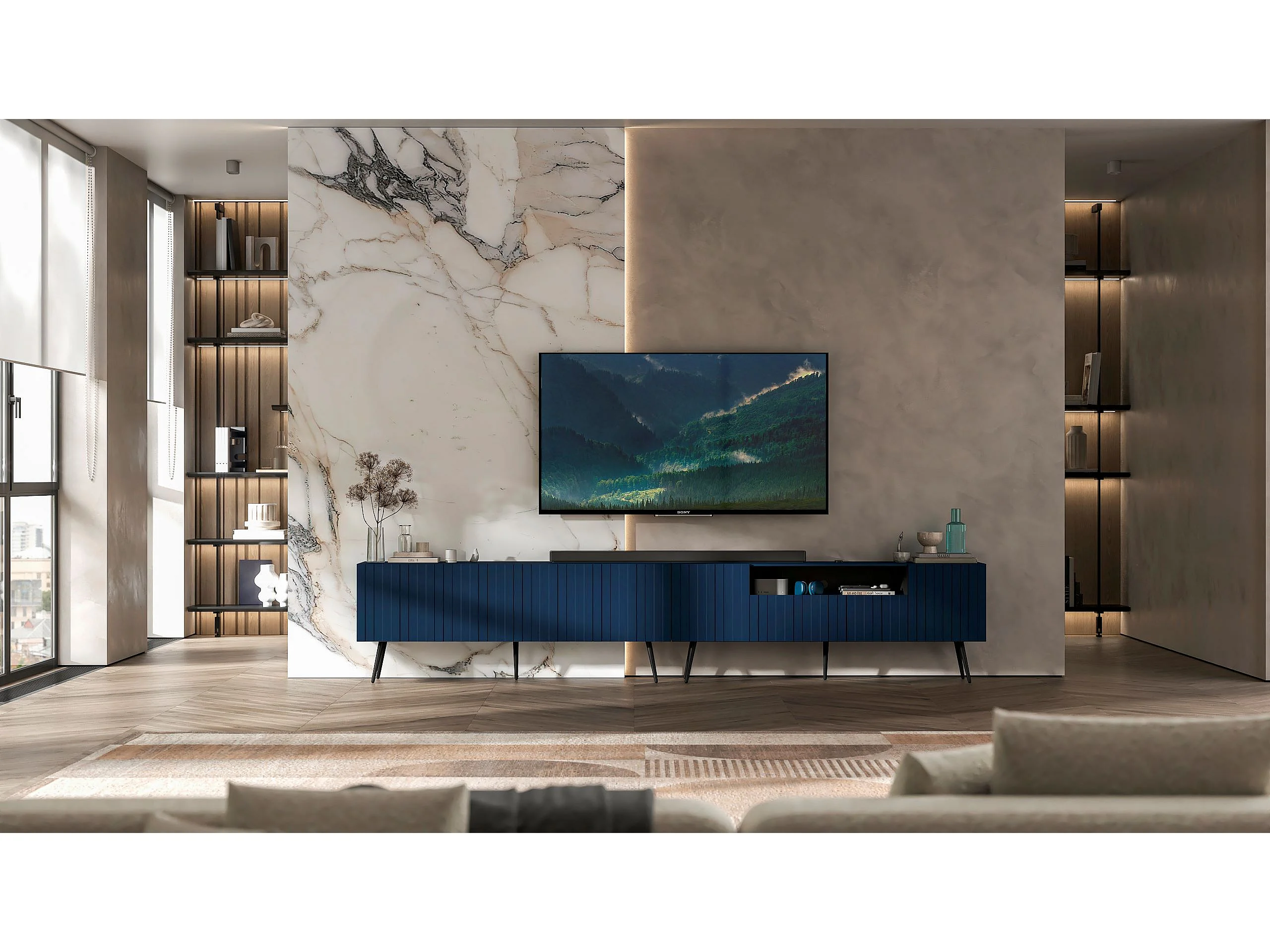 Meuble TV avec 7 portes et niche - Corps bleu marine mat, façades rainurées bleu marine mat - 300 cm, pieds noirs