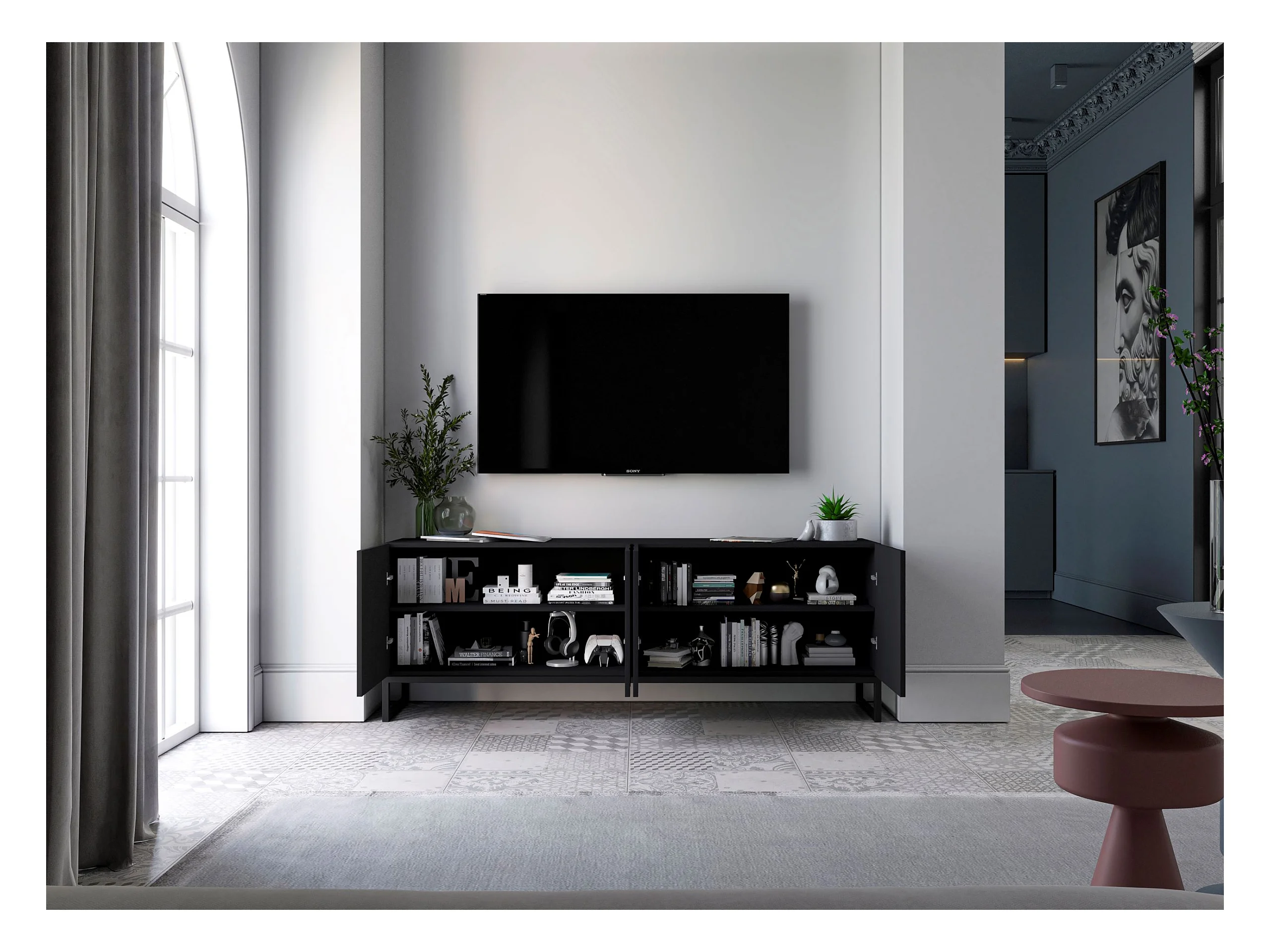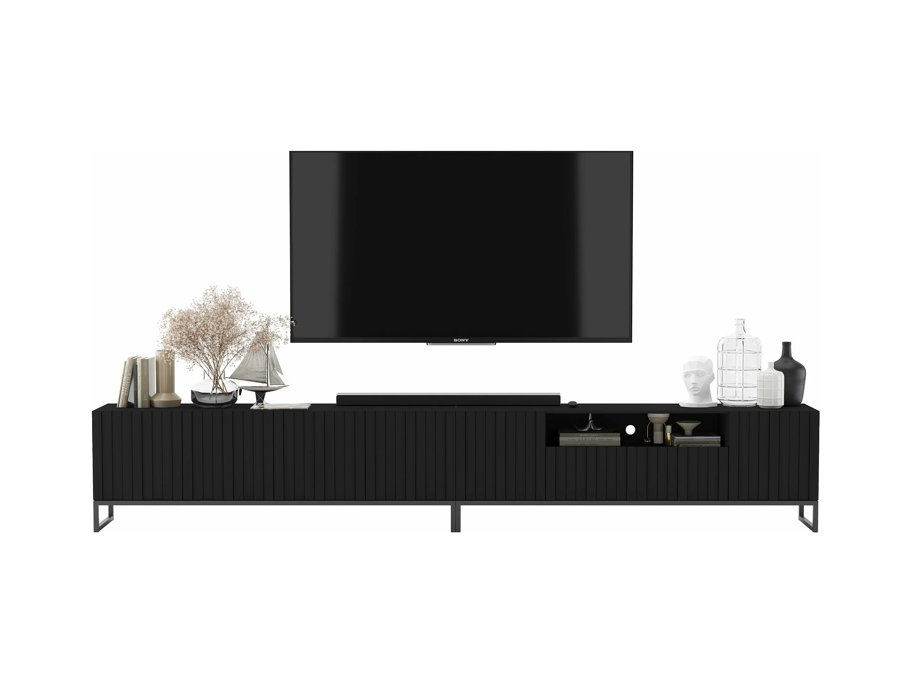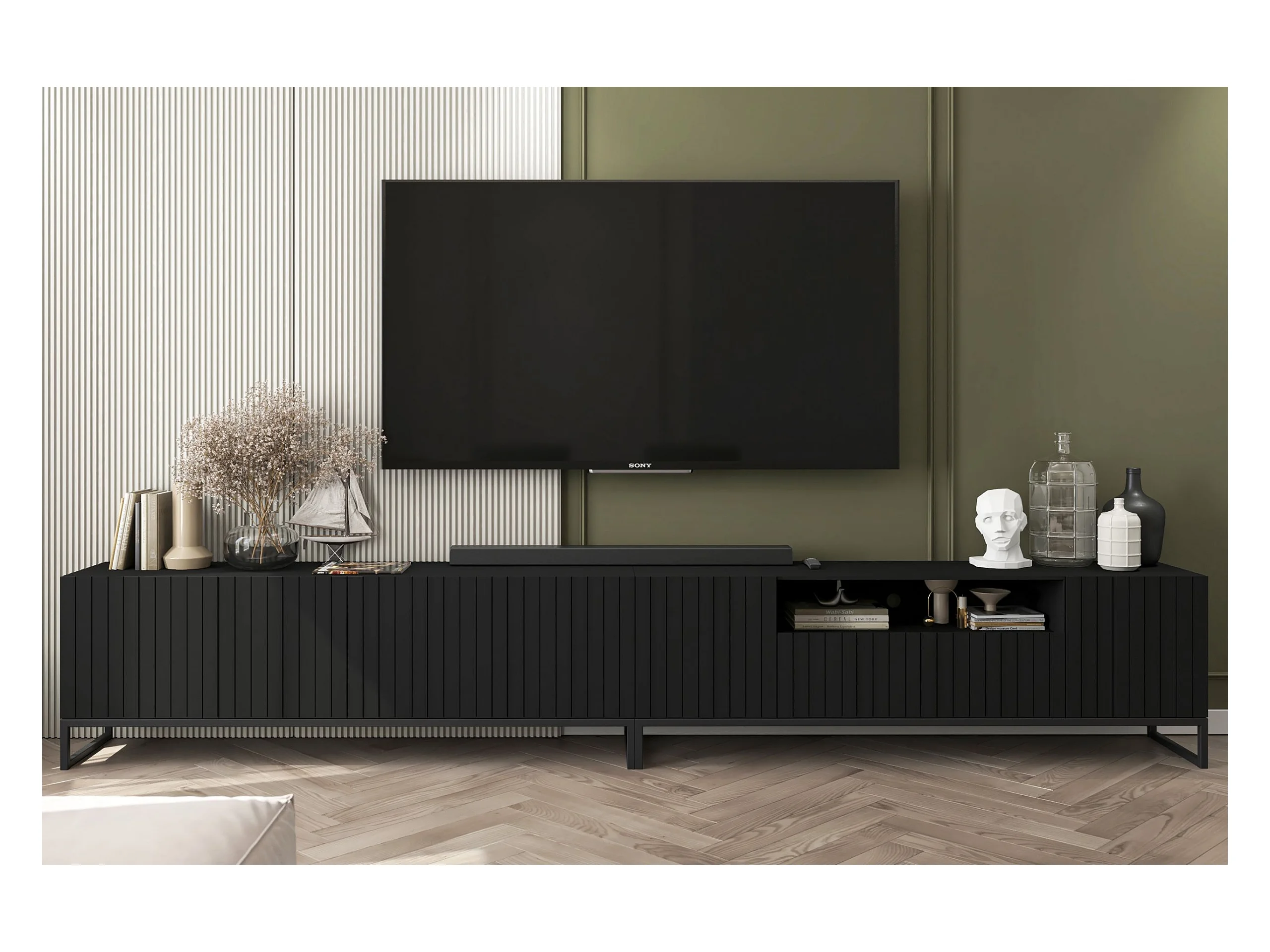 Meuble TV avec 7 portes et niche - corps Noir mat, façades cannelées Noir mat - 300 cm, Cadre en métal noir