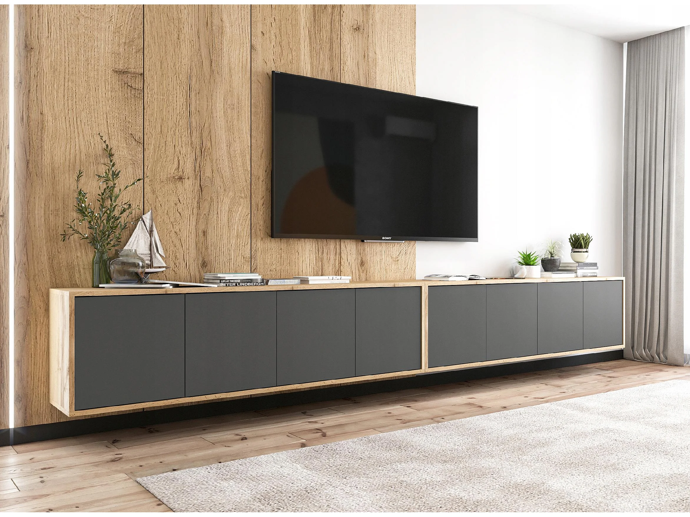 Meuble TV avec 8 portes - carcasse chêne wotan façades graphite mat - 300 cm