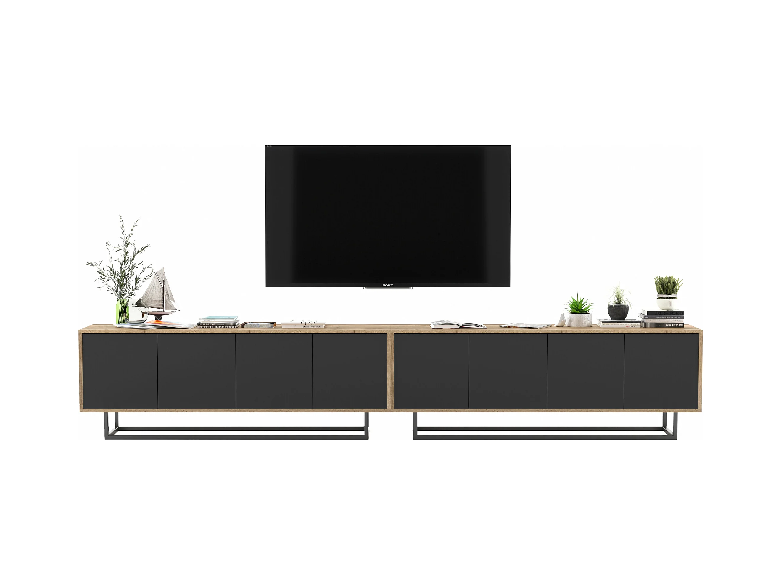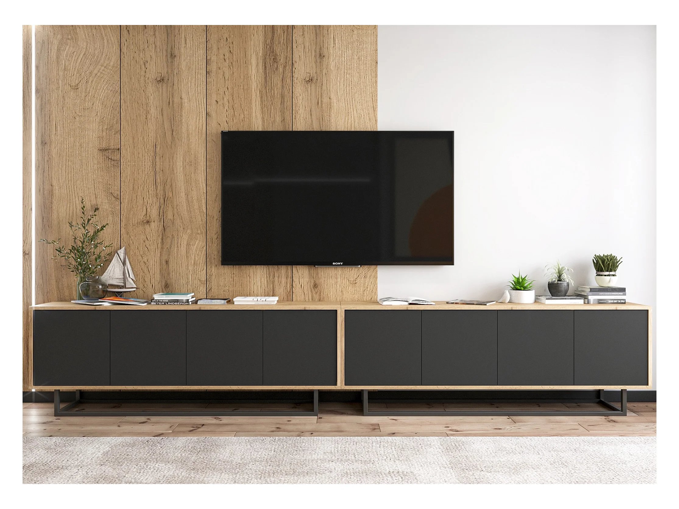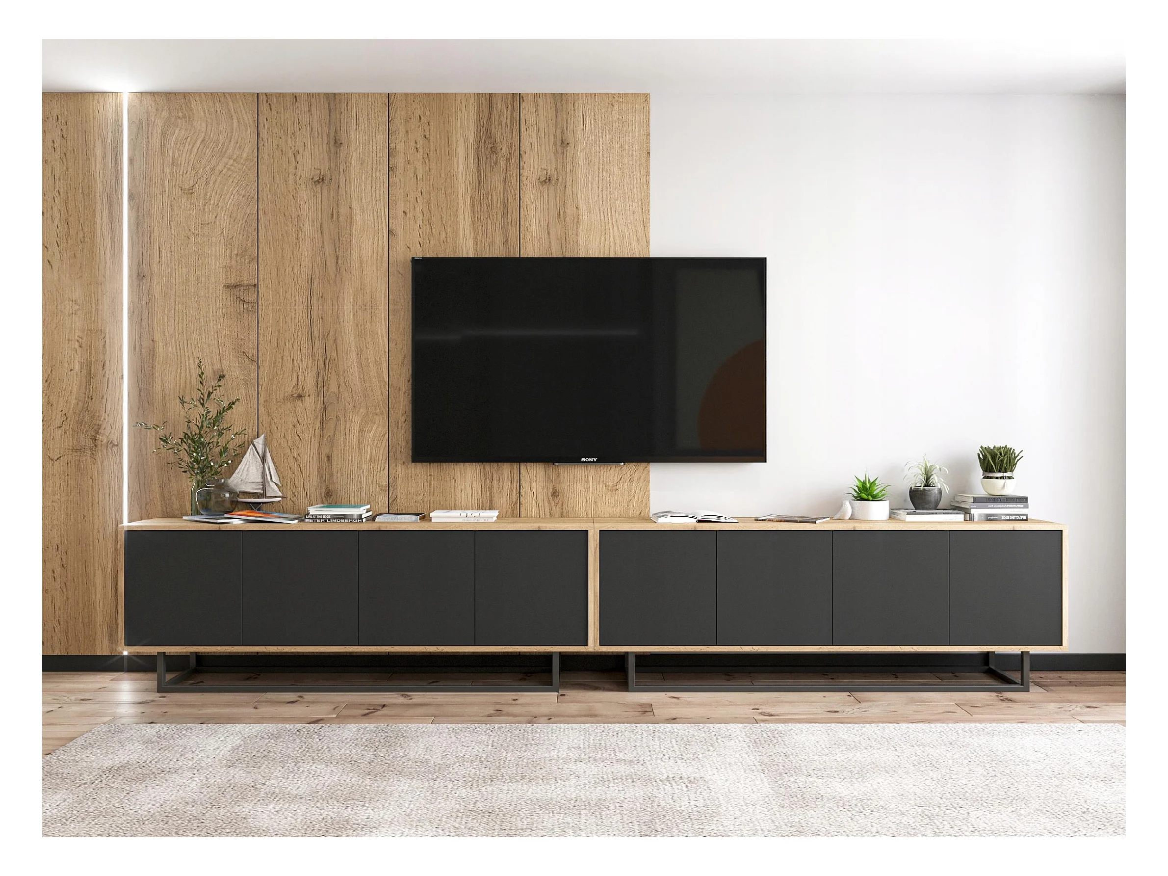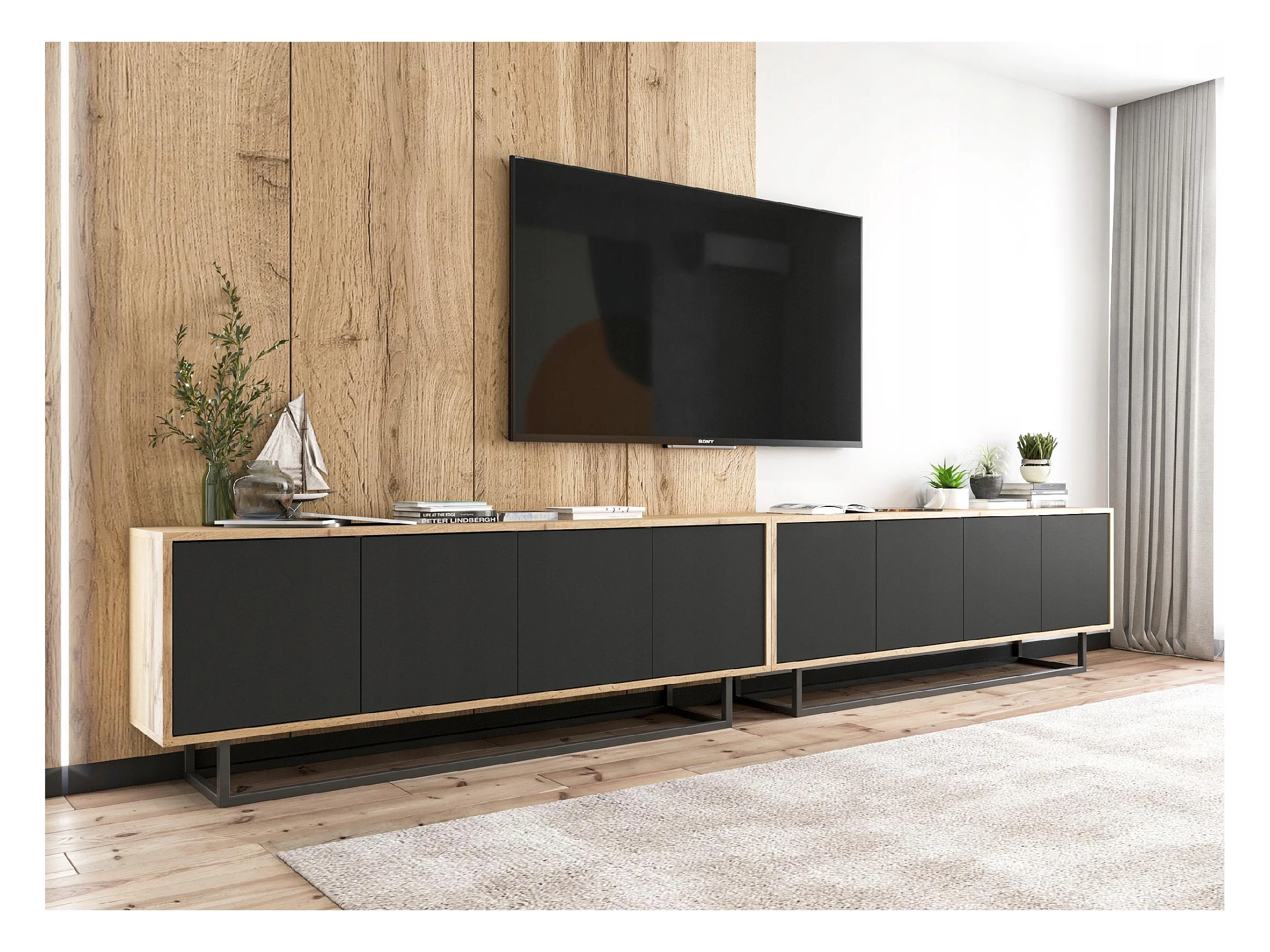 Meuble TV avec 8 portes - carcasse chêne wotan façades noir mat - 300 cm, cadre métallique