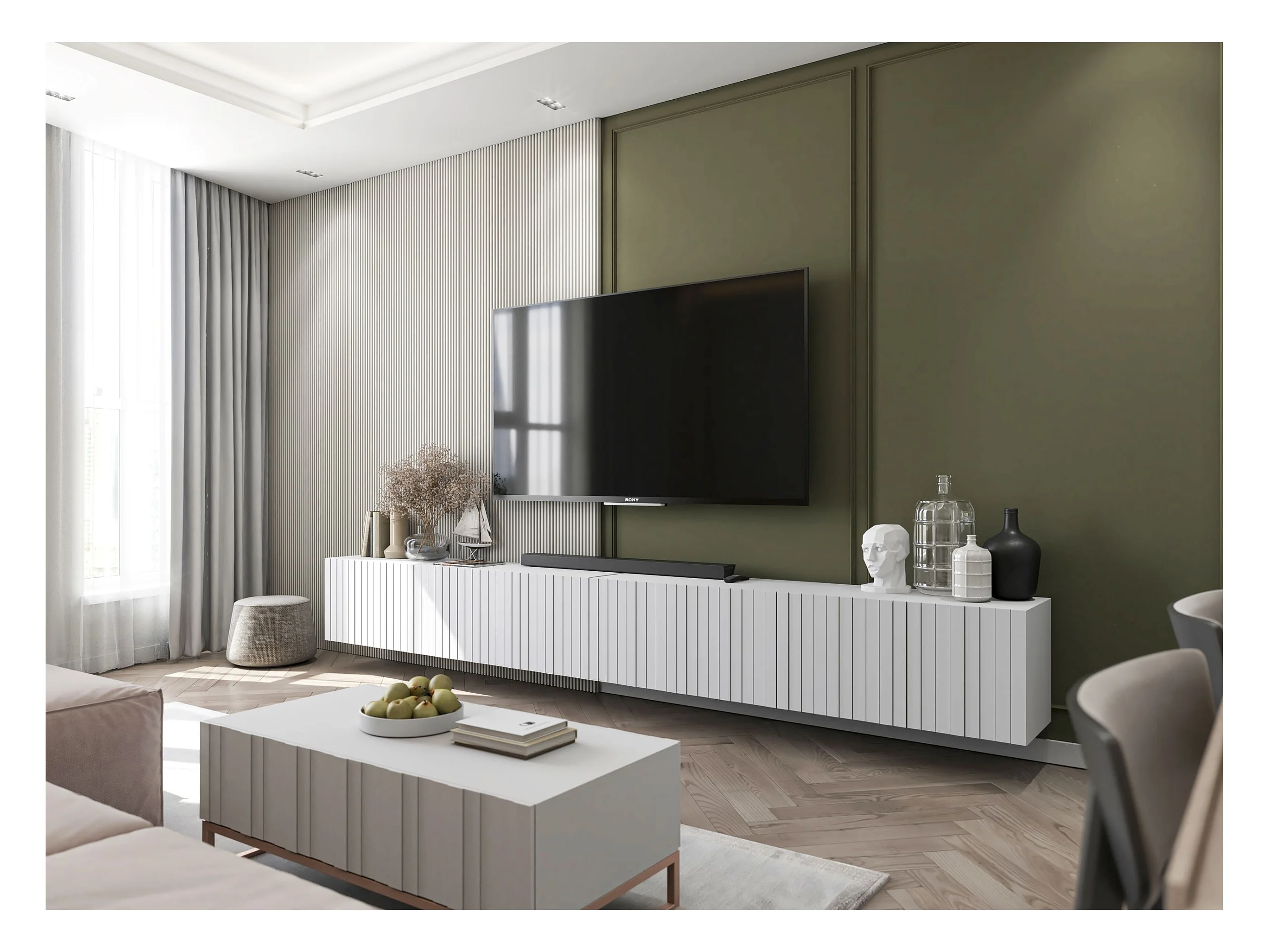 Meuble TV avec 8 portes - Corps Blanc mat, façades rainurées Blanc mat - 300 cm
