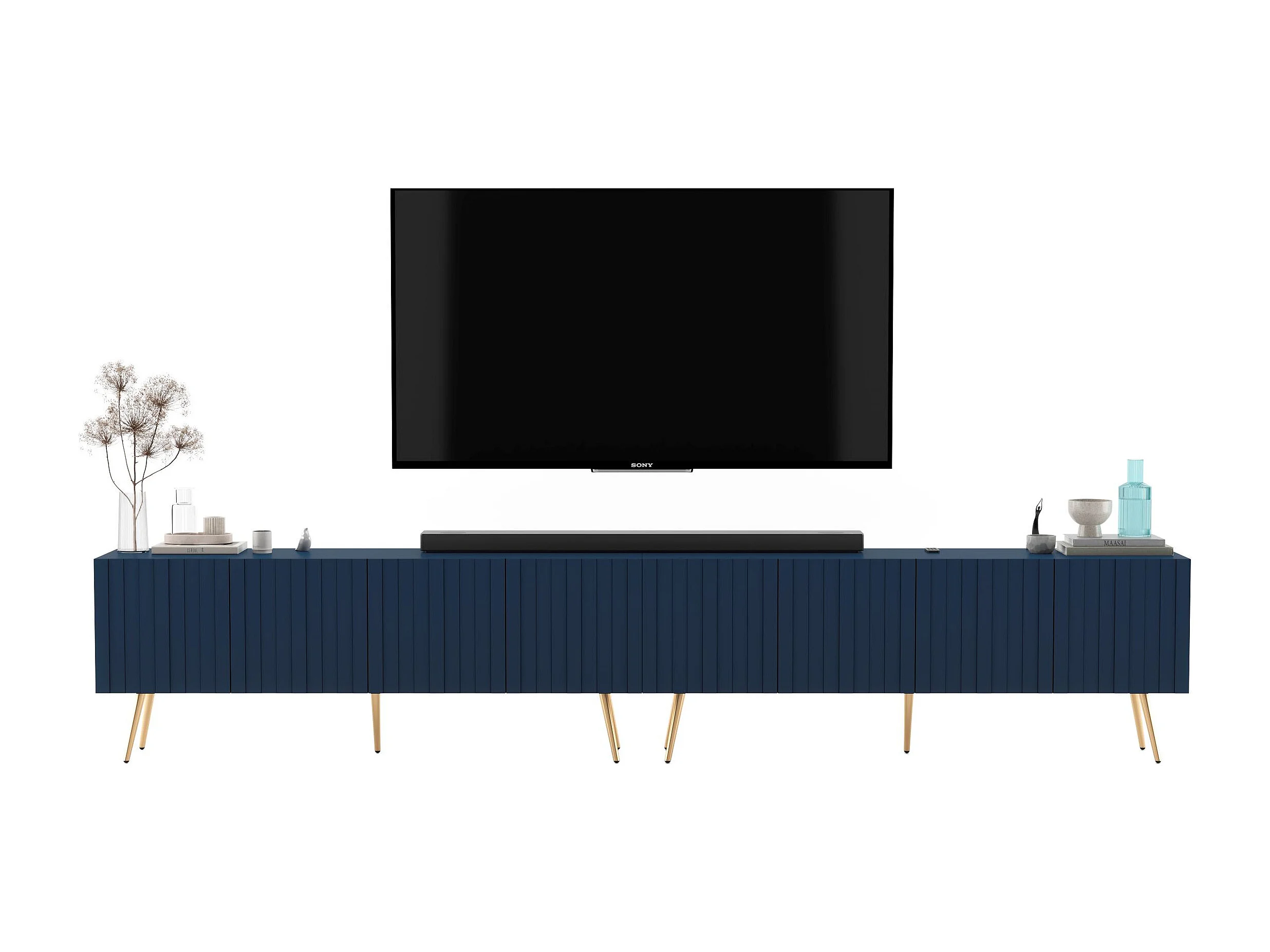 Meuble TV avec 8 portes - Corps bleu marine mat, façades rainurées bleu marine mat - 300 cm, pieds noirs