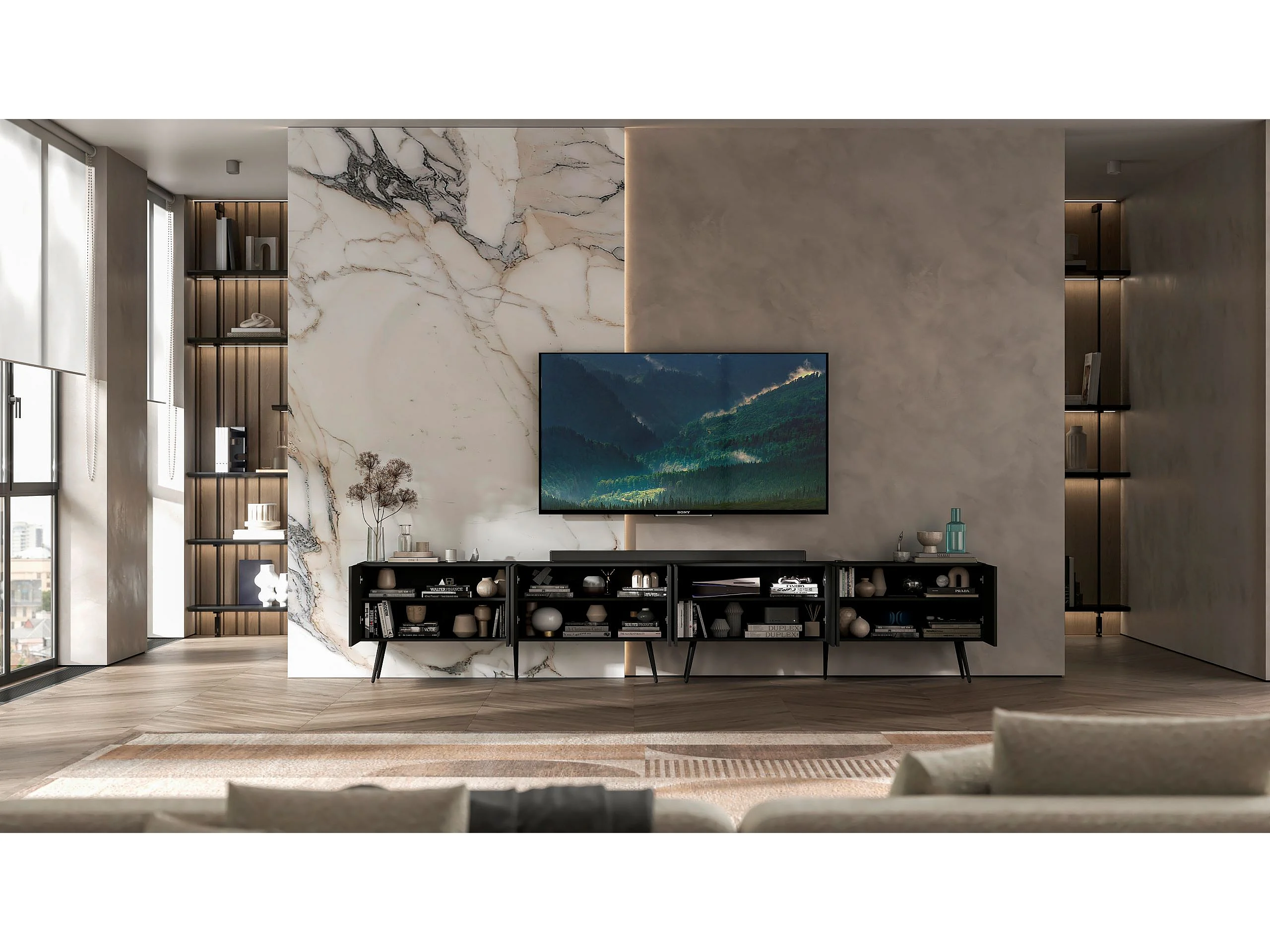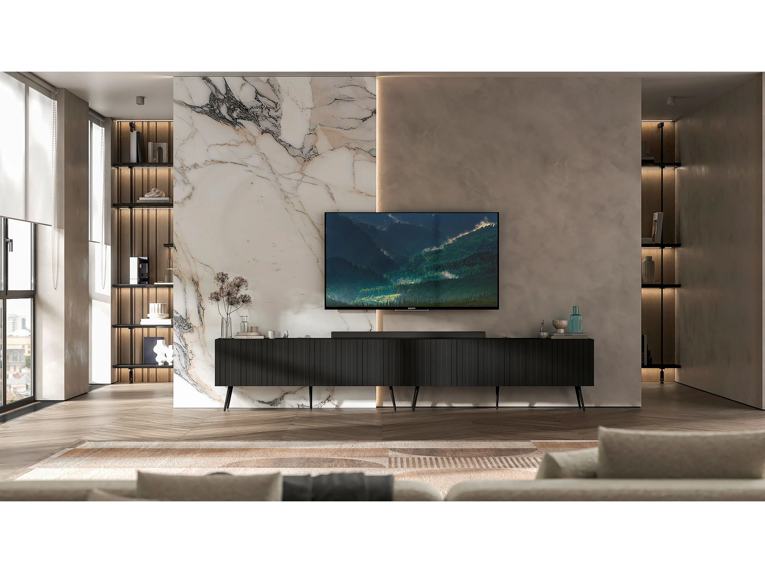Meuble TV avec 8 portes - Corps Noir mat, façades rainurées Noir mat - 300 cm, pieds noirs