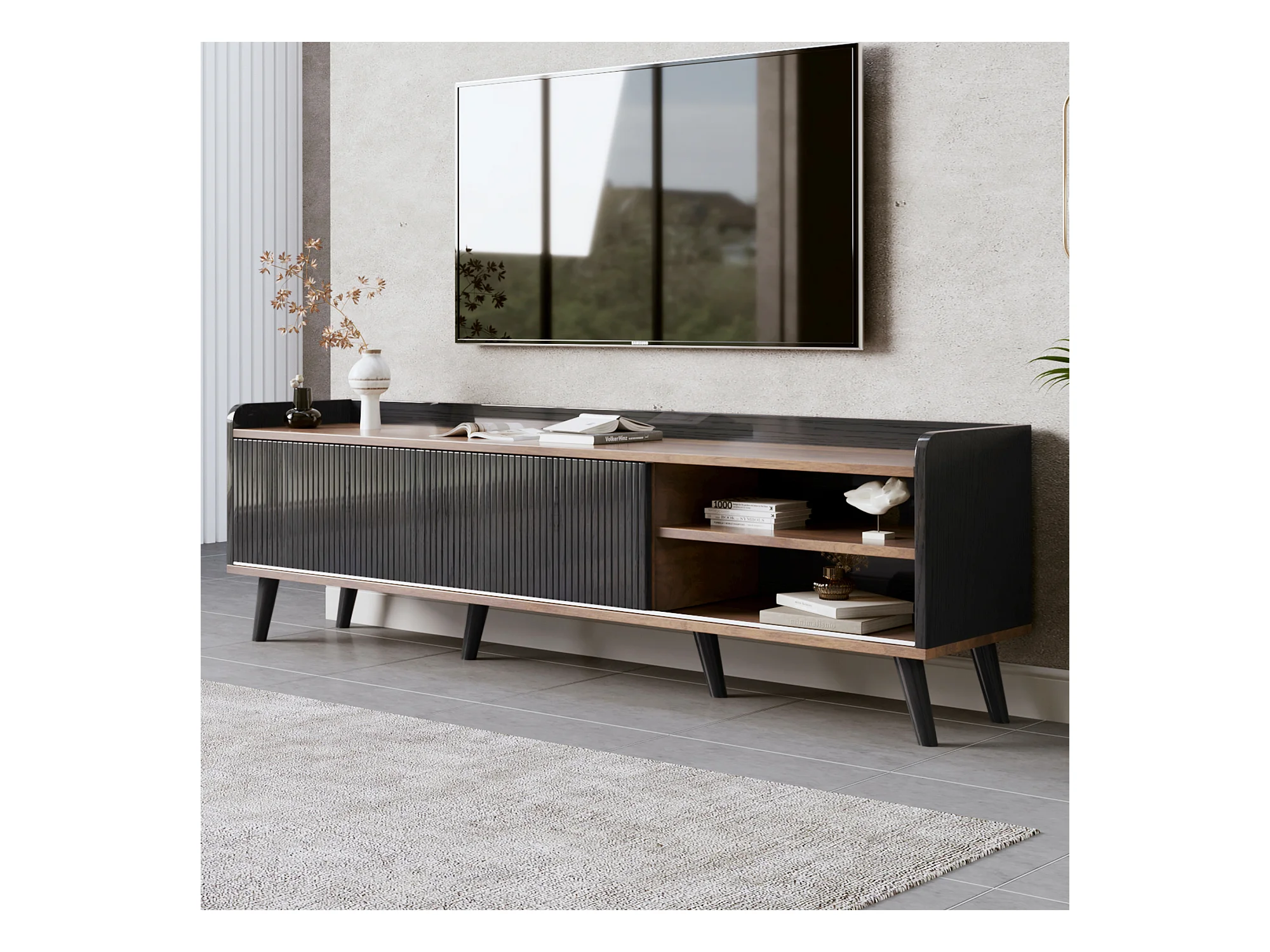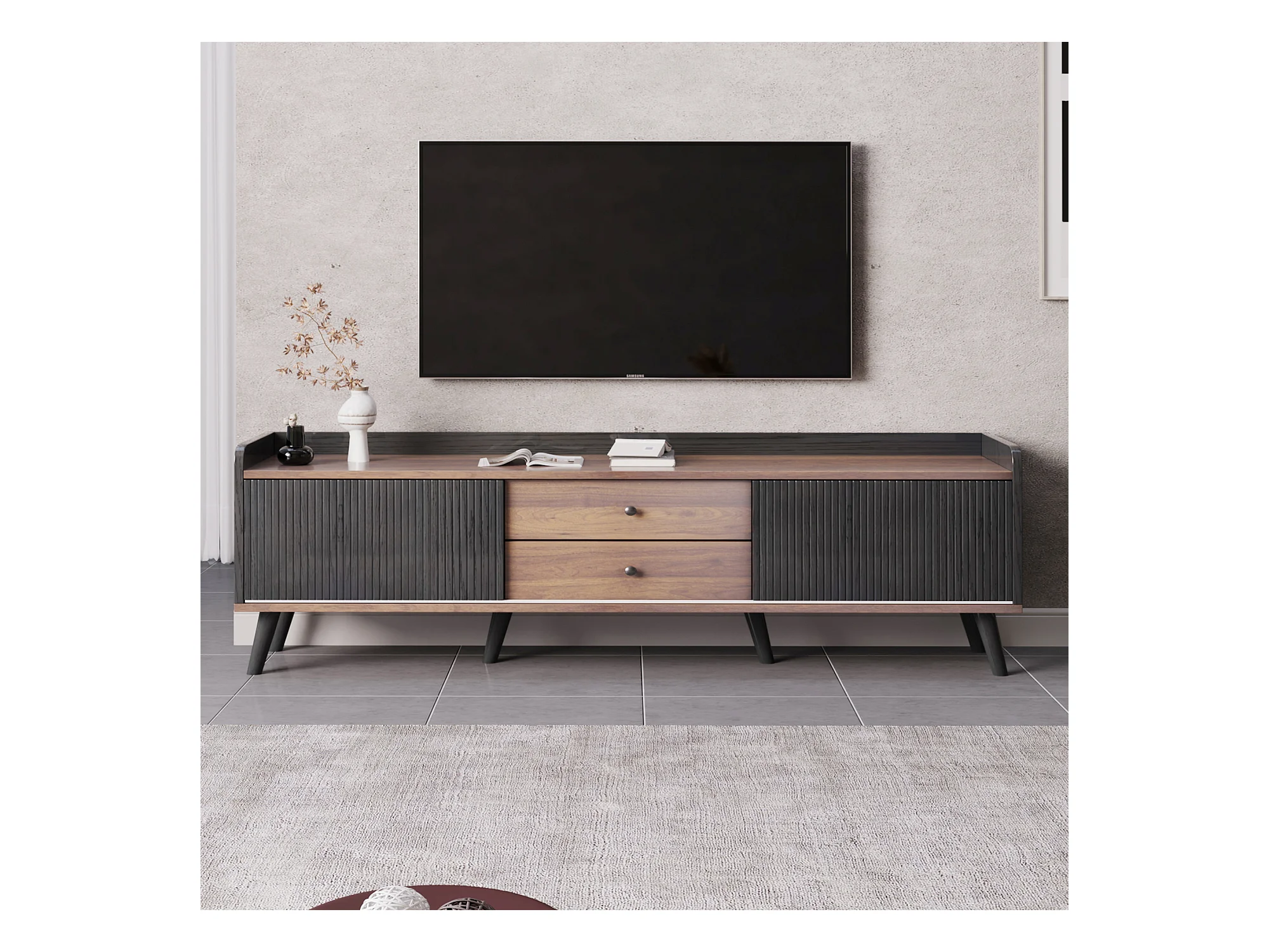 Meuble TV avec deux tiroirs, design noir et bois, avec portes coulissantes et espace de rangement, (160x40x58cm)