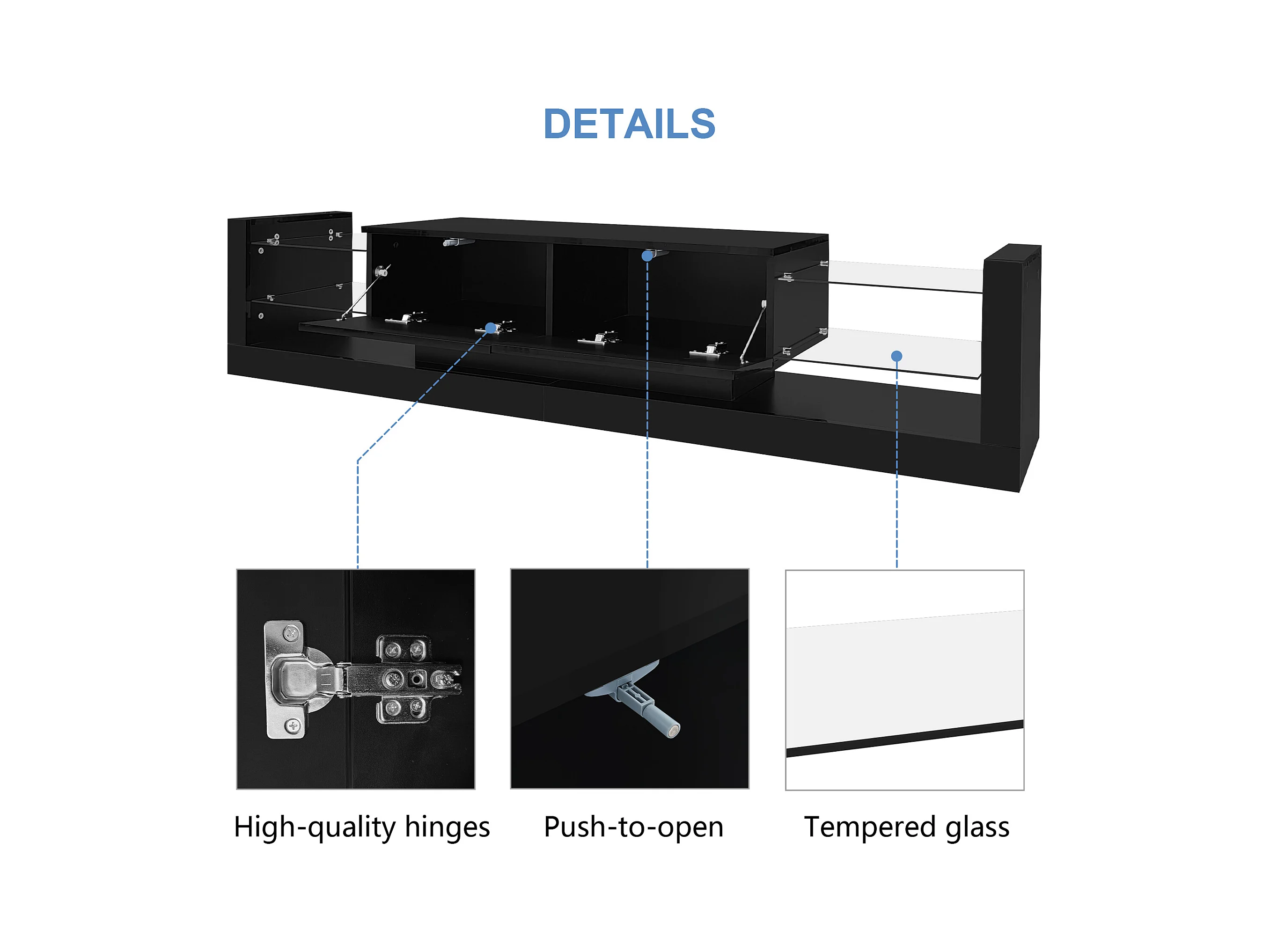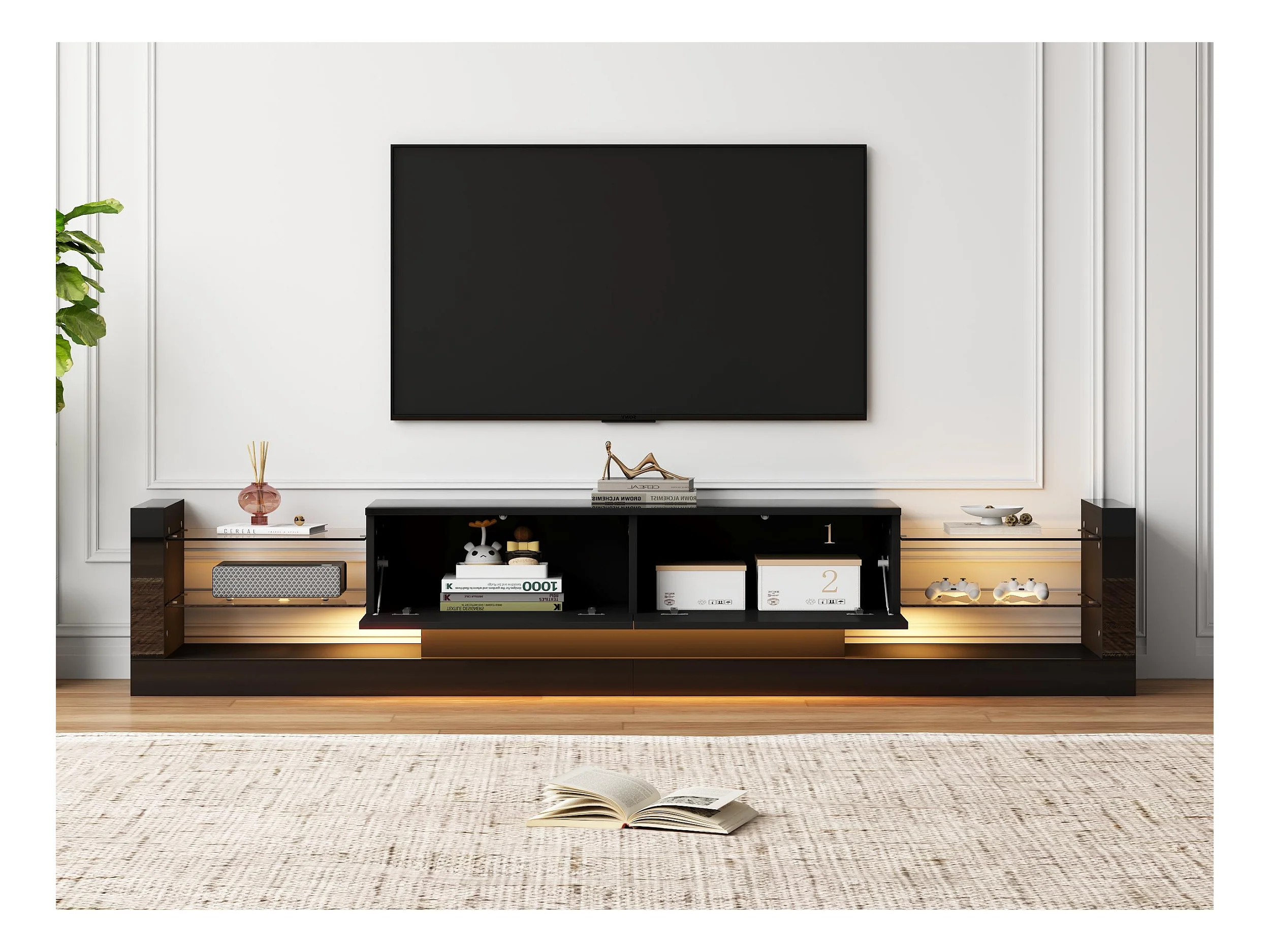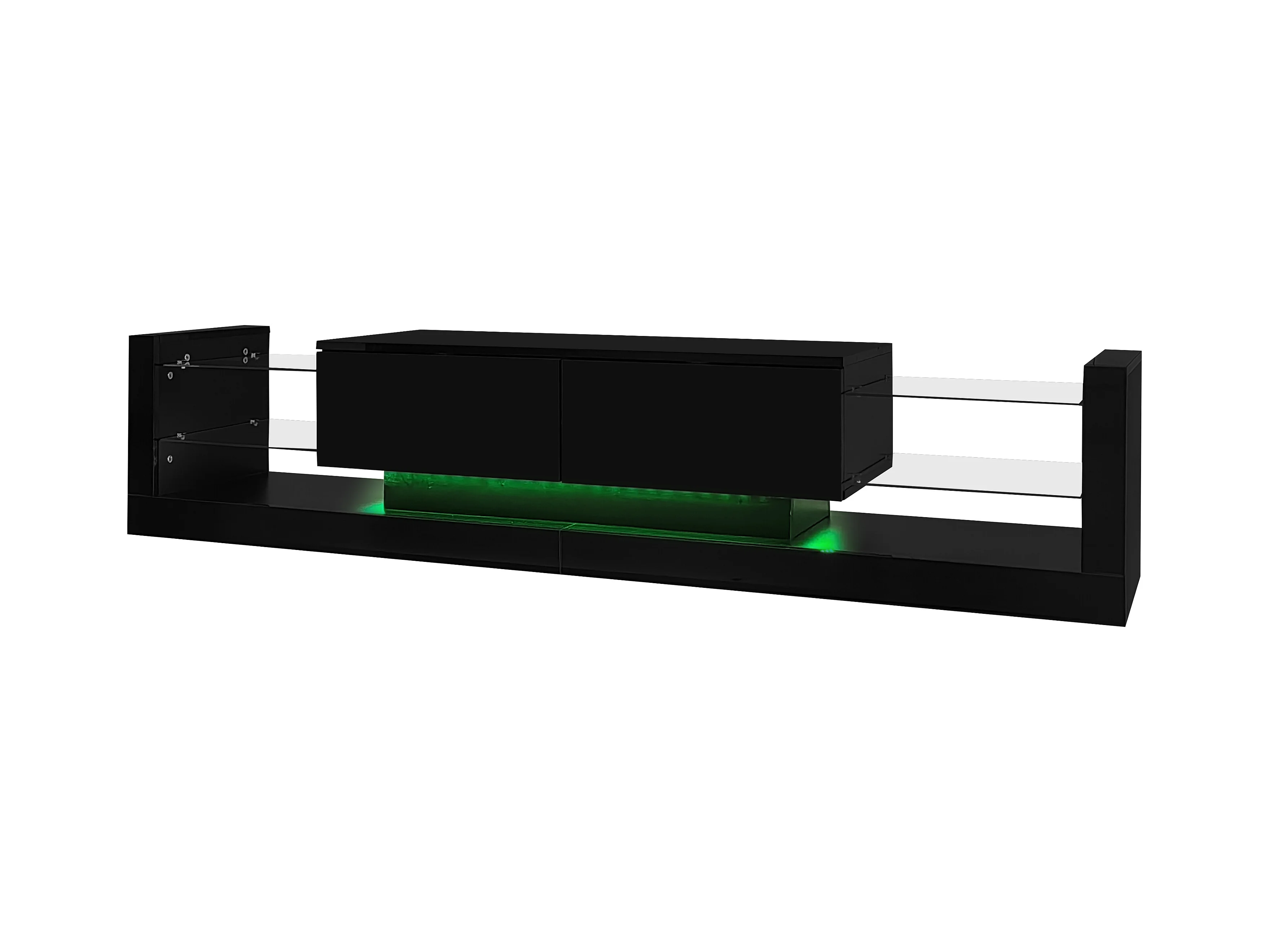 Meuble TV avec LED - 2 compartiments abattants et étagères en verre - Noir