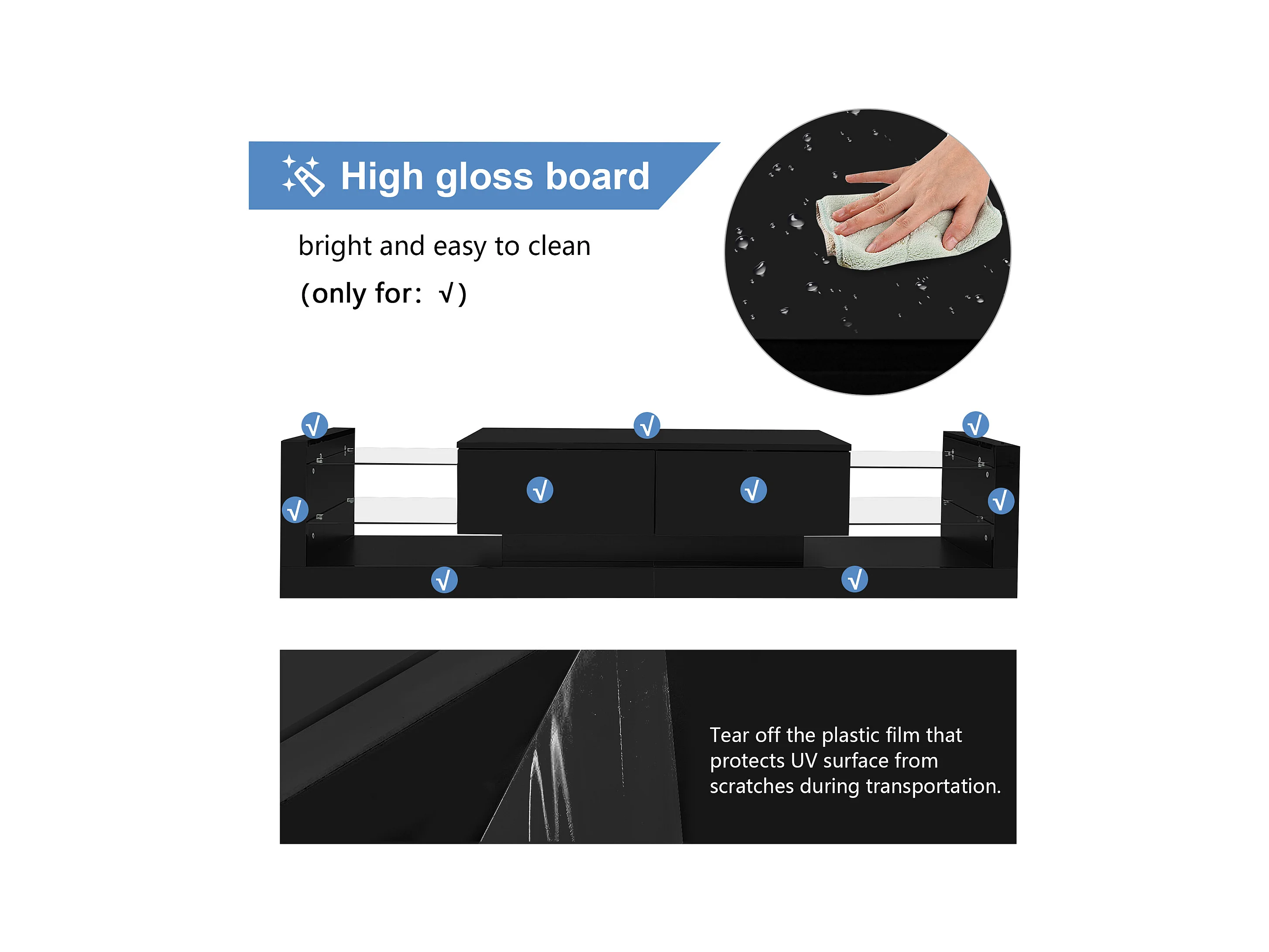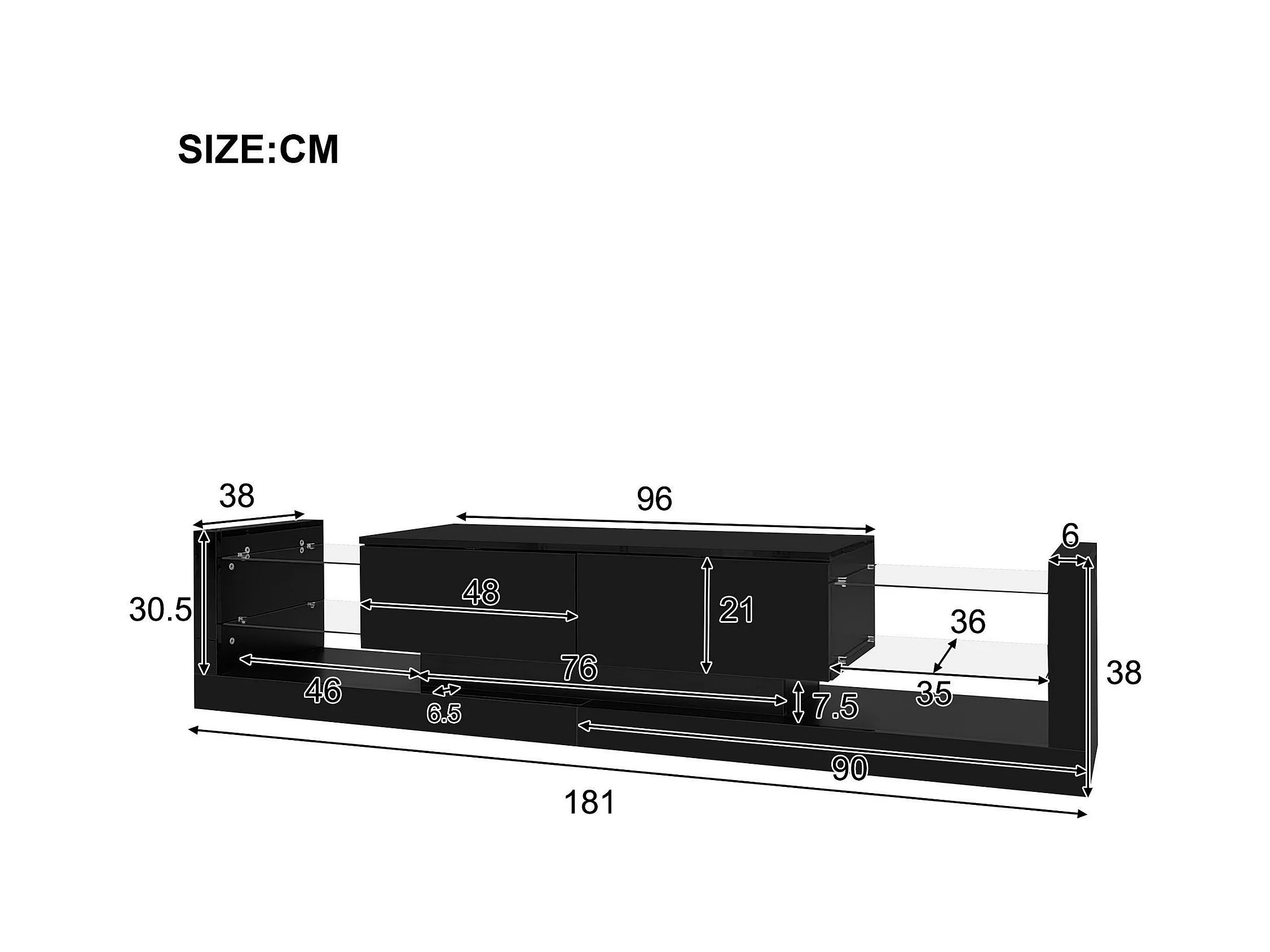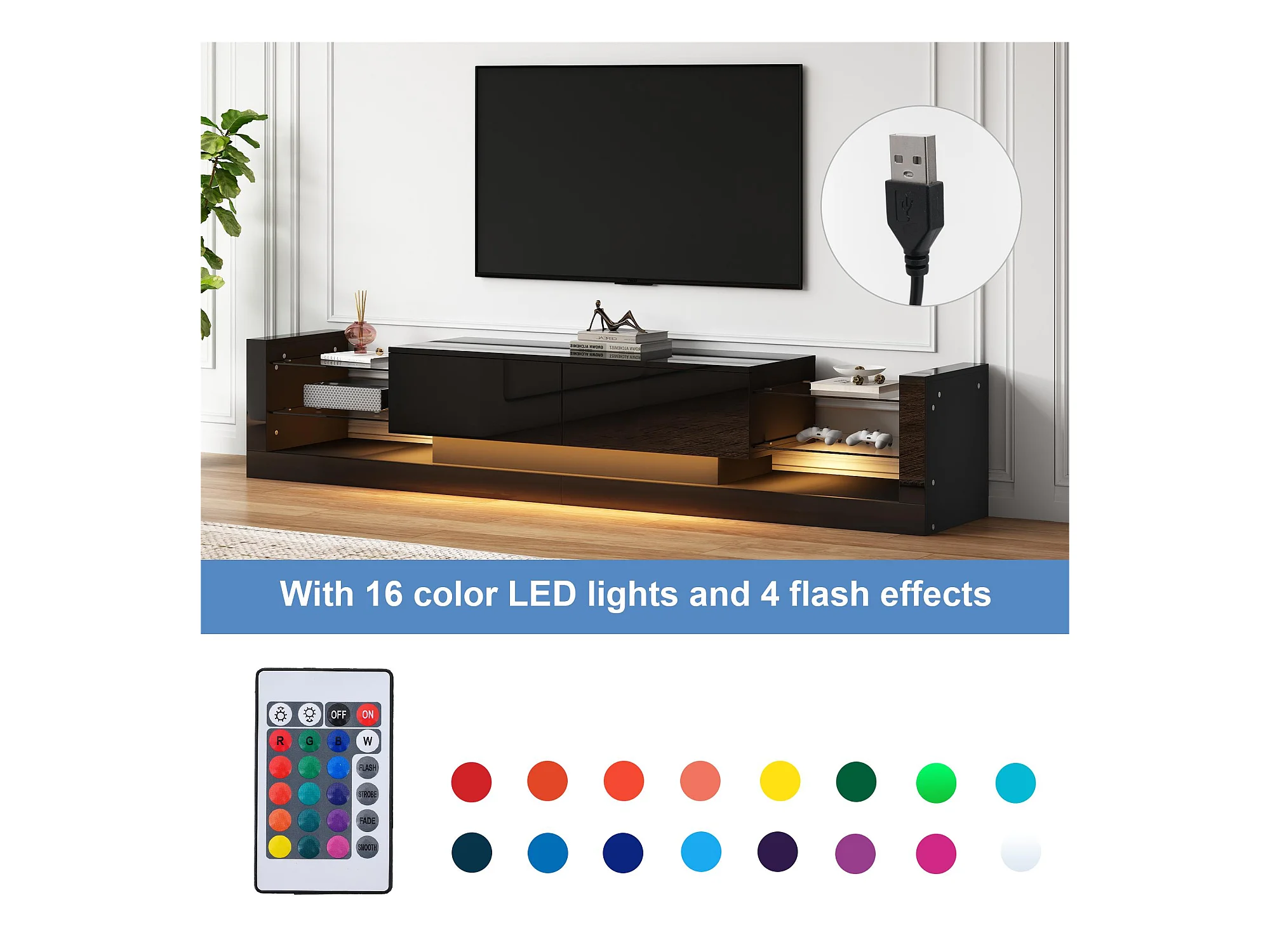 Meuble TV avec LED - 2 compartiments abattants et étagères en verre - Noir