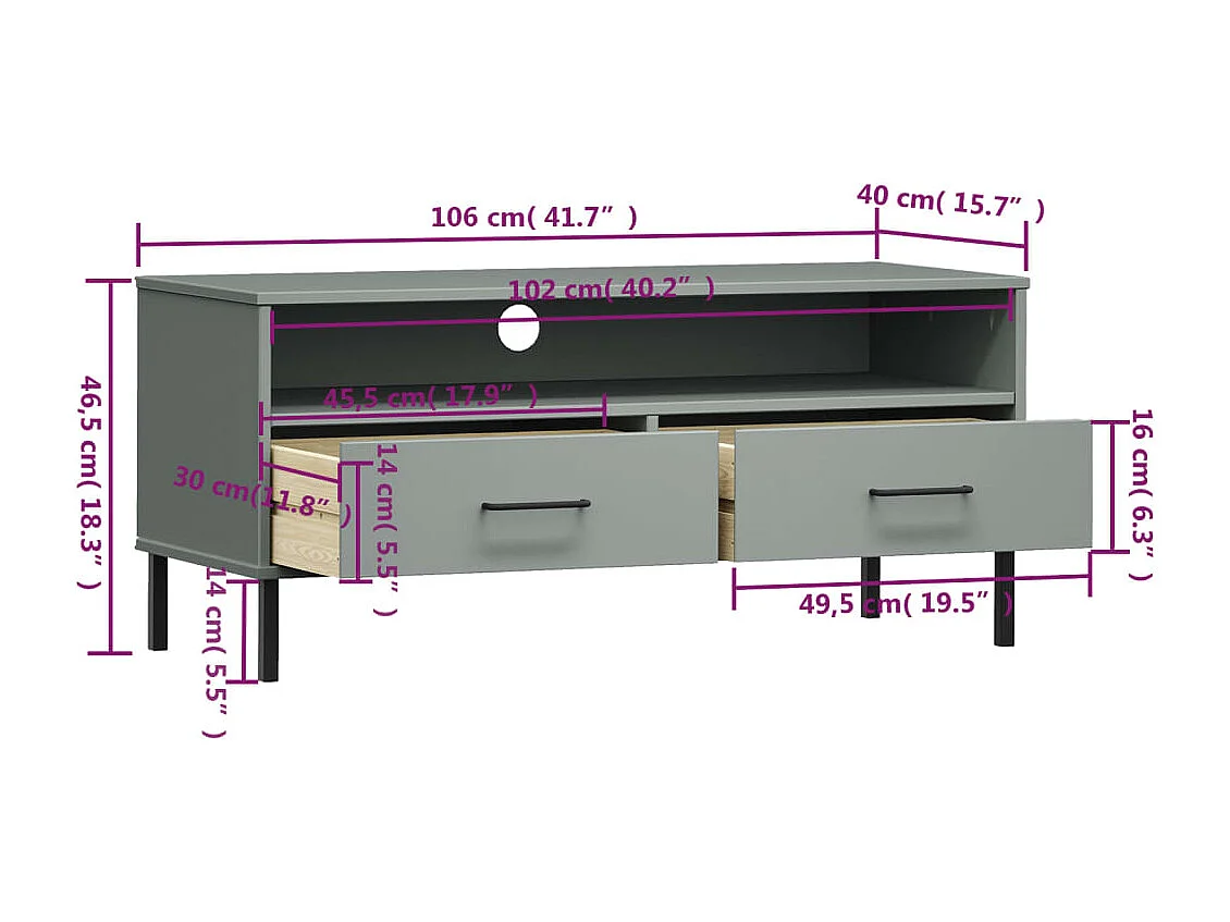 Sylna Meuble TV VIGO gris 106x40x40 cm bois massif de pin
