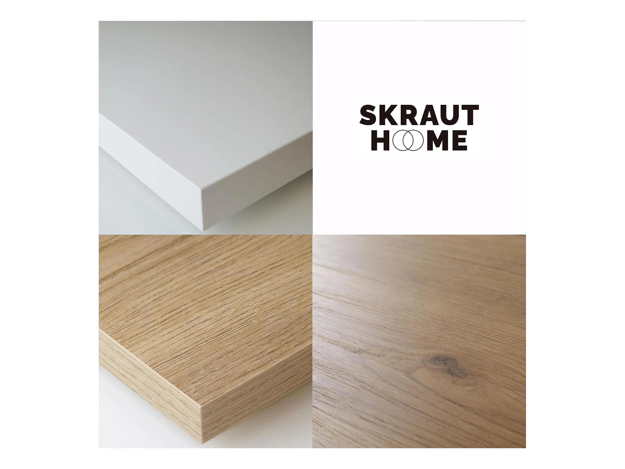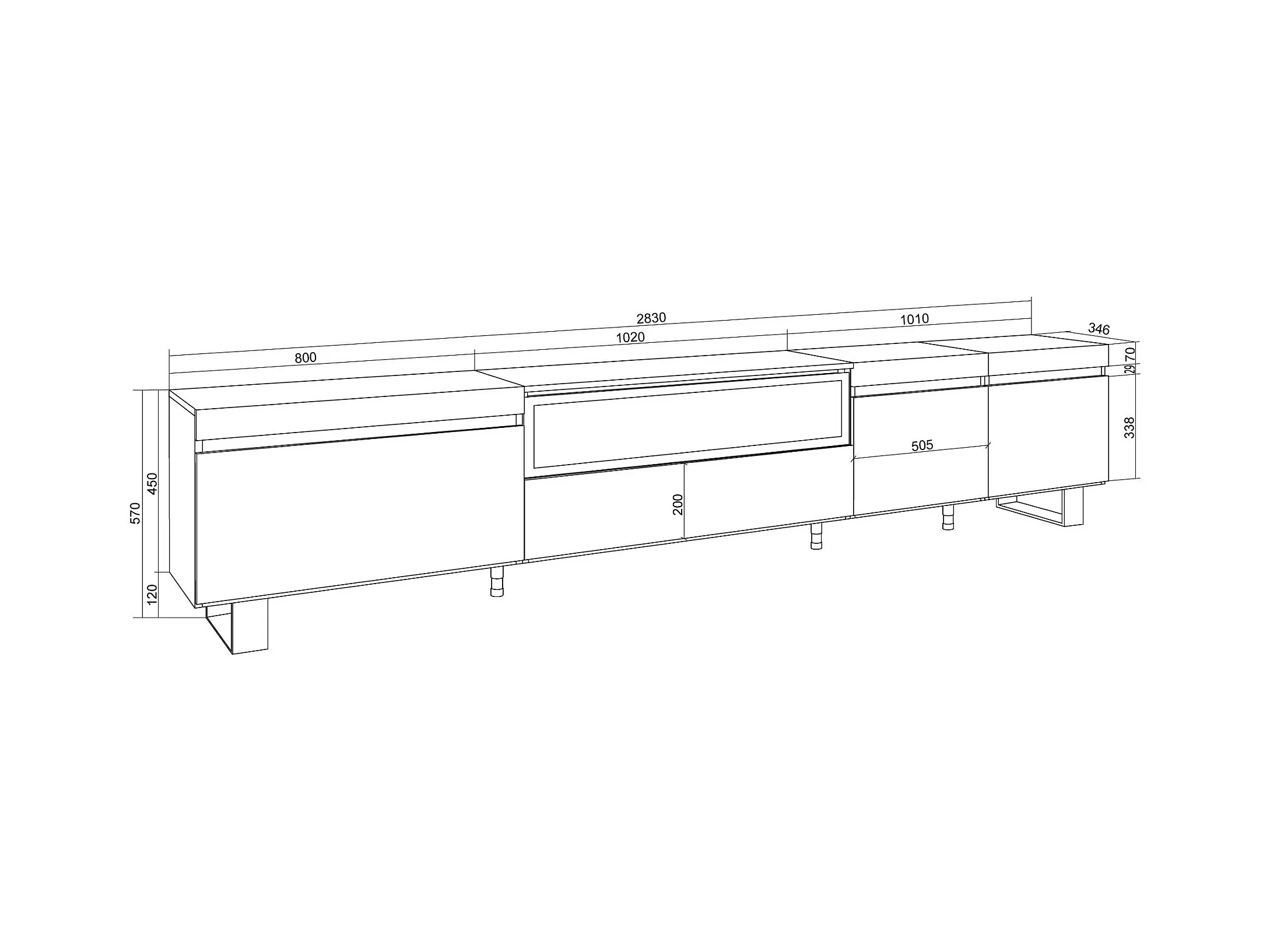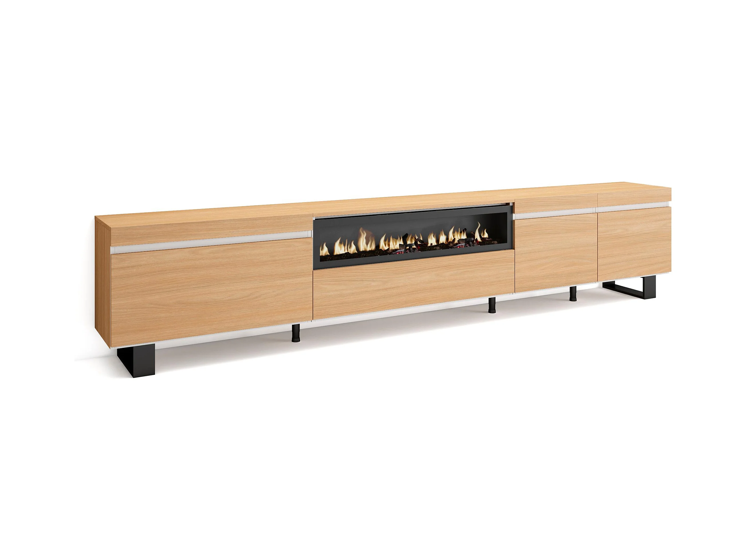 Meuble TV, Banc Télé, 288x35x57 cm, TV grand format, Cheminée électrique, Design industriel, Chêne soft et blanc